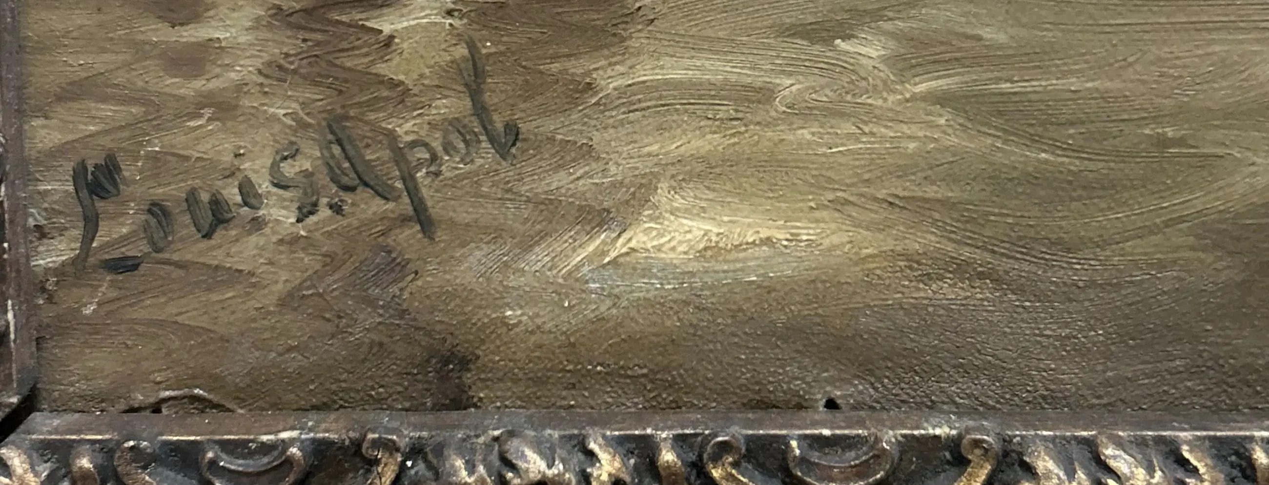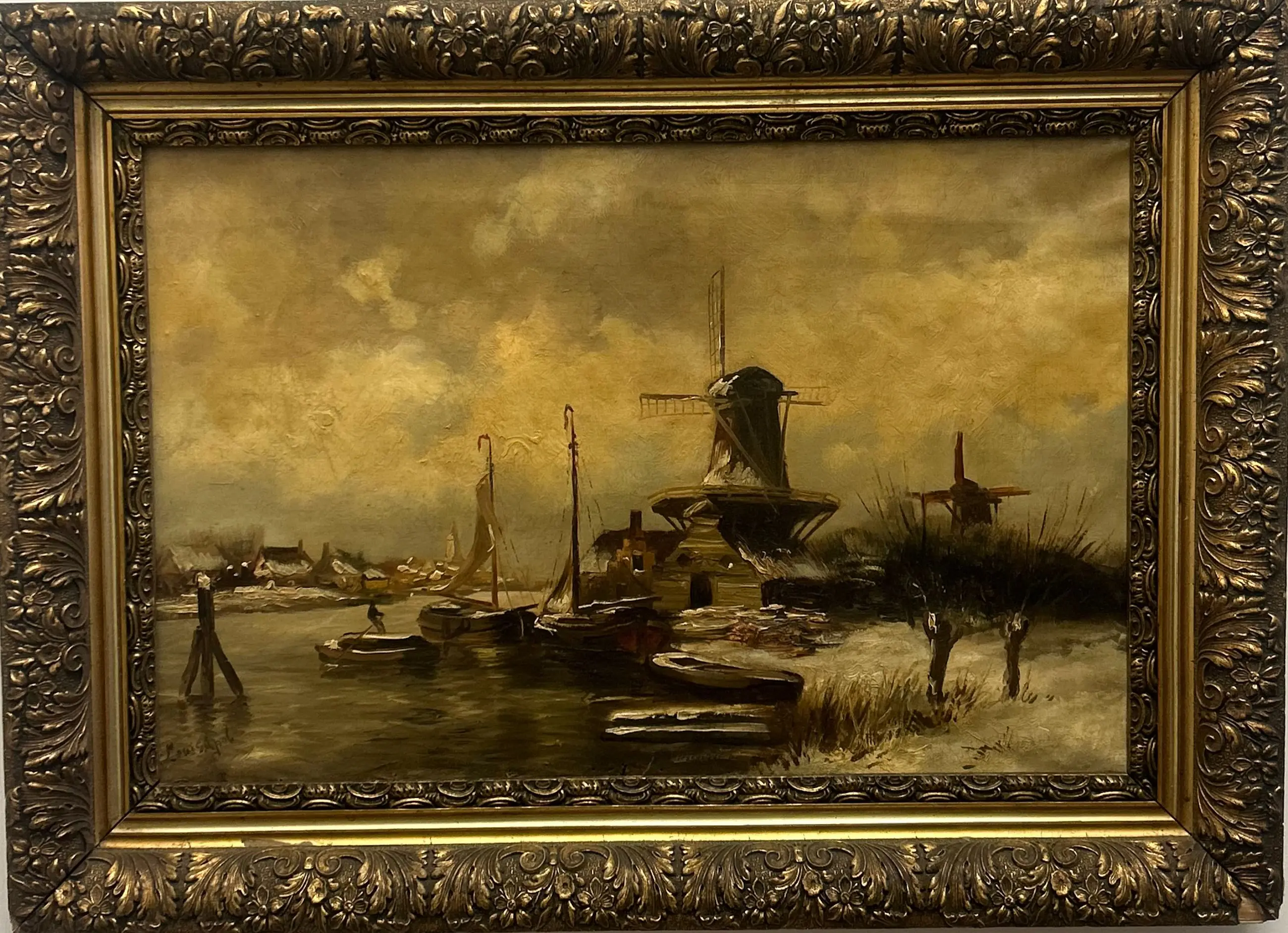 Schilderij op canvas van Louis van de Pol – In karakteristieke stijl Mooi werk van Louis van de Pol, uitgevoerd in zijn herkenbare stijl. Het schilderij is vervaardigd op canvas en geplaatst in een mooie antieke, bijpassende lijst. Het werk verkeert in goede staat; rechtsonder is het canvas iets uitgezet, wat echter geen afbreuk doet aan het geheel. Zie foto’s voor een verdere indruk van het geheel en de staat van het werk.