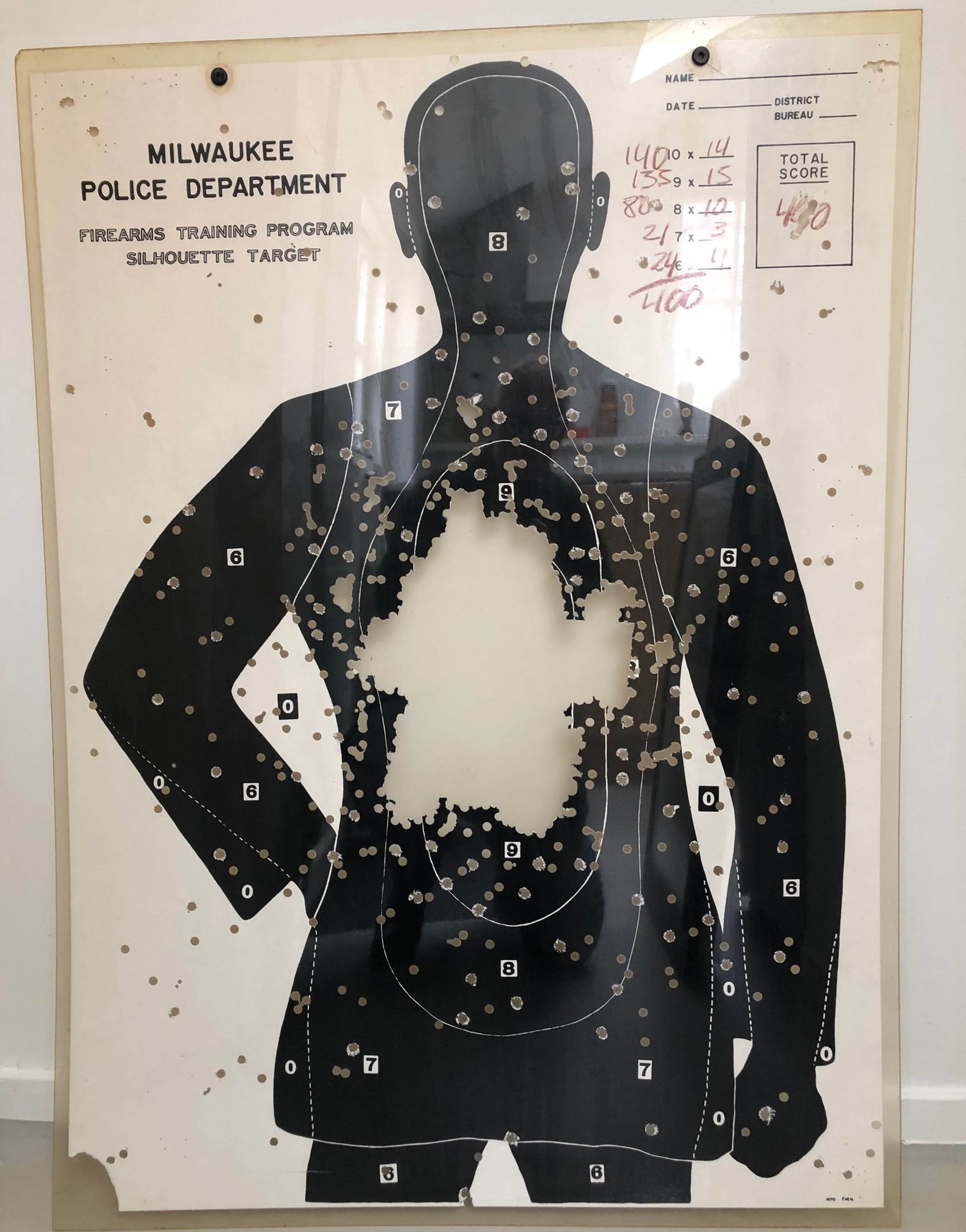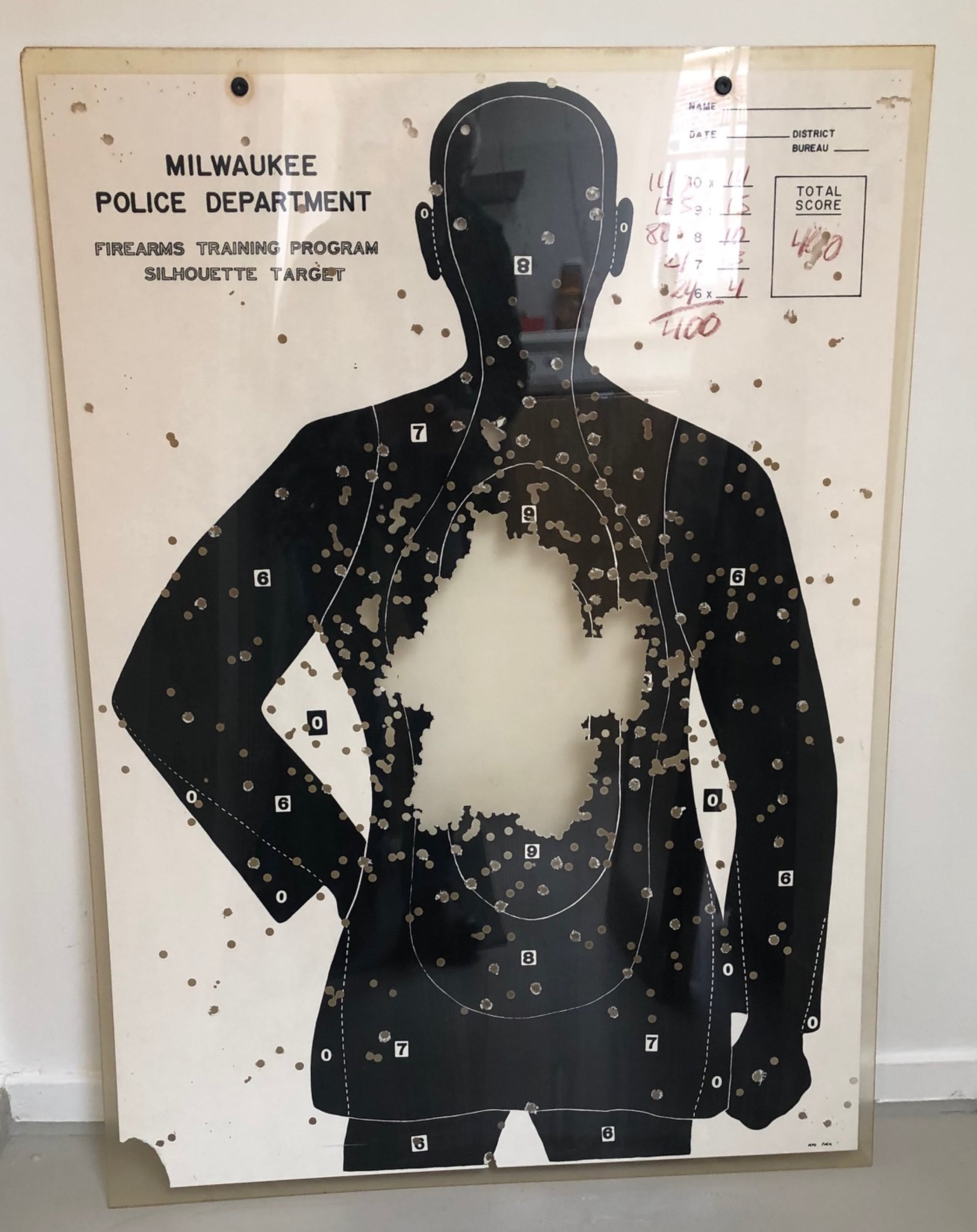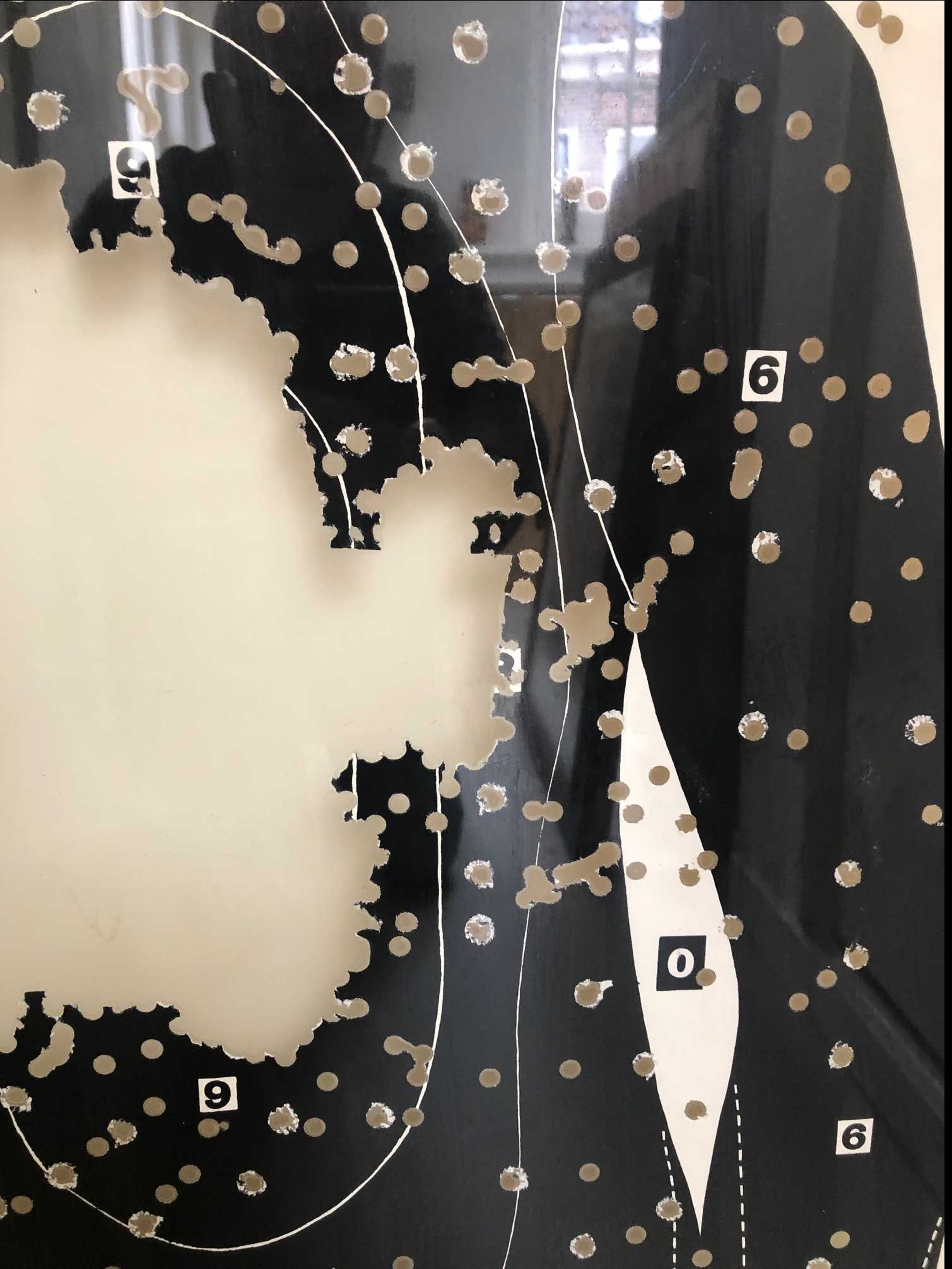 Leuk werk uit de jaren '70 van de bekende cineast, schrijver en kunstenaar Louis van Gasteren.Ooit van de kunstenaar zelf gekregen. Bijzonder werk: hij heeft een aantal "oefendoelen" met een boor bewerkt en daarna in kunststof gegoten.