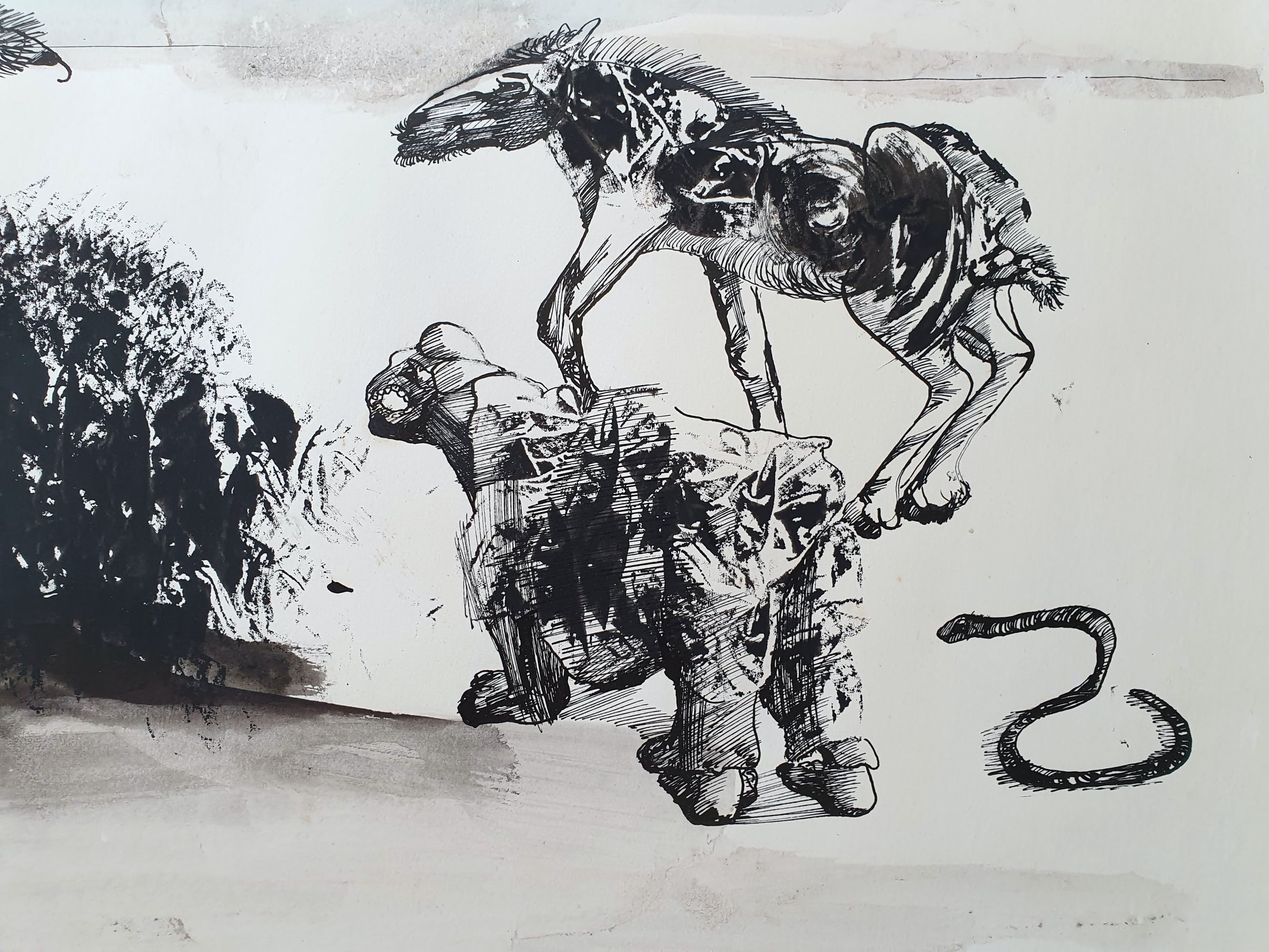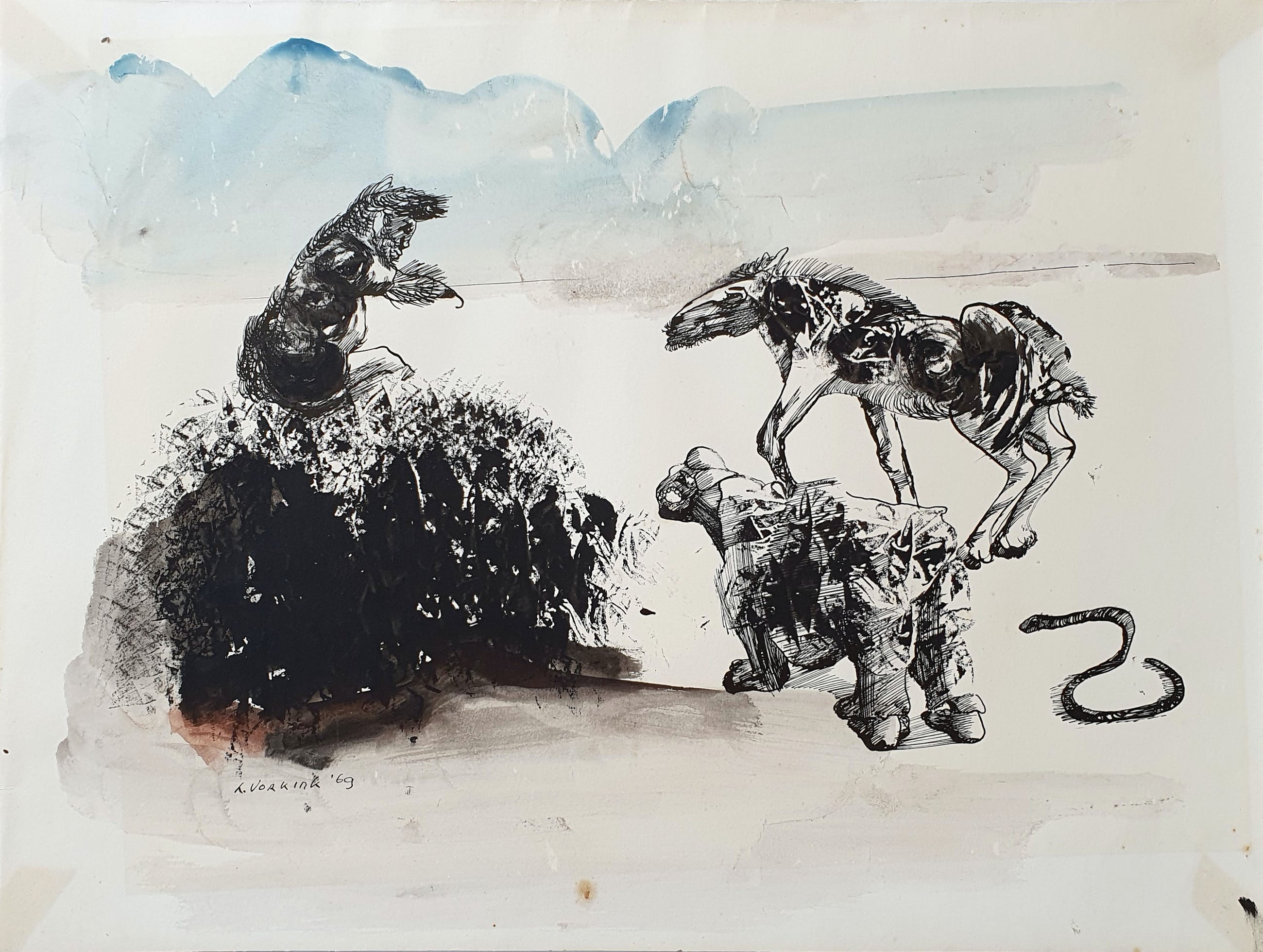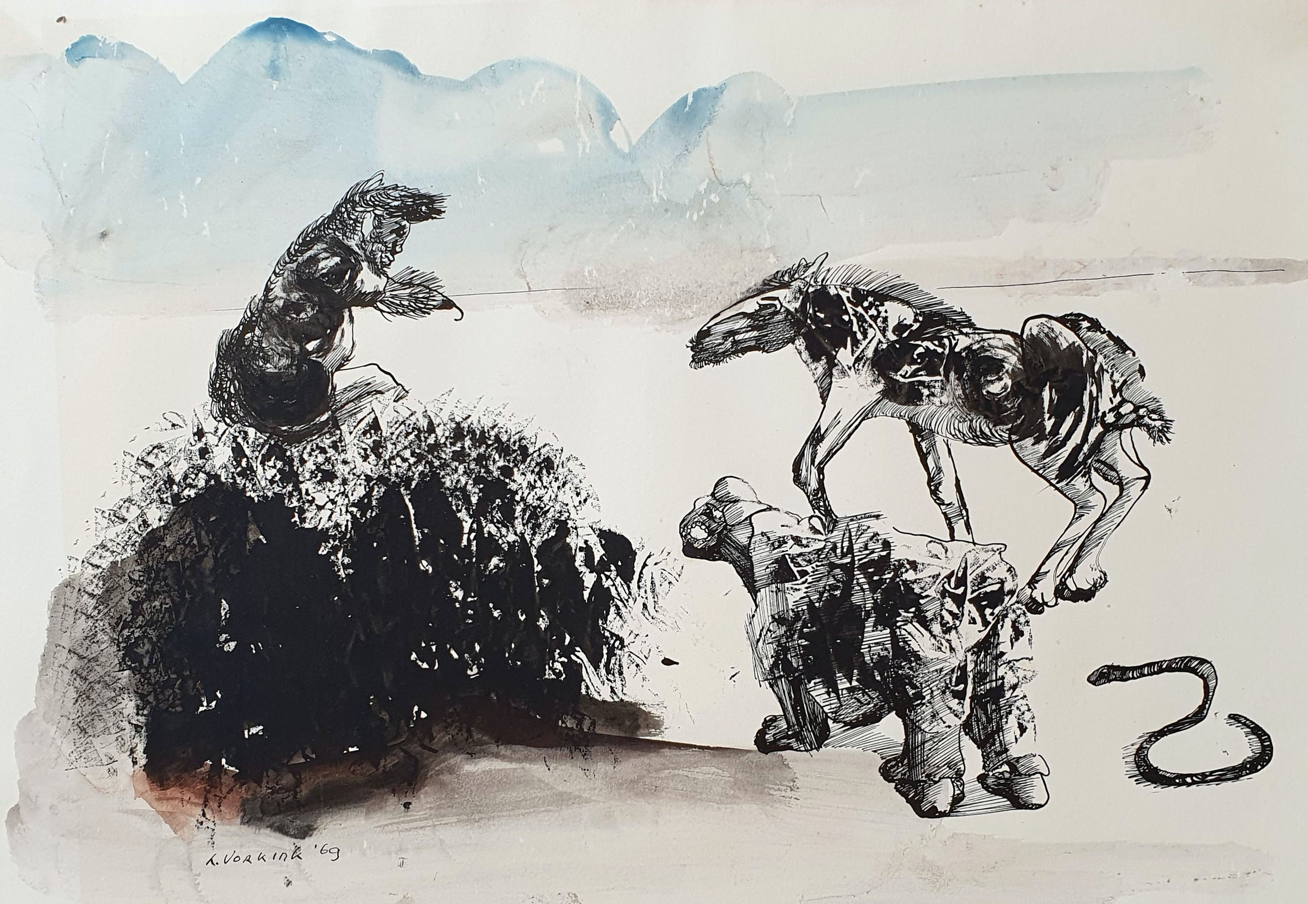 Pentekening/ aquarel op papier van Louis Vorkink uit 1969. Het werk is linksonder met de hand gesigneerd door de kunstenaar.