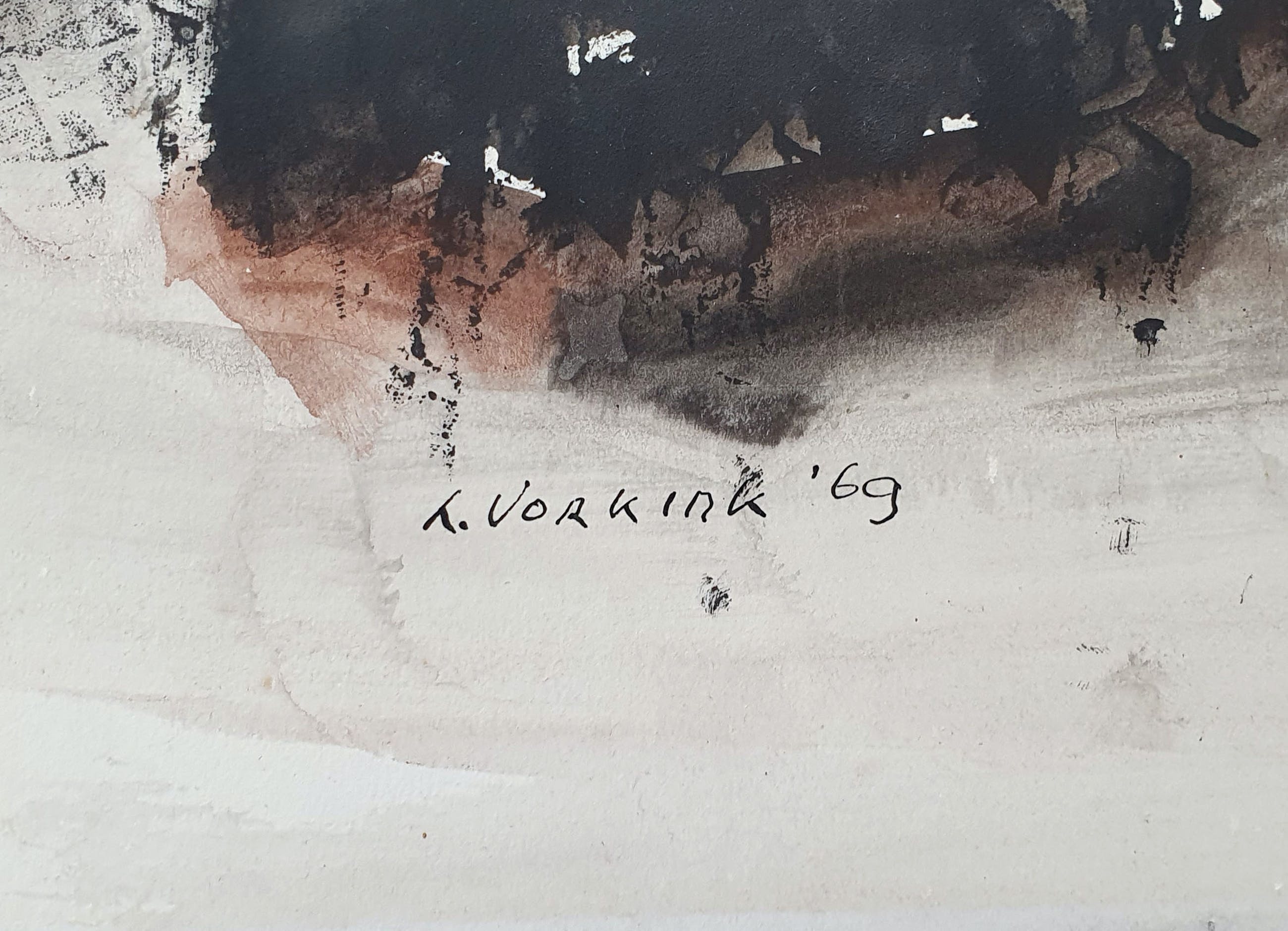 Kunstenaar: Louis Vorkink Techniek: Gemengde techniek op papier Oplage: Unica Gesigneerd: Linksonder Ingelijst: Niet ingelijst Afmeting voorstelling (HxB): 34 x 45 cm Afmeting blad (HxB): 37 x 50 cm Conditie Werk: Wat verkleuring, taperesten op de achterkant van een eerdere inlijsting en wat foxing in de marge. Dit valt weg als het werk goed is ingelijst.