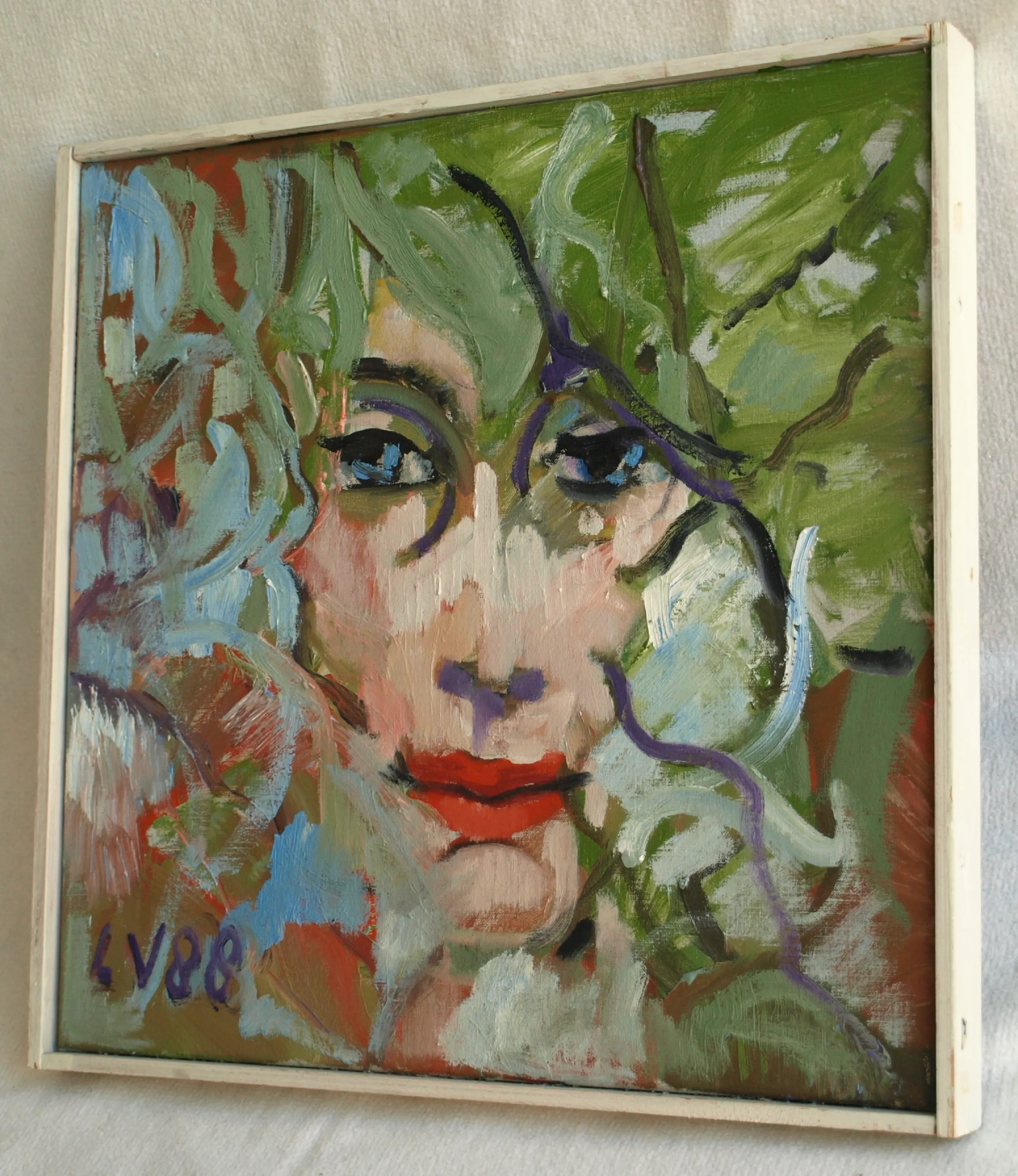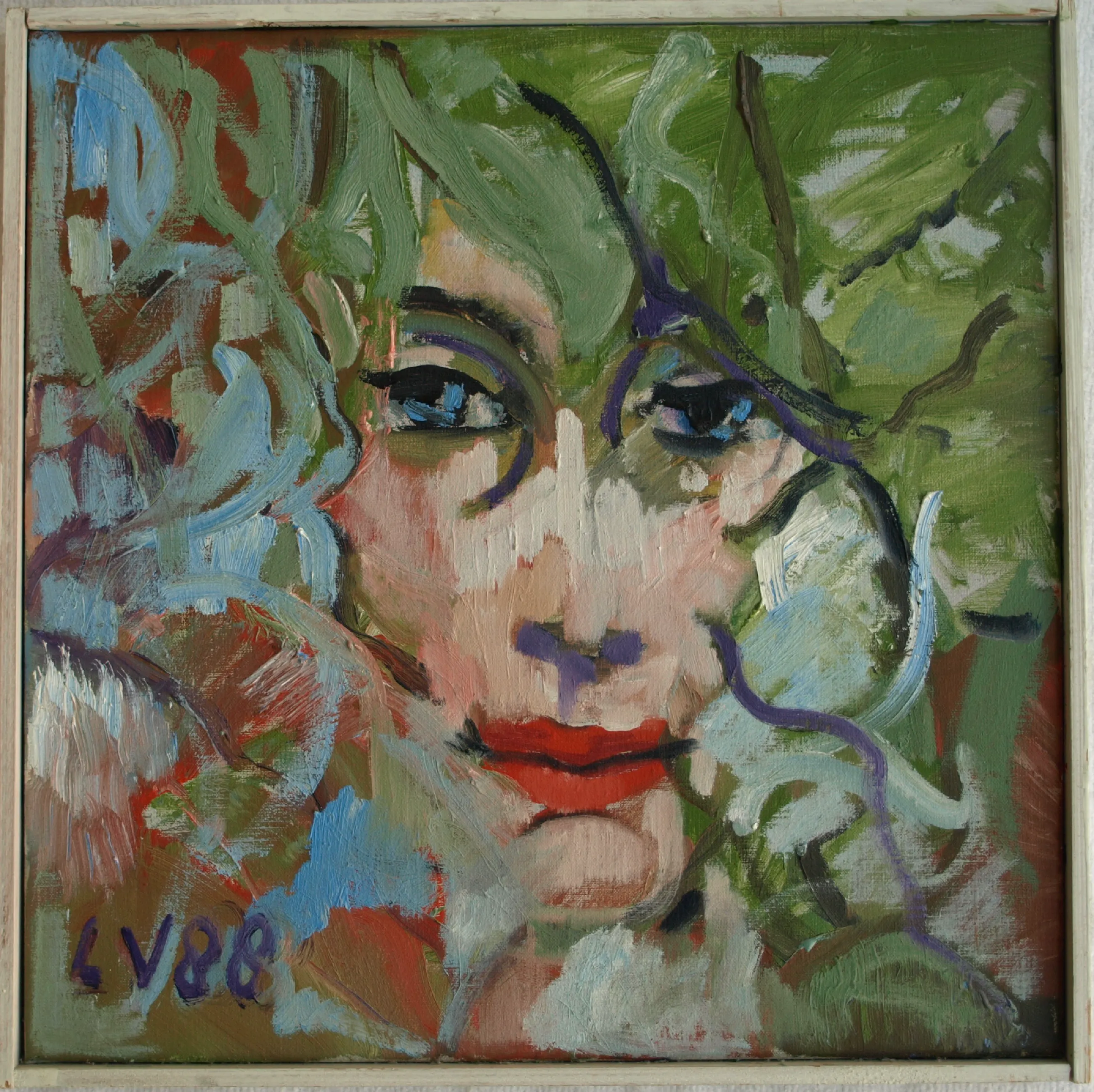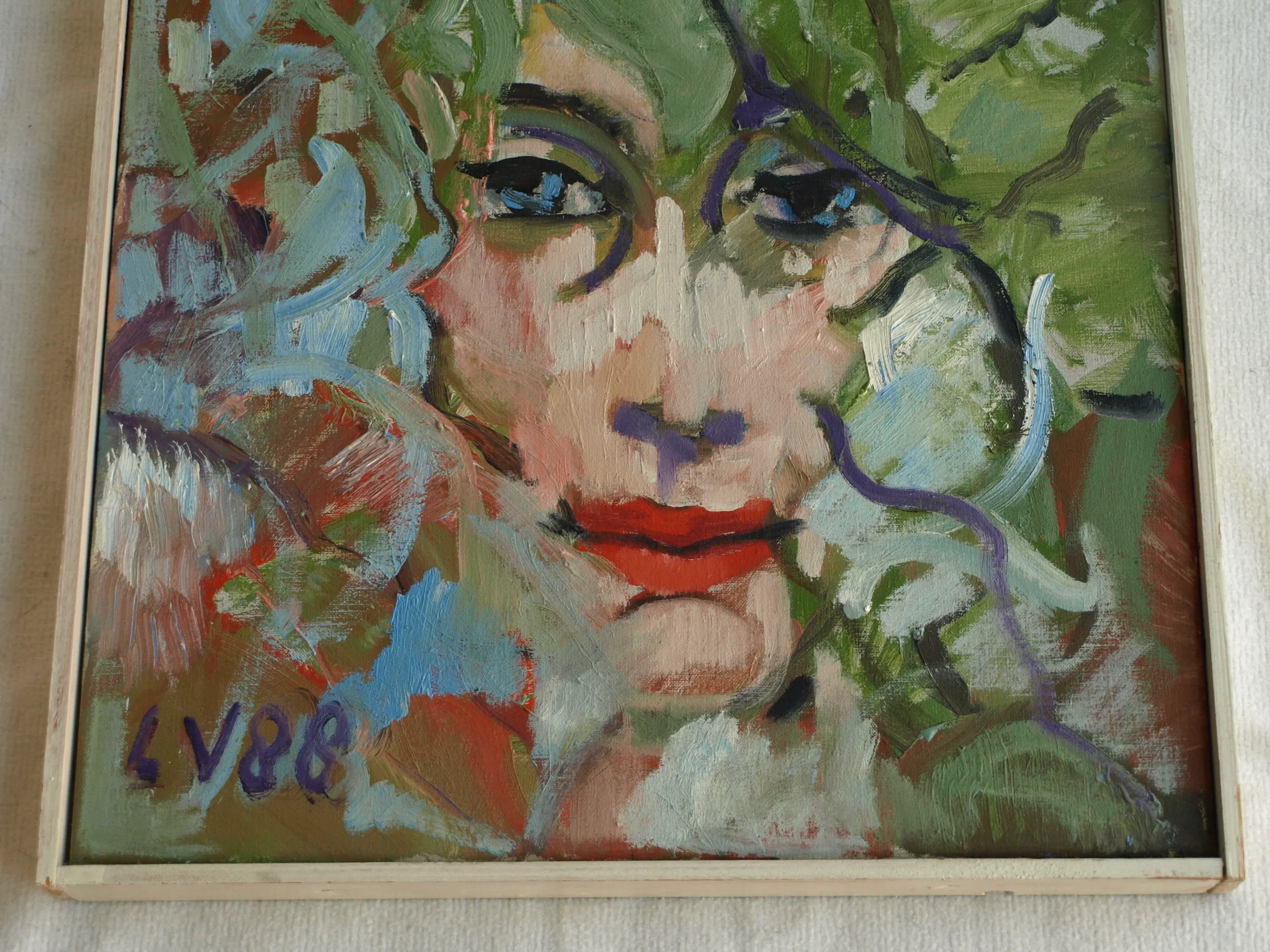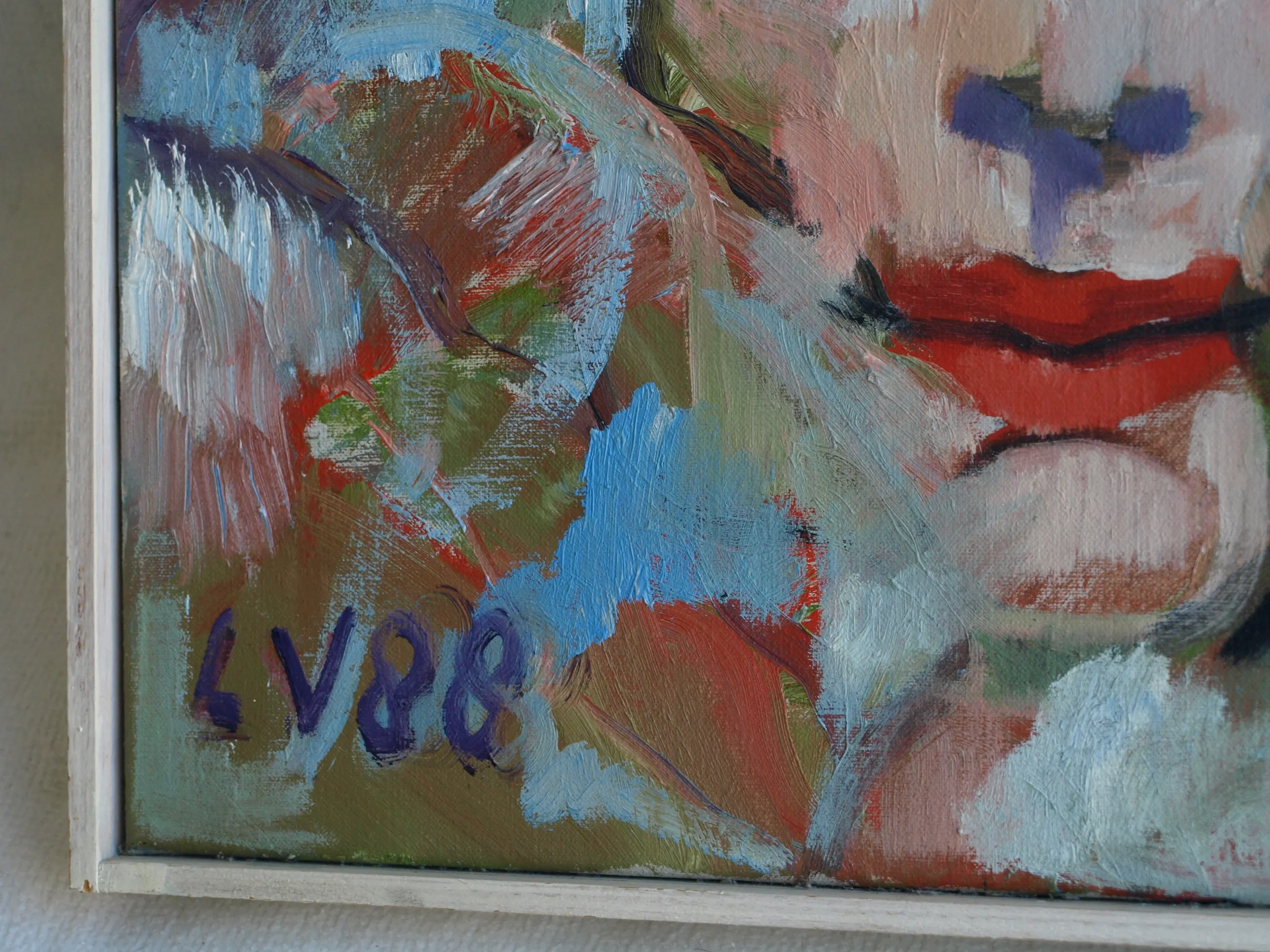 Een ingelijst schilderij uit 1988 van de Nederlandse kunstenaar Louis Vorkink (1933-2010), met een portret van “Mevr. S.”. -Gesigneerd met de initialen van de kunstenaar en gedateerd linksonder in het werk en ook met informatie over het schilderij op de achterkant. -Olieverf op doek, opgespannen op een houten spieraam. -Ingelijst d.m.v. ‘expositielatjes’. -Afmetingen: Lijst, 42 x 42 cm. Spieraam / beeld, 40 x 40 cm. -Herkomst: Uit een inboedel. -Conditie: In prima staat. Zie ook de foto’s voor een eigen indruk. Kan zo aan de muur