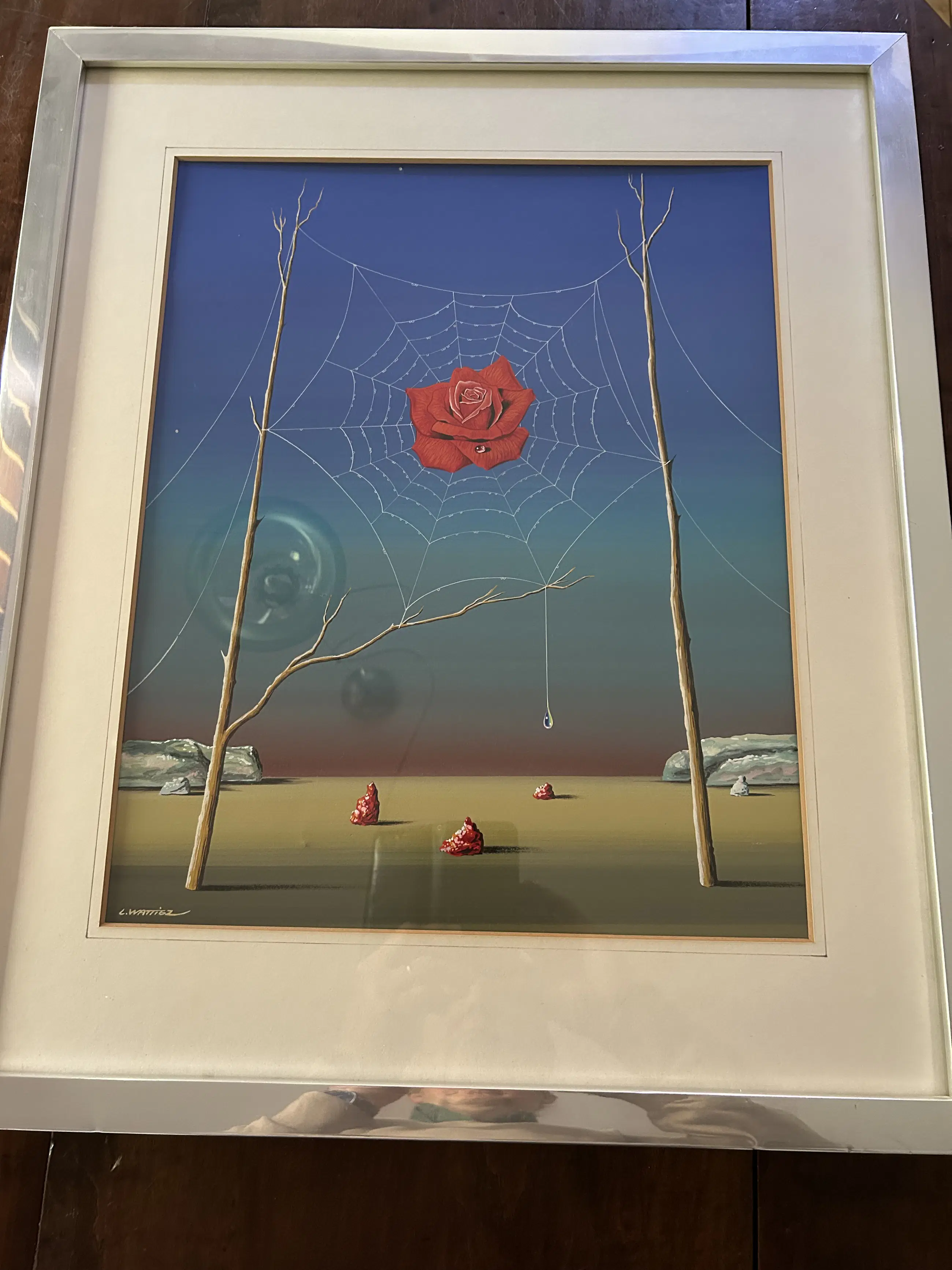 Een surrealistische rotsachtige ondergrond met daarboven een roos in een groot spinnenweb