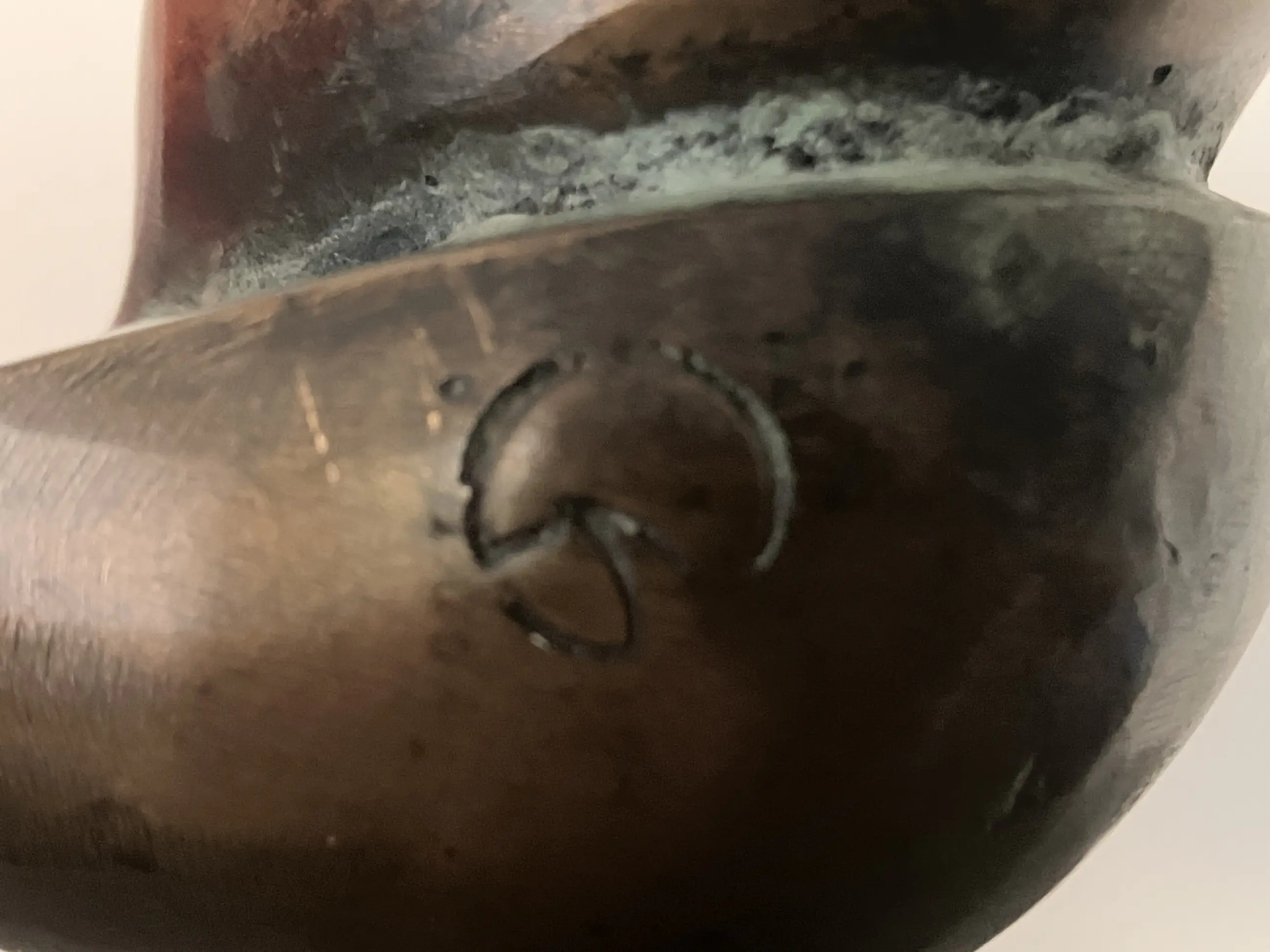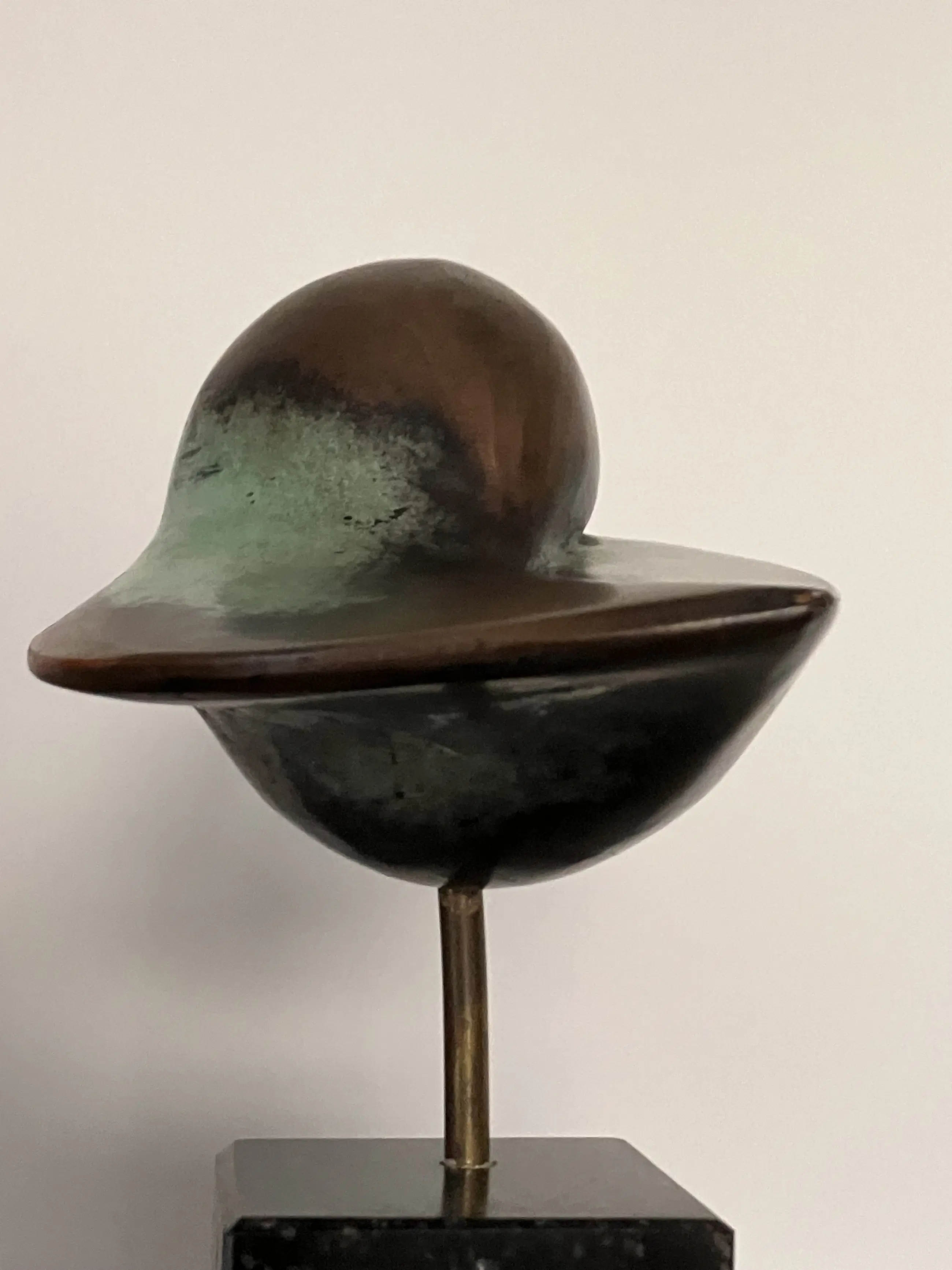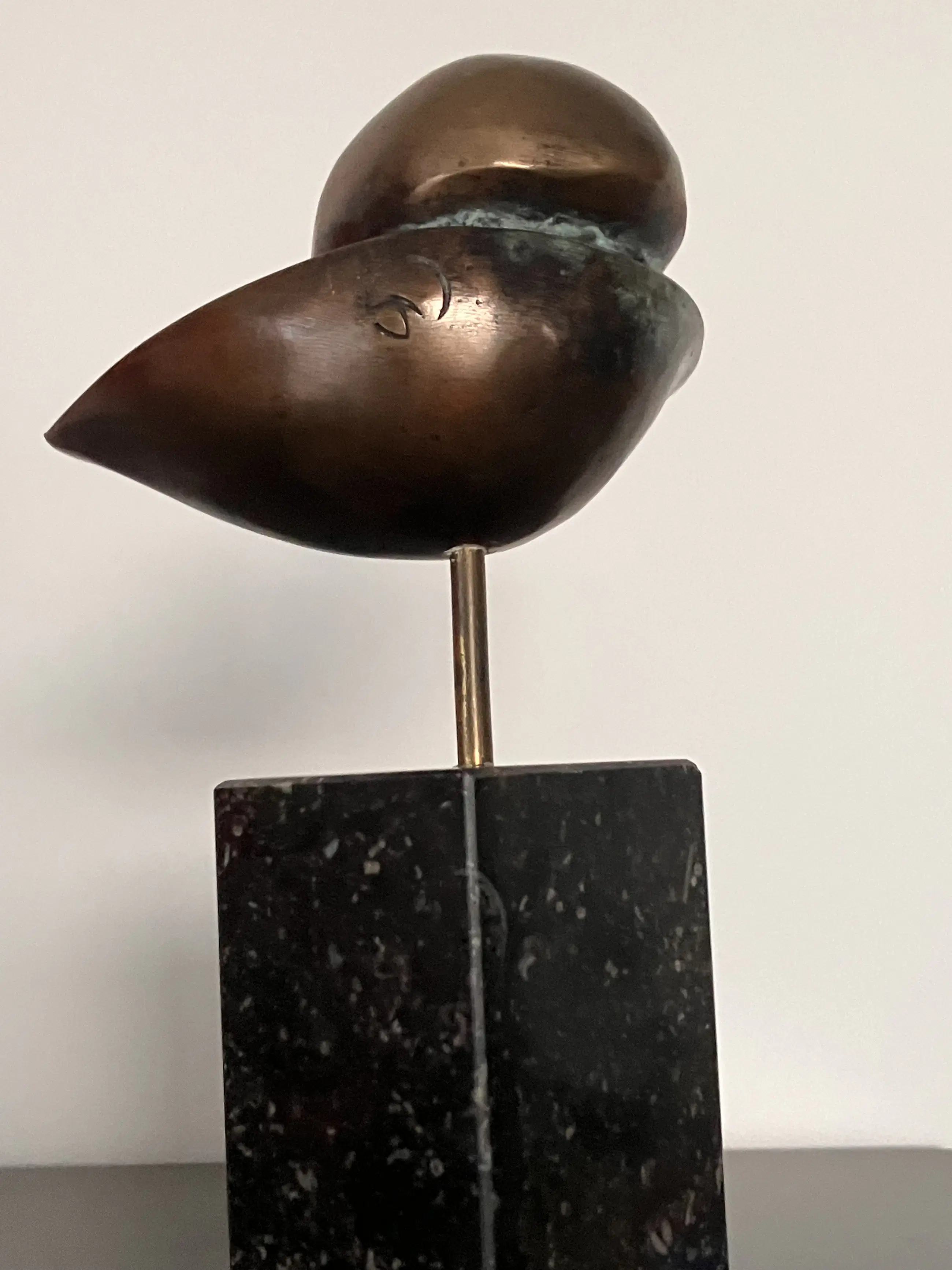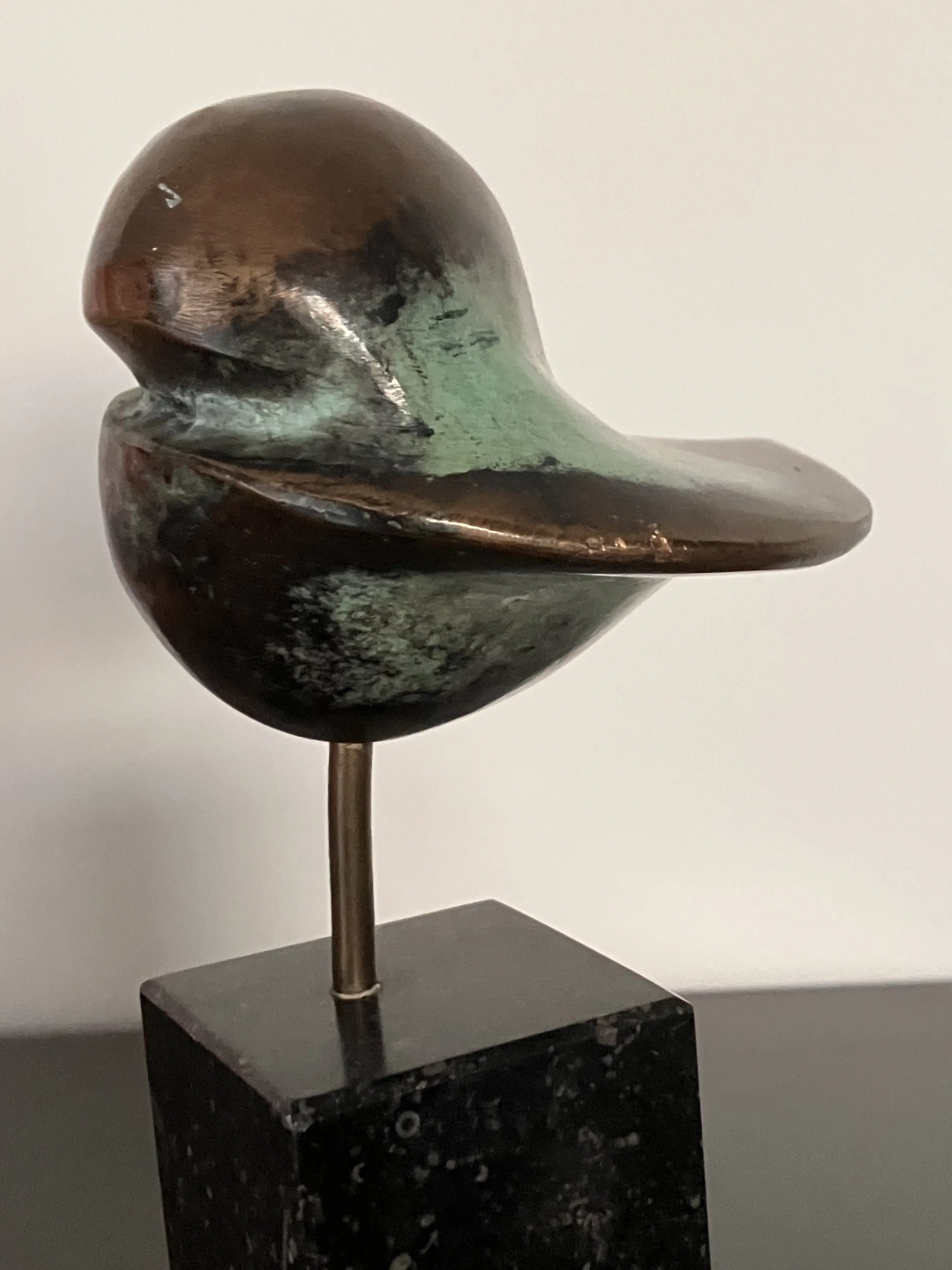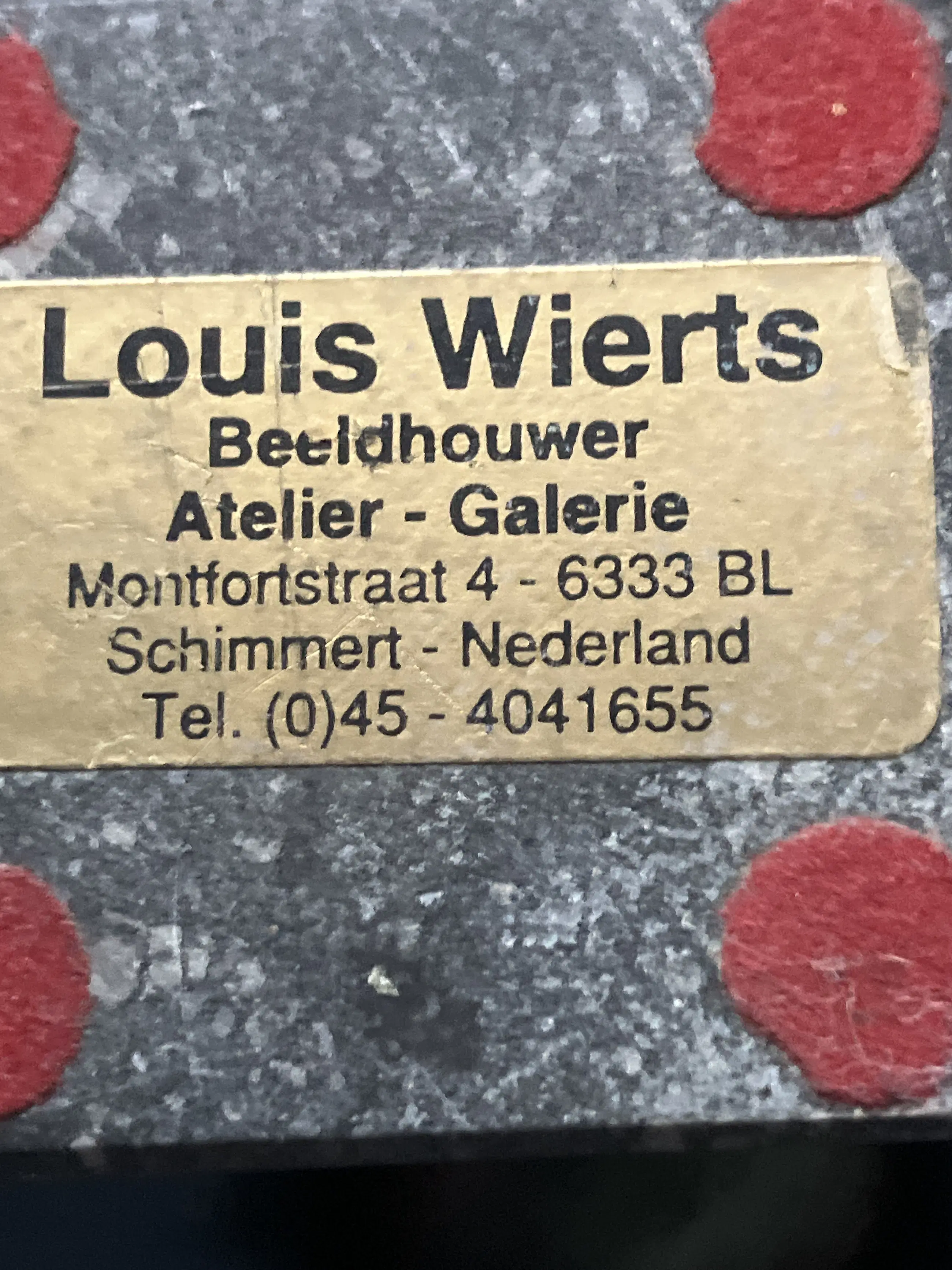 Bronzen beeld met groen- en vergulde patina van een geabstraheerde vogel, op rechthoekig hardstenen sokkel. Het werk is niet handgesigneerd maar heeft het monogram van Louis Wierts op de zijkant en een sticker op de onderkant.