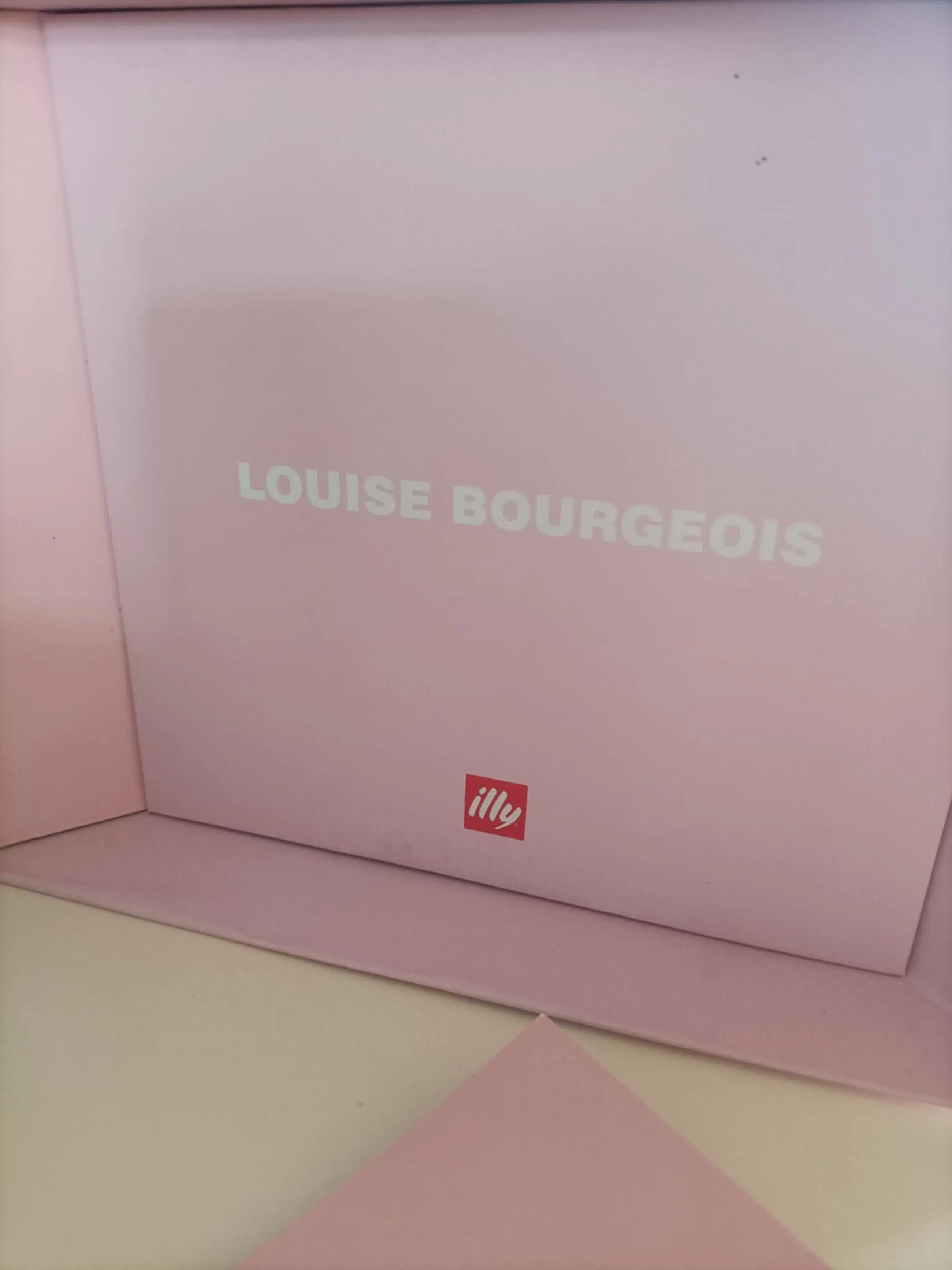 Prachtige box met espresso kop en schotel van Louise Bourgeois. De Illy Art Collection is beroemd bij vele verzamelaars en staat garant voor prachtige collector items. Deze set is heel bijzonder, geheel in lijn met het oeuvre van Bourgeois is de box van karton en de kop en schotel zijn gedeeltelijk blauw/roze met de tekst ´Je t´aime´ erop in wit.