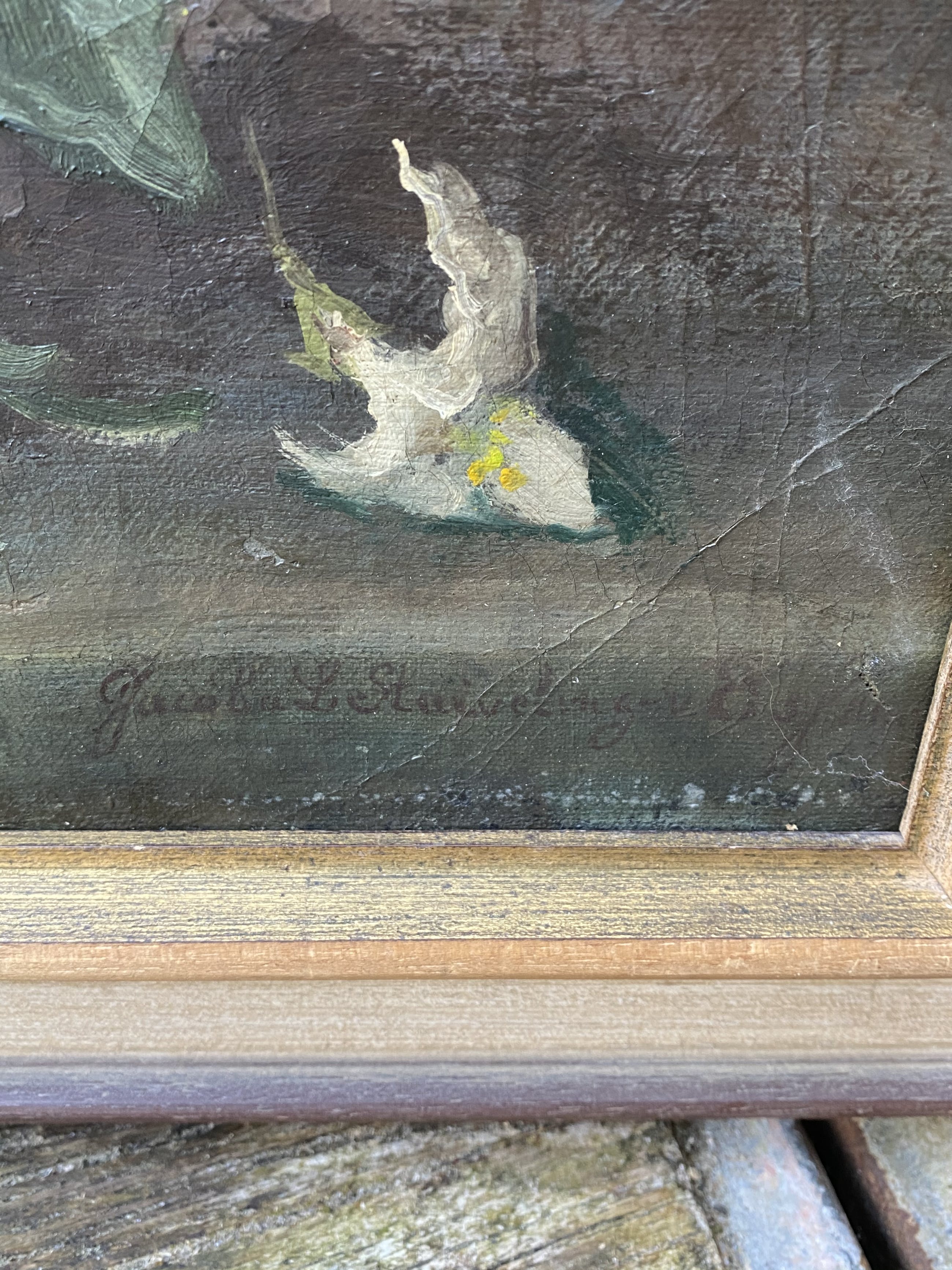 Doek bevat oppervlaktevuil en verkleurde vernis door de tijd, craquelures over gehele voorstelling, hier en daar plekje verfverlies, de lijst bevat oppervlaktevuil en slijtschade door de tijd | |
