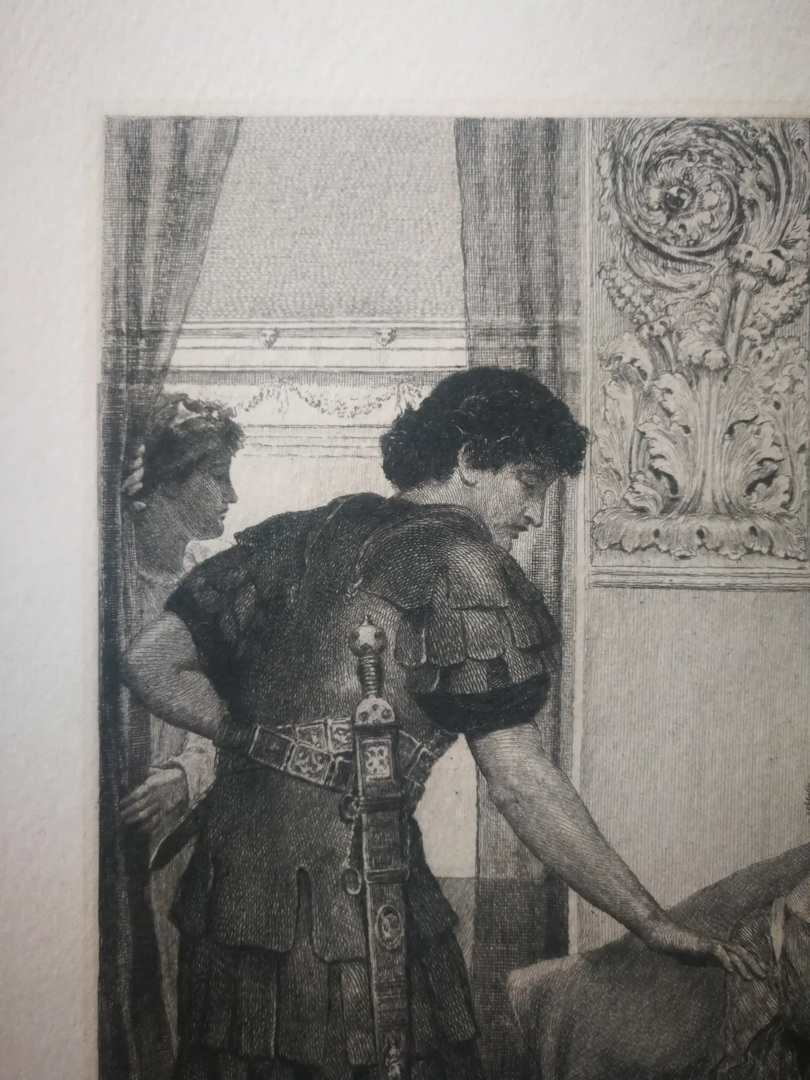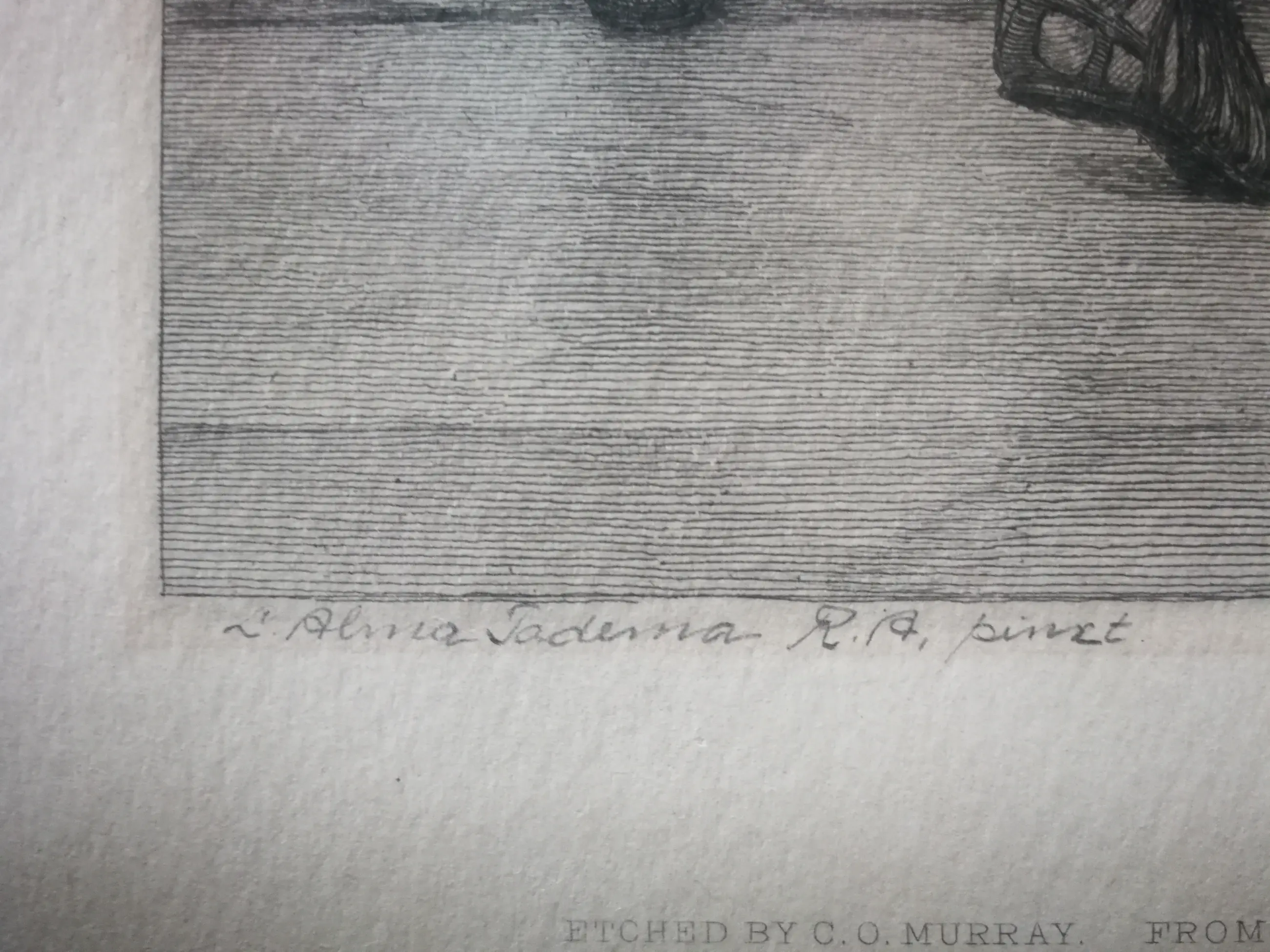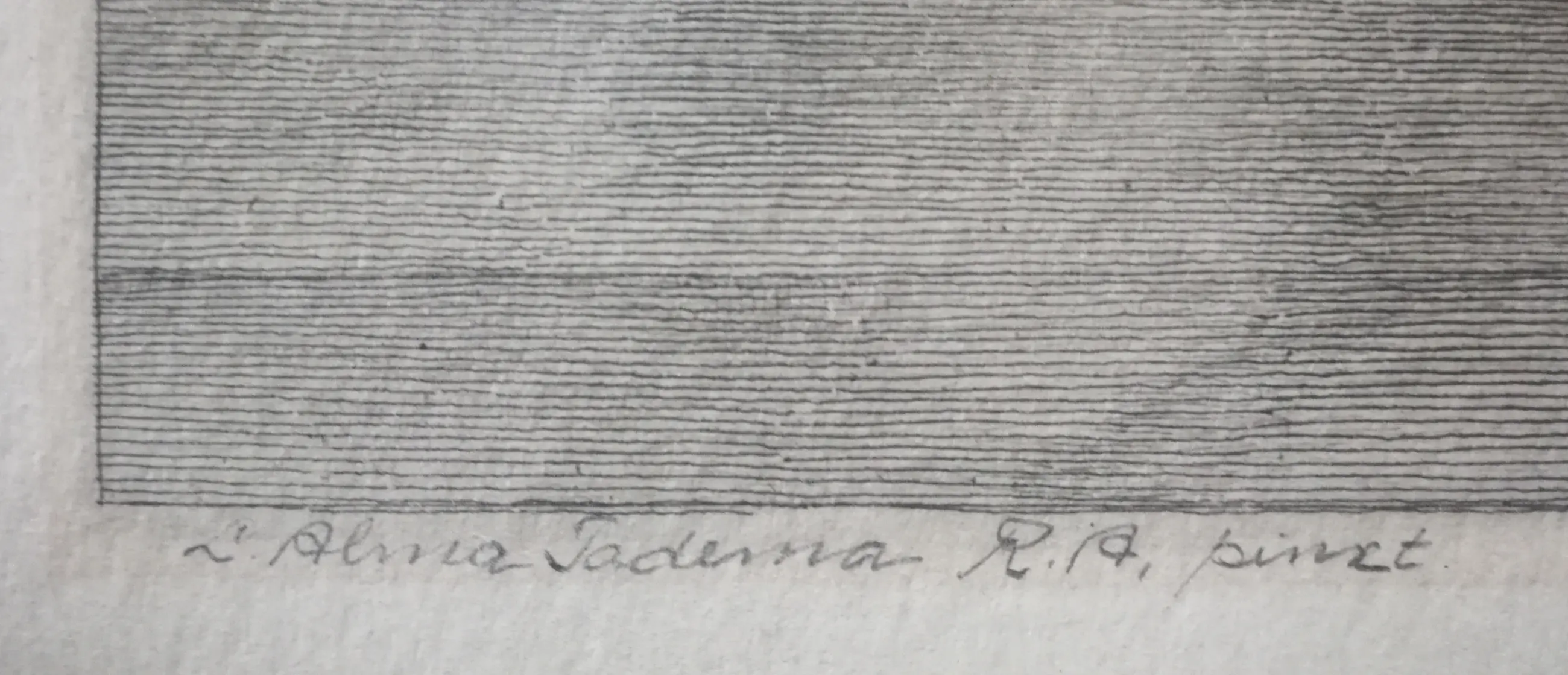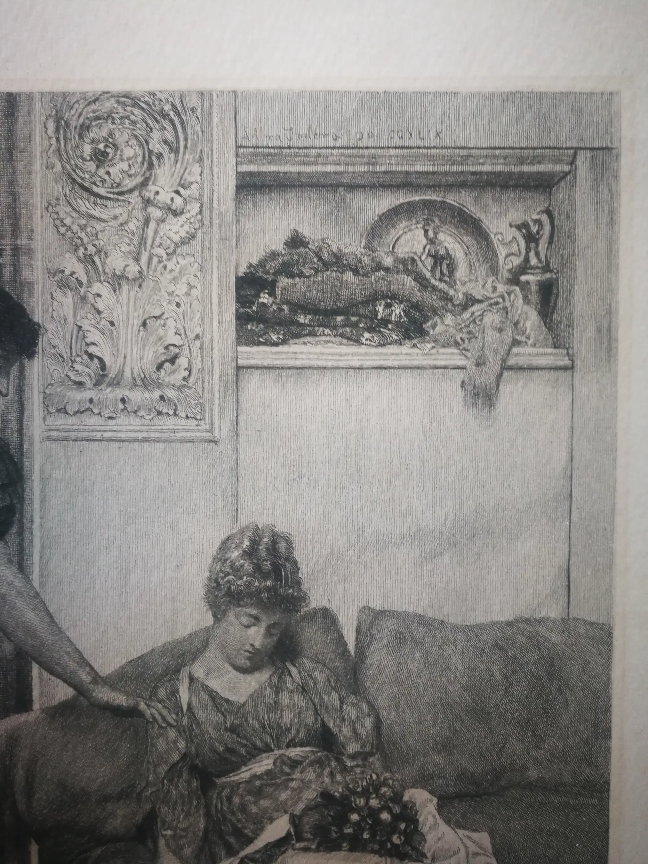 Mooie gravure. Mogelijk handgesigneerd door Tadema zelf. Algemeen goede staat. Bovenzijde geplakt. Zie foto's voor eigen oordeel kwaliteit en meer informatie.