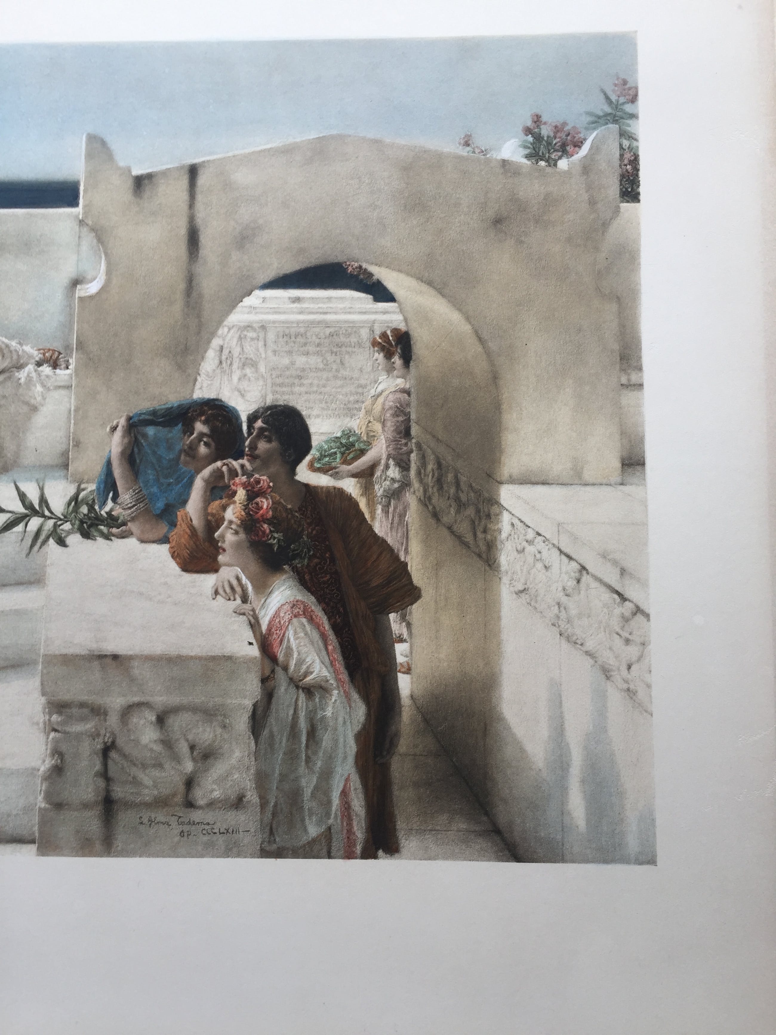 A superb original antique lithograph print by Sir Lawrence Alma Tadema. Titled "Under the Roof of Blue Ionian Weather" this very large print is hand colored and exceptionally fresh. Printed on thick paper with very large margins. These prints were issued under the supervision of Alma Tadema himself, in 1901 and published by Arthur Tooth in London. It was printed in Munich. The size of the actual print (the part that shows the painting) is 33" (84 cm) x 13-3/4" (35 cm). When I include the margins, the total measurements are 39-3/4" (101 cm) x 22-1/2" (57 cm). Condition of this print is excellent. I removed this print from the old original frame and as you can see in the photo's this print has discoloration along the edge from the old frame and there are small holes where the print was nailed to the frame. However, as the margins of this print are so large this is really no problem at all as this would fall behind the matting if the new owner should want to frame this print again. Or you could simply cut off the stained edges and you would still be left with a very generous margin.