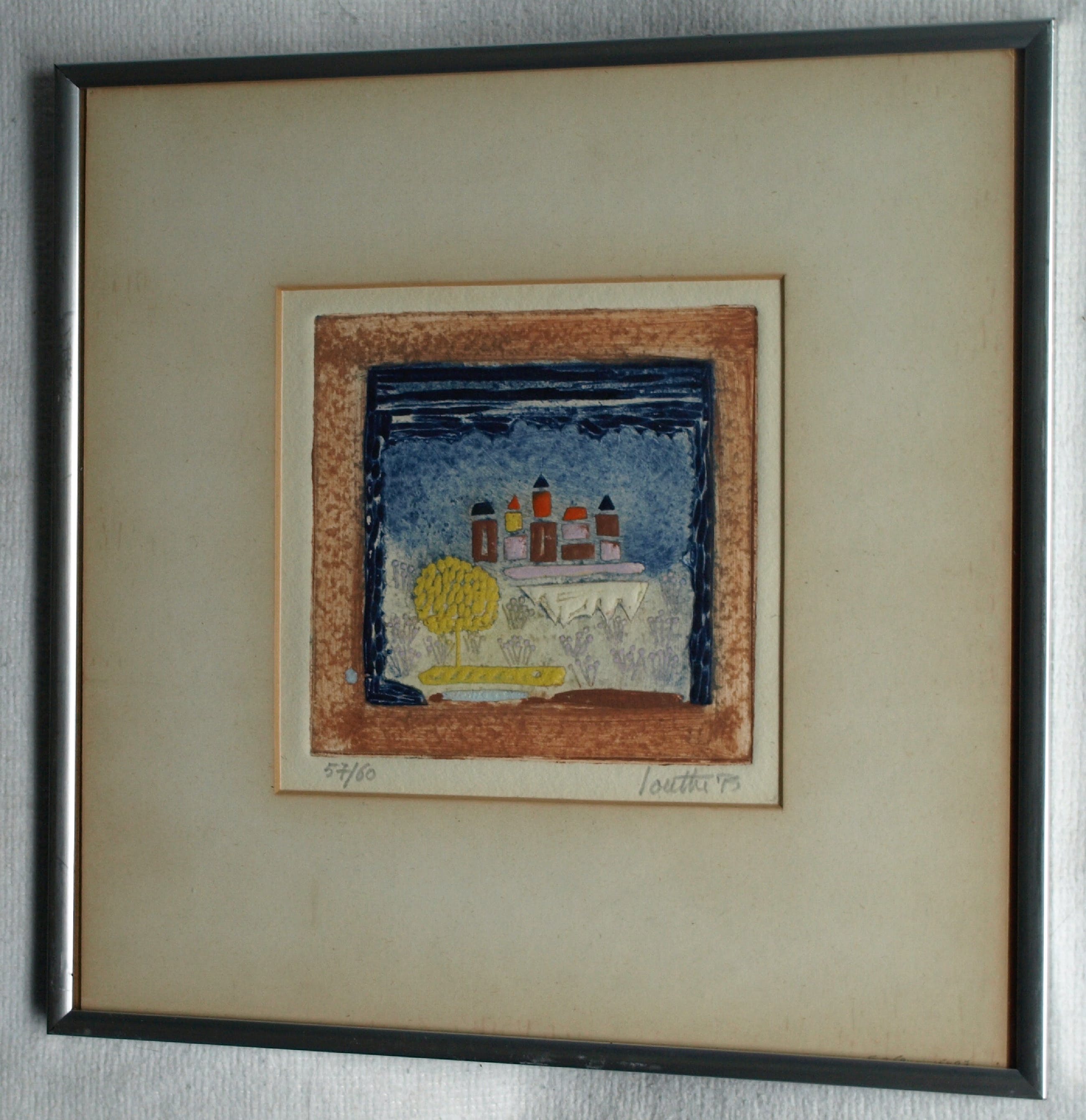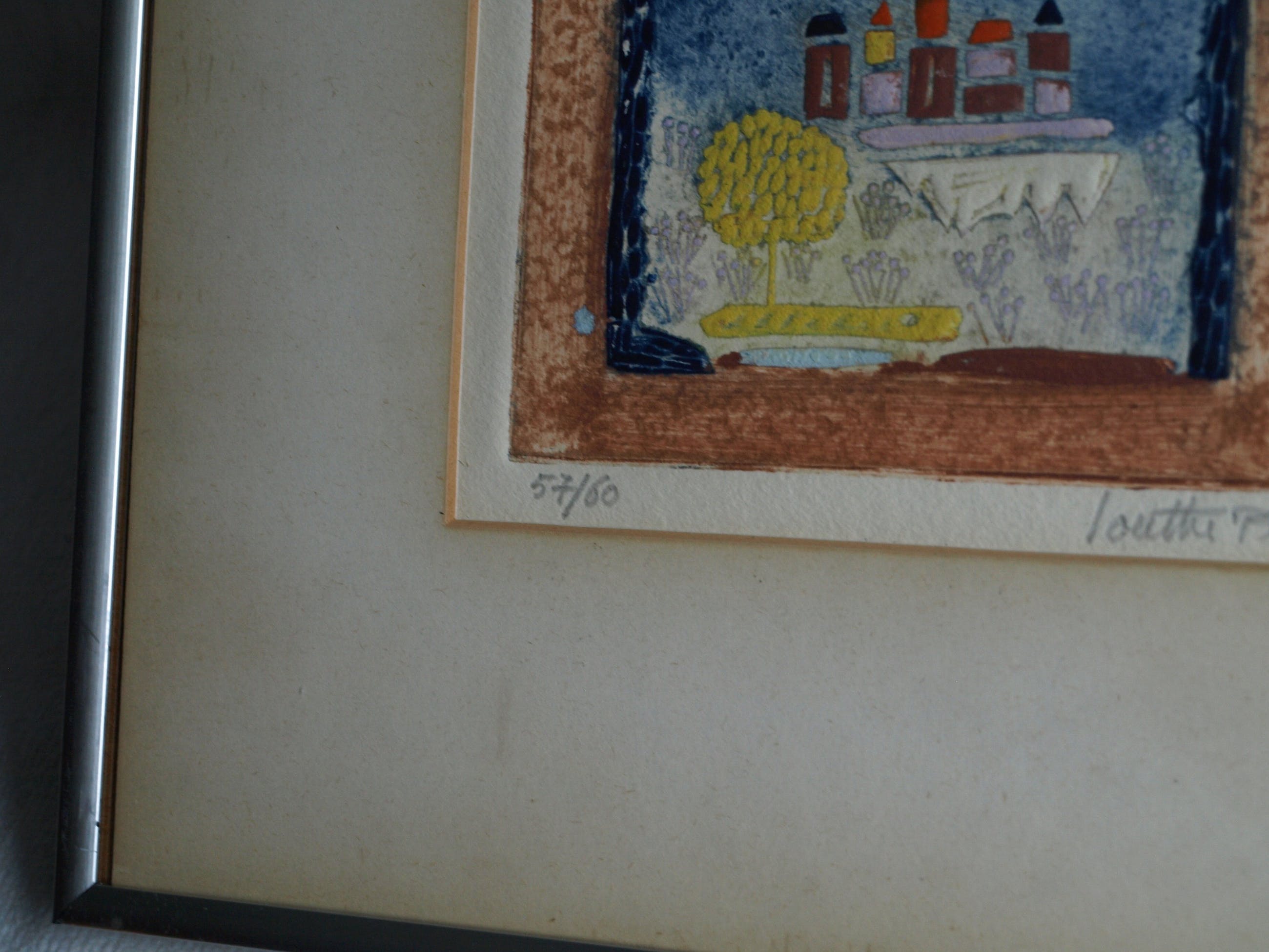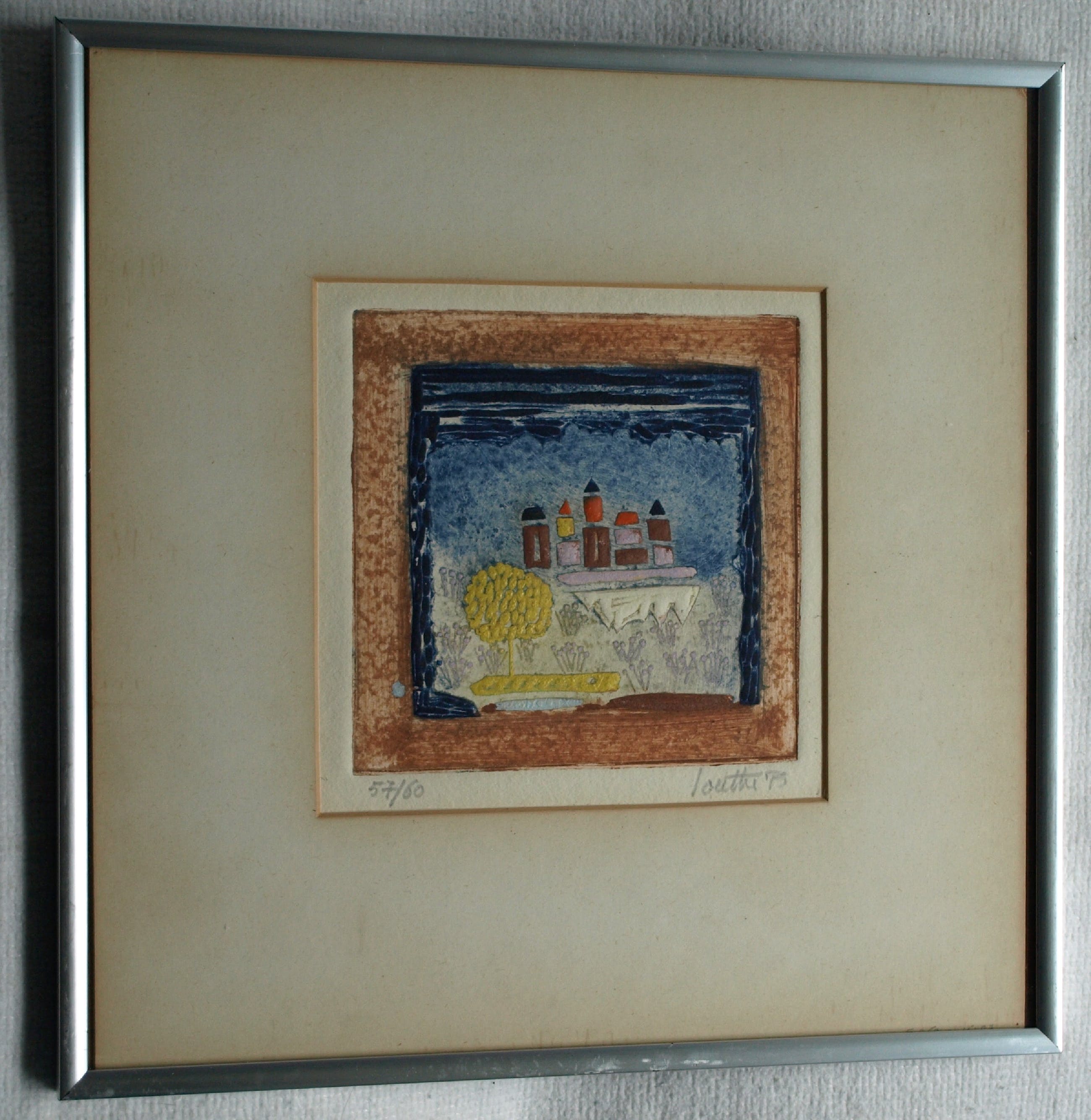 Een ingelijste kleurenets met reliëf van de Franse kunstenaar Louttre B. , pseudoniem van Marc-Antoine Bissière (1926-2012). -Gesigneerd en genummerd met potlood. Nr 57 van 60. -Jaartal onbekend. -Ingelijst in een metalen lijst met passe-partout en glasplaat. -Afmetingen: Lijst, 33,5 x 33,5 cm. Beeld, 14,5 x 14,5 cm. -Herkomst: Uit een inboedel. -Conditie: De ets is in goede staat. Het papier is licht vergeeld. Het passe-partout is vergeeld en heeft vlekjes. De lijst heeft slijtplekjes. Zie ook de foto’s voor een eigen indruk. Kan zo aan de muur.