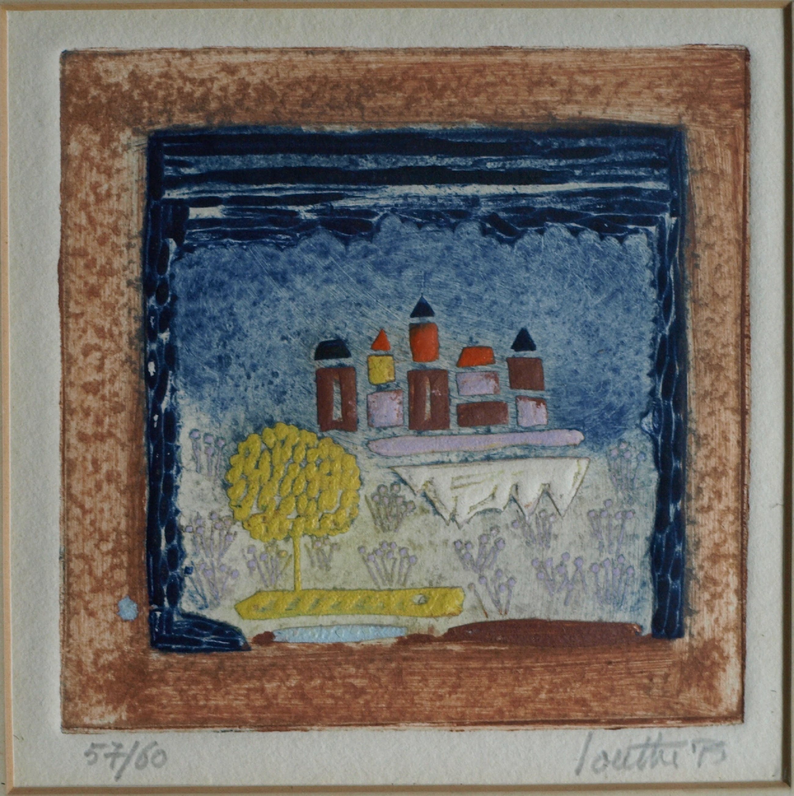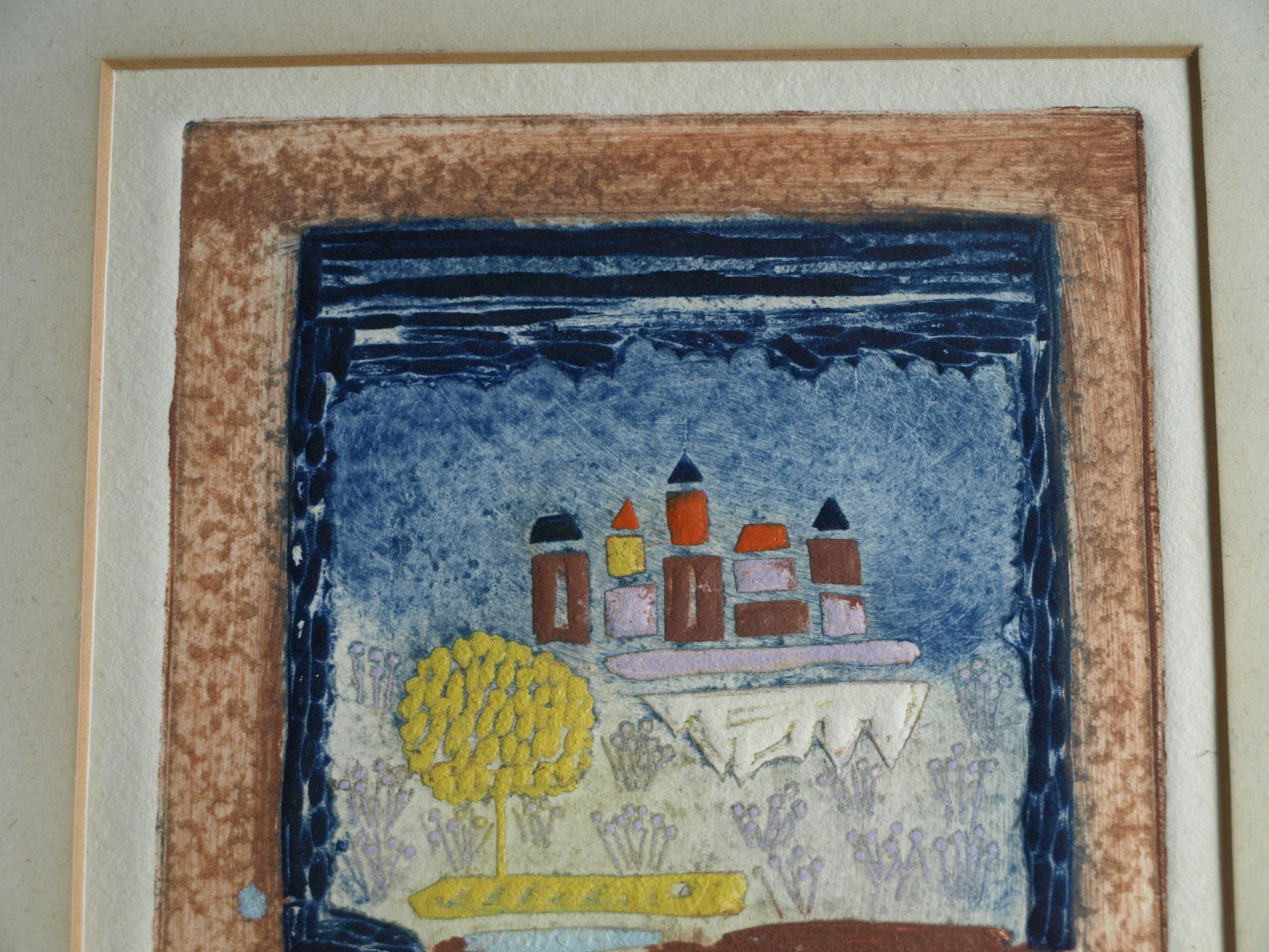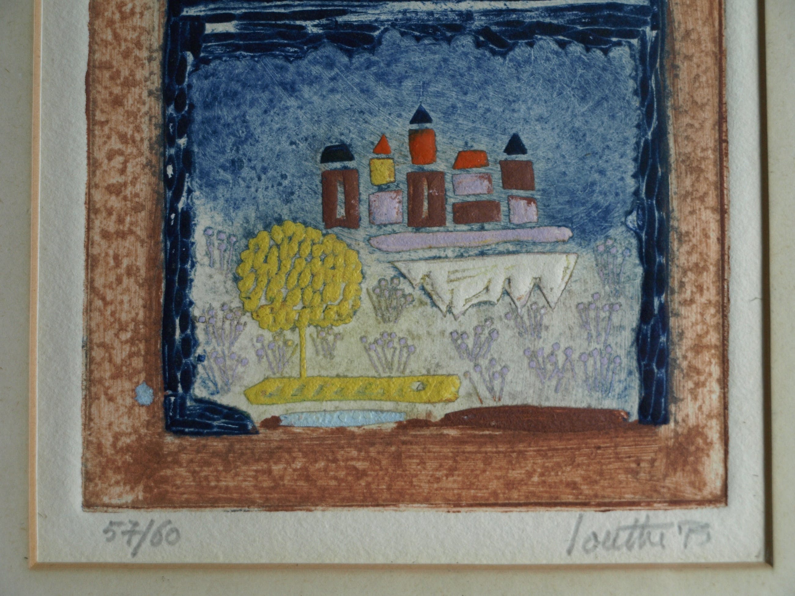 Een ingelijste kleurenets met reliëf van de Franse kunstenaar Louttre B. , pseudoniem van Marc-Antoine Bissière (1926-2012). -Gesigneerd en genummerd met potlood. Nr 57 van 60. -Jaartal onbekend. -Ingelijst in een metalen lijst met passe-partout en glasplaat. -Afmetingen: Lijst, 33,5 x 33,5 cm. Beeld, 14,5 x 14,5 cm. -Herkomst: Uit een inboedel. -Conditie: De ets is in goede staat. Het papier is licht vergeeld. Het passe-partout is vergeeld en heeft vlekjes. De lijst heeft slijtplekjes. Zie ook de foto’s voor een eigen indruk. Kan zo aan de muur.