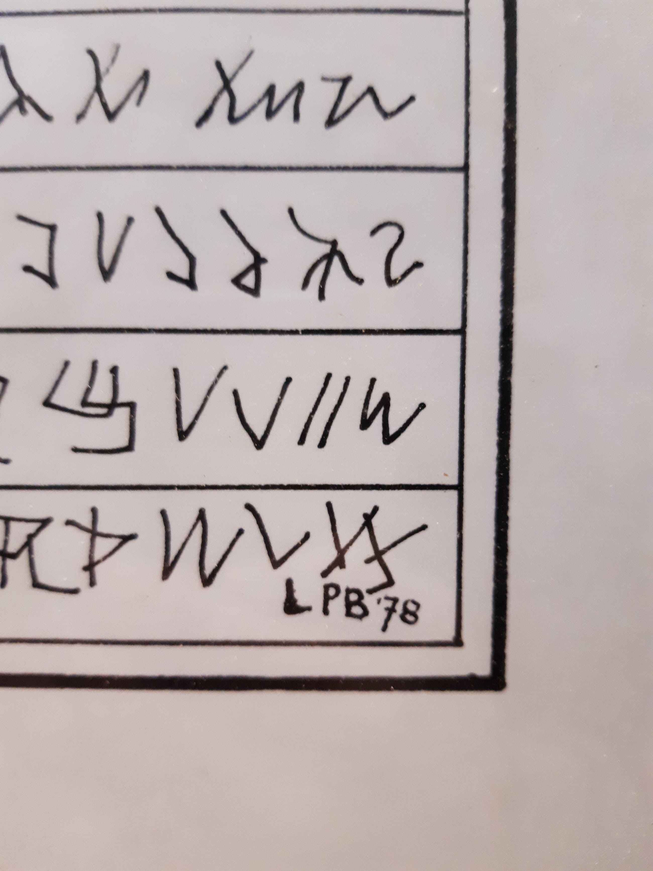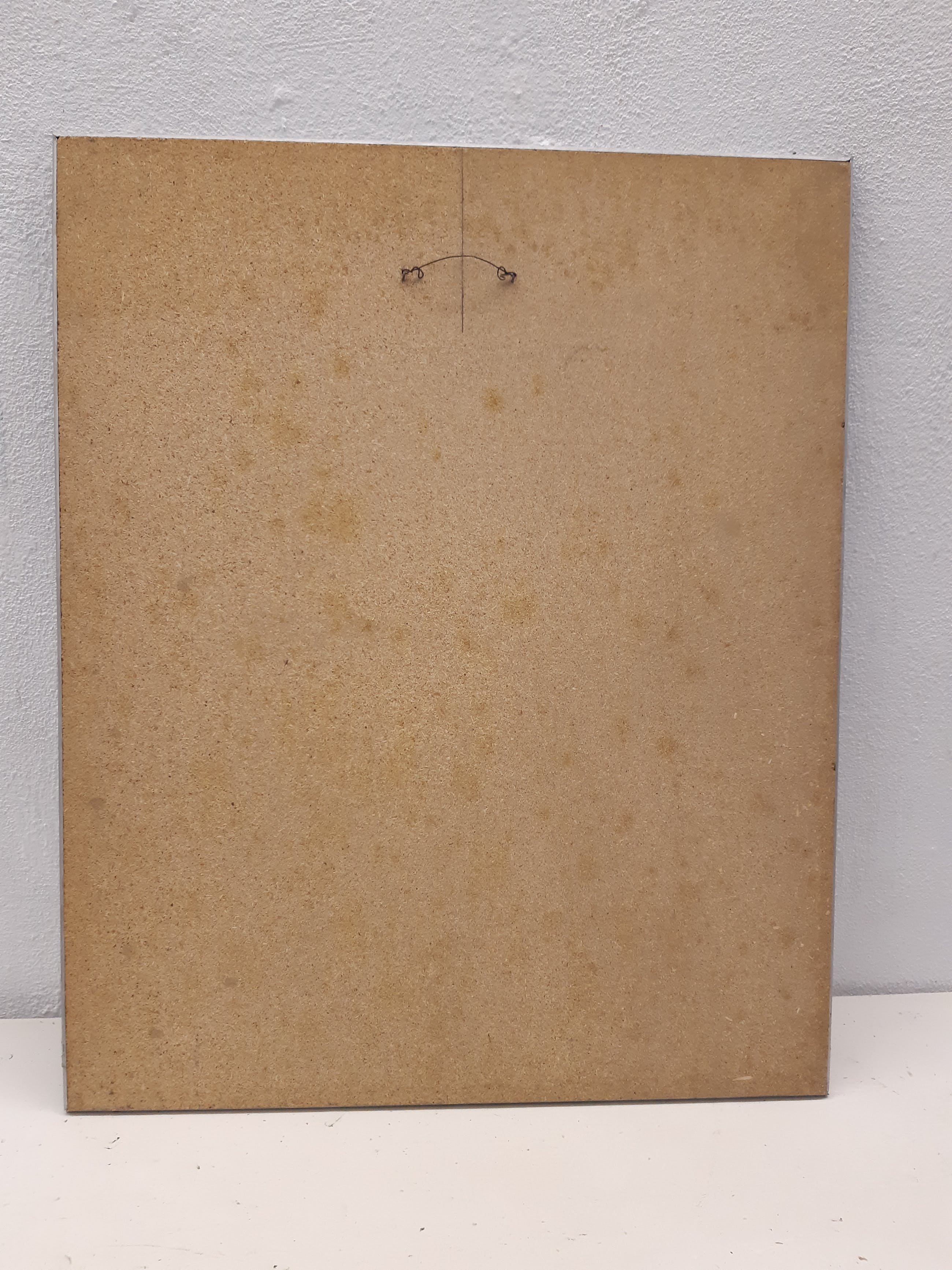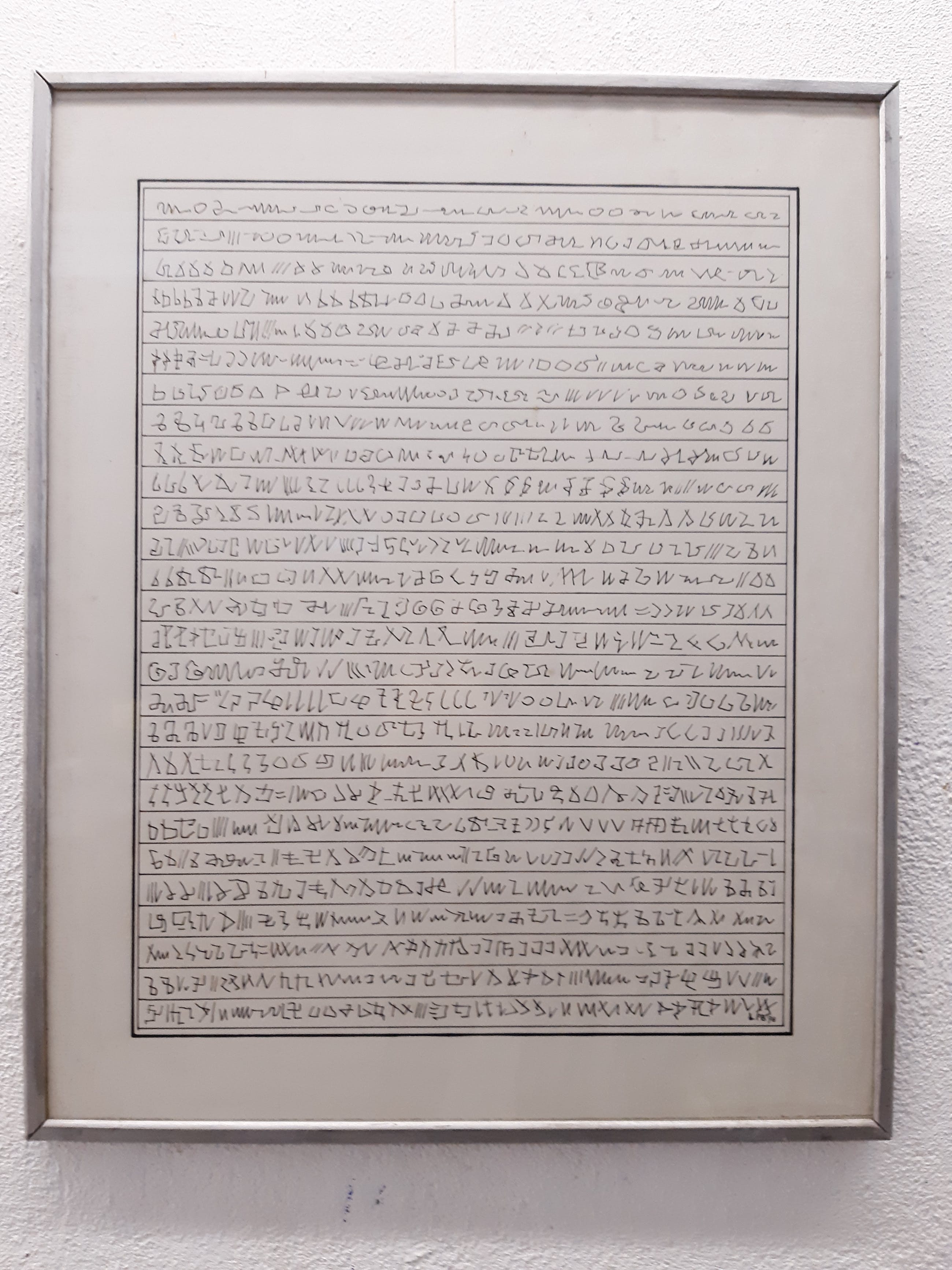 Het afgebeelde geheimschrift doet denken aan het Lineair B van de oude Grieken. Geheimzinnig en fascinerend. Het werk is achter glas en daardoor in goede staat gebleven. Het is voorzien van een lijstje en ophanghaakje.