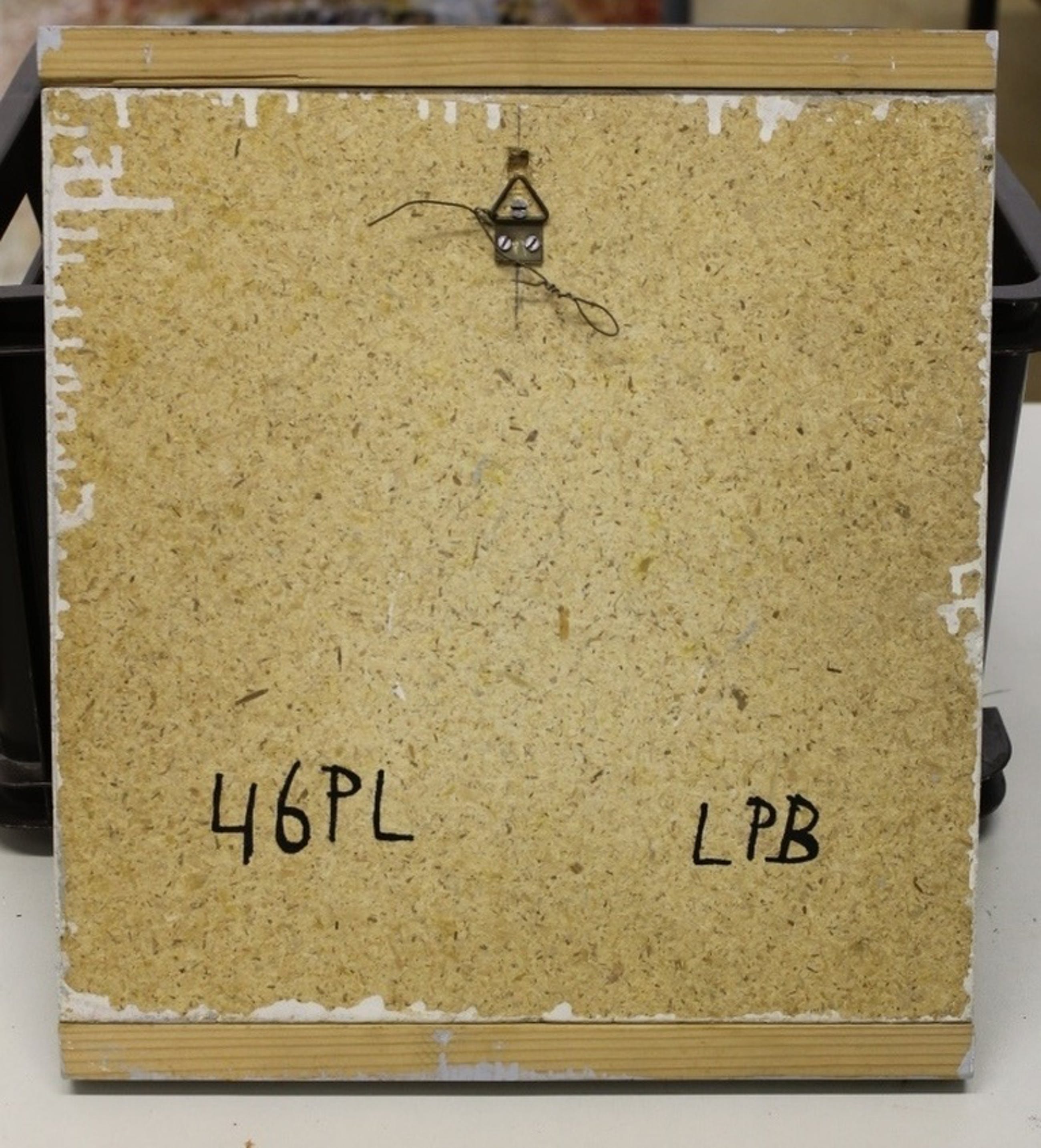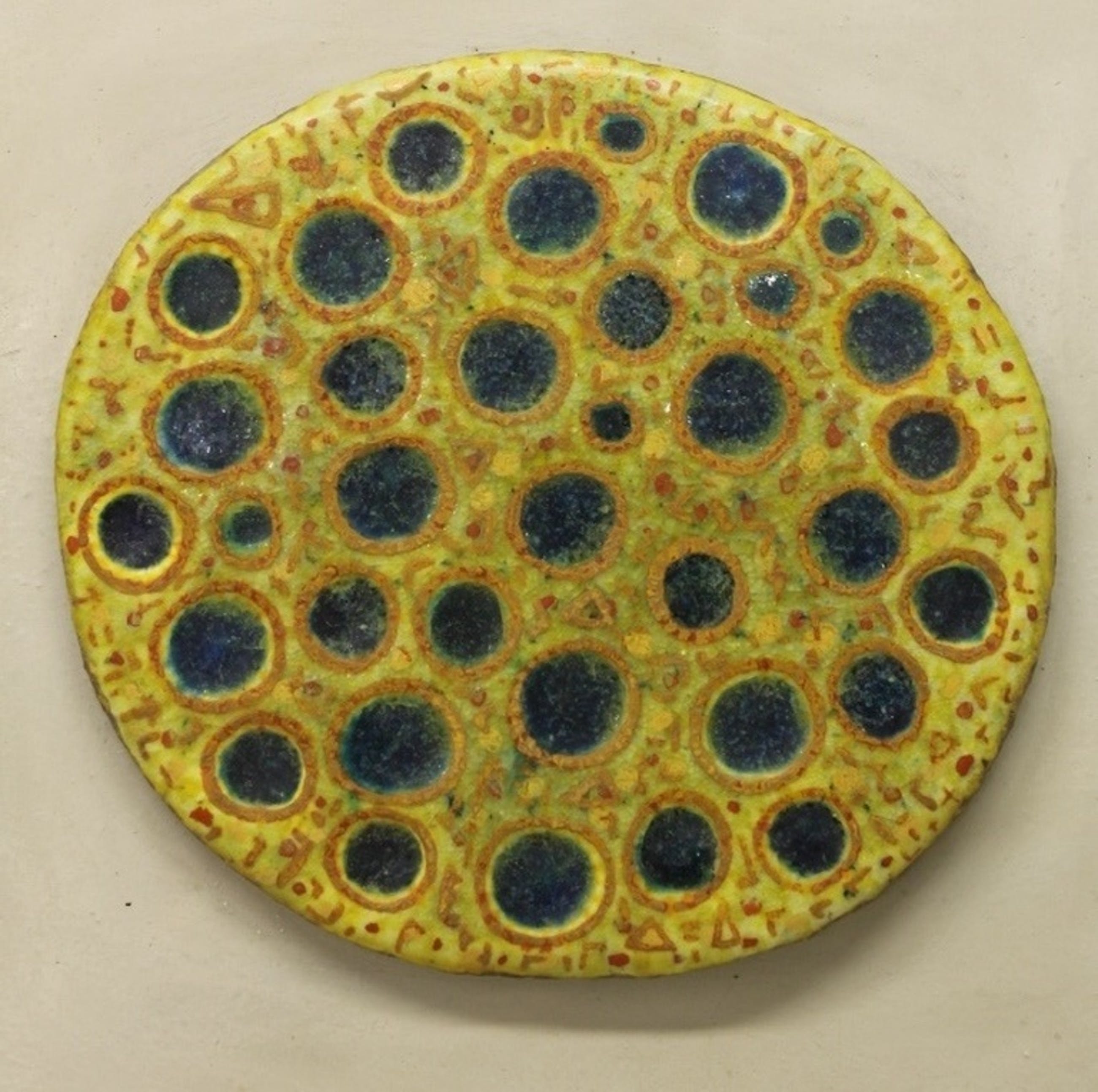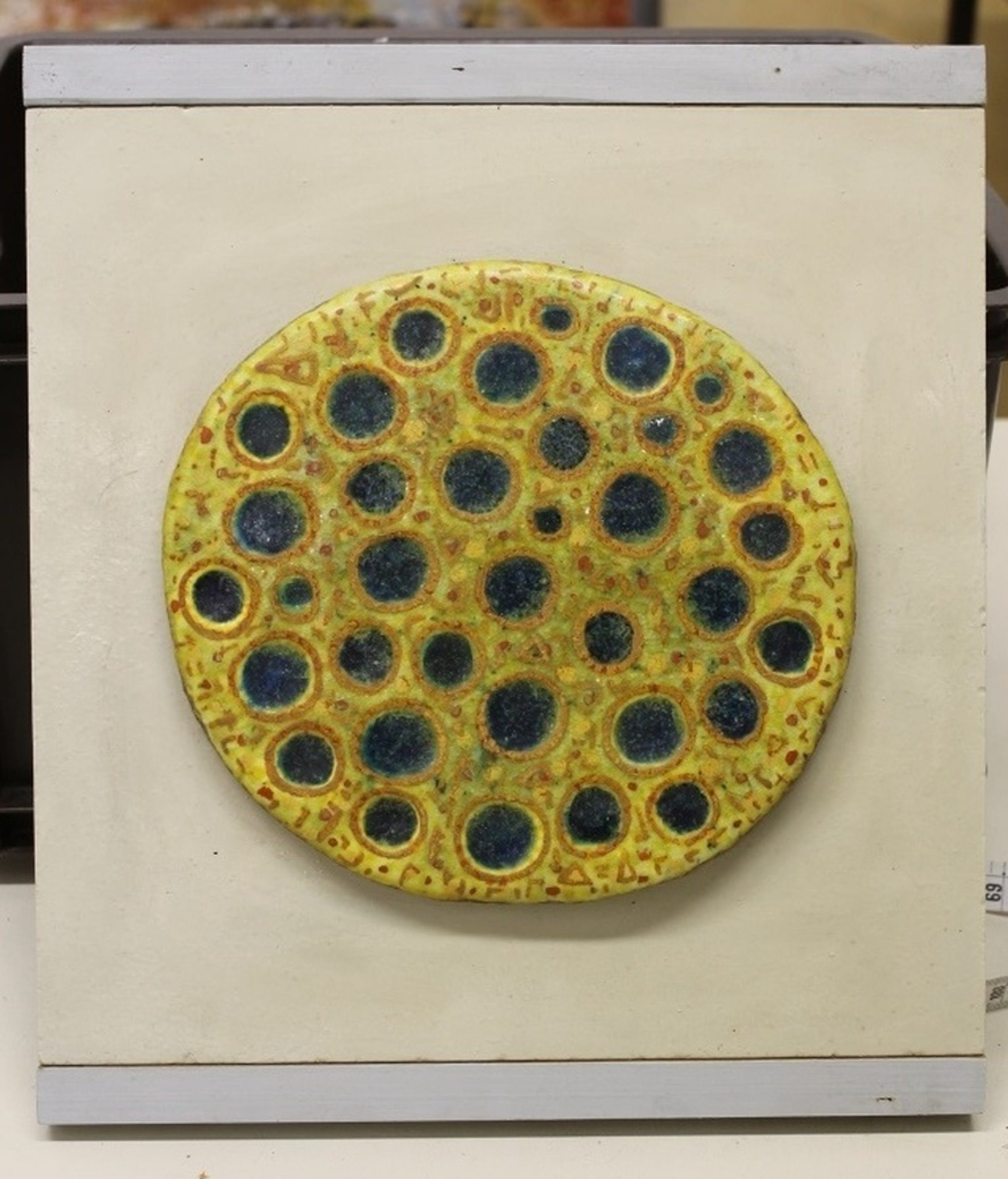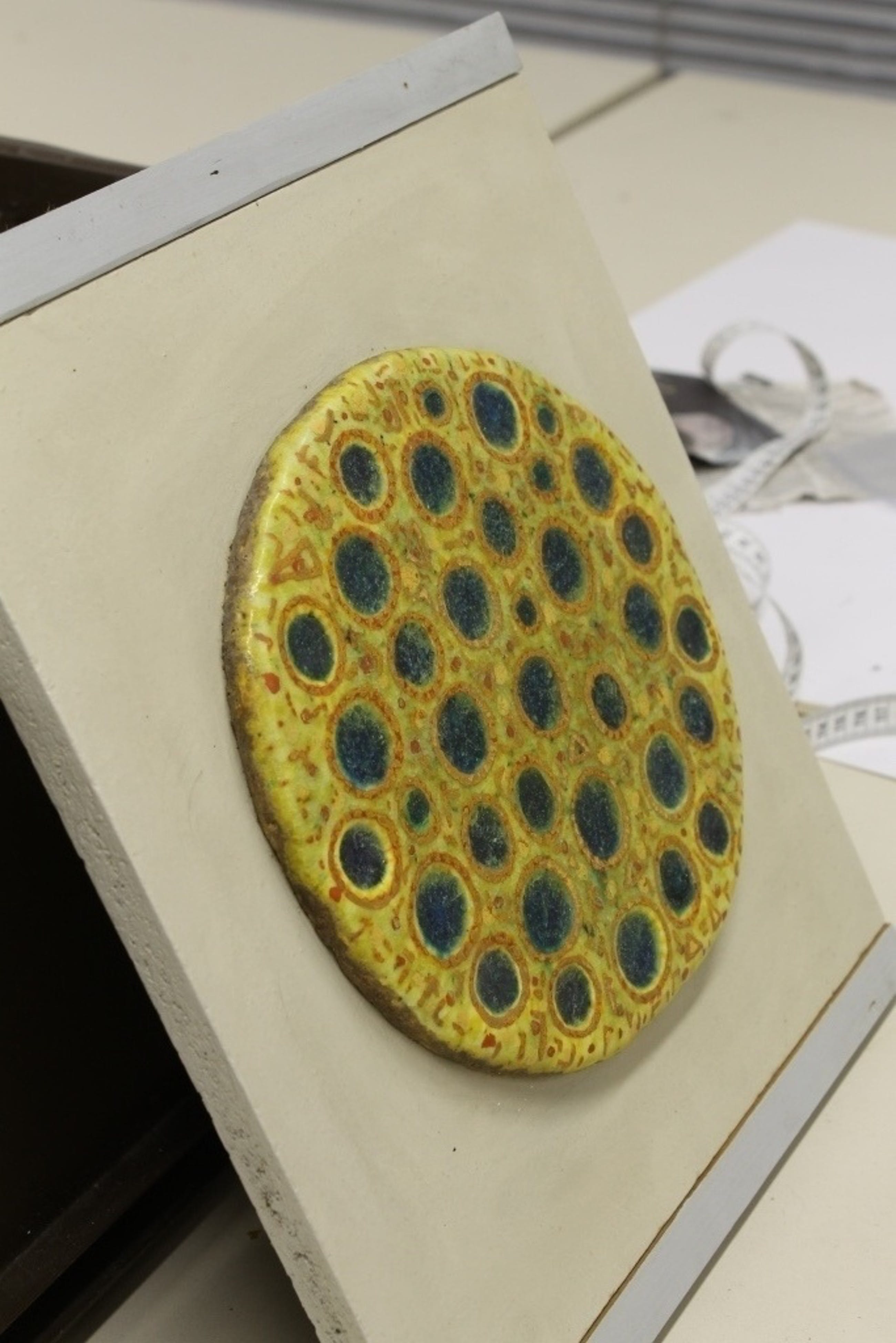 Bijna ronde keramische tegel, gelijmd op geverfd spaanplaat.