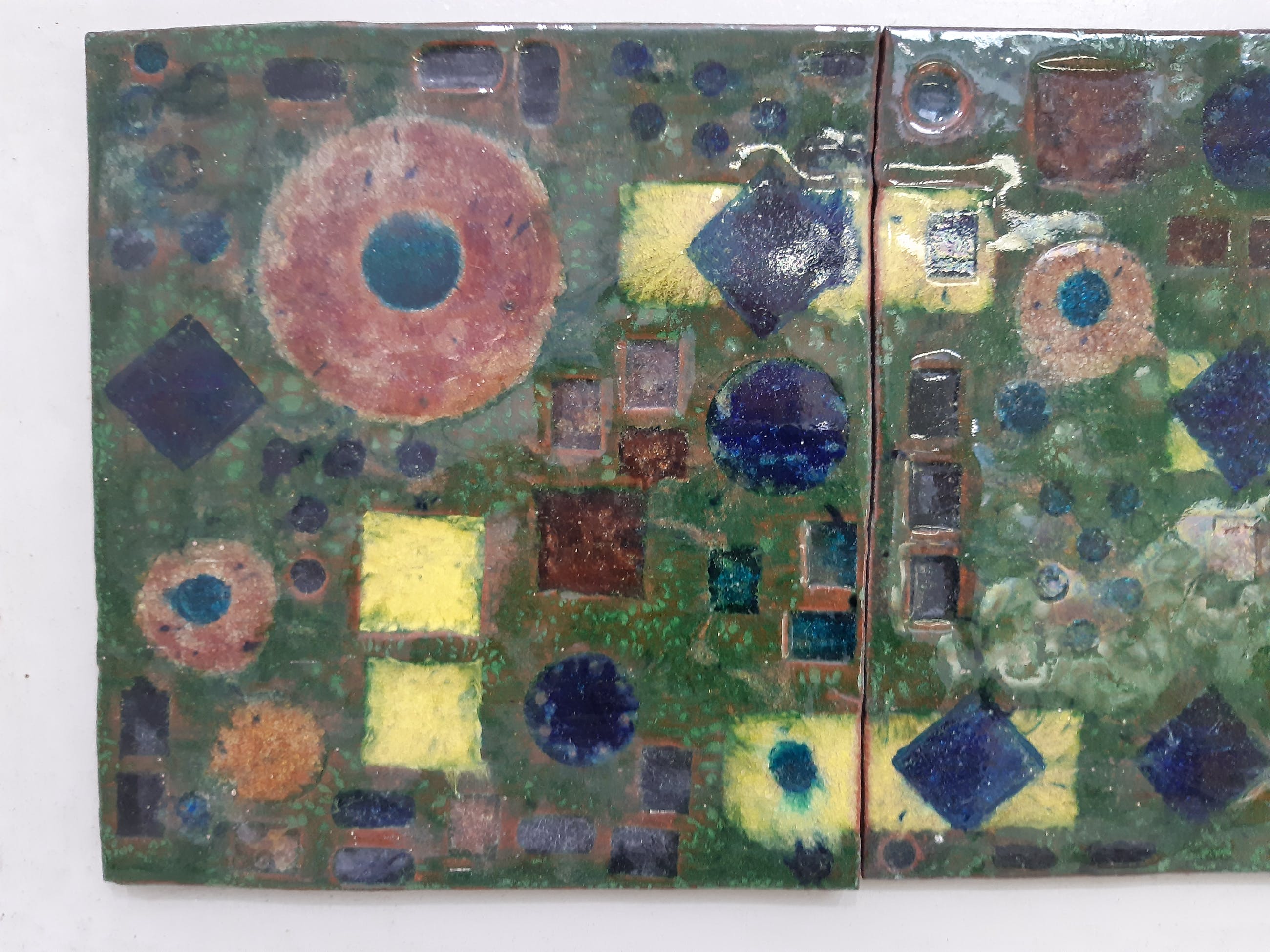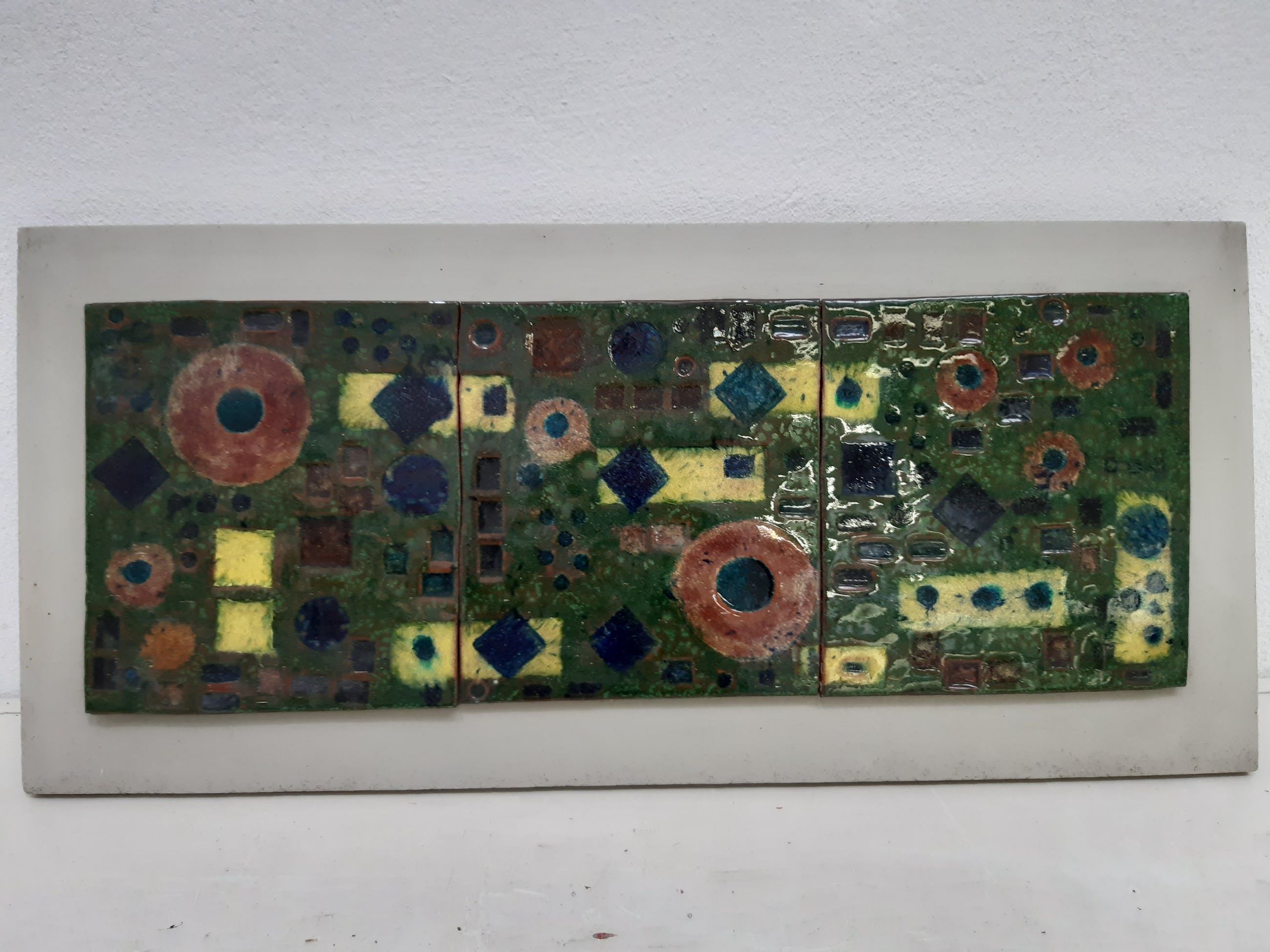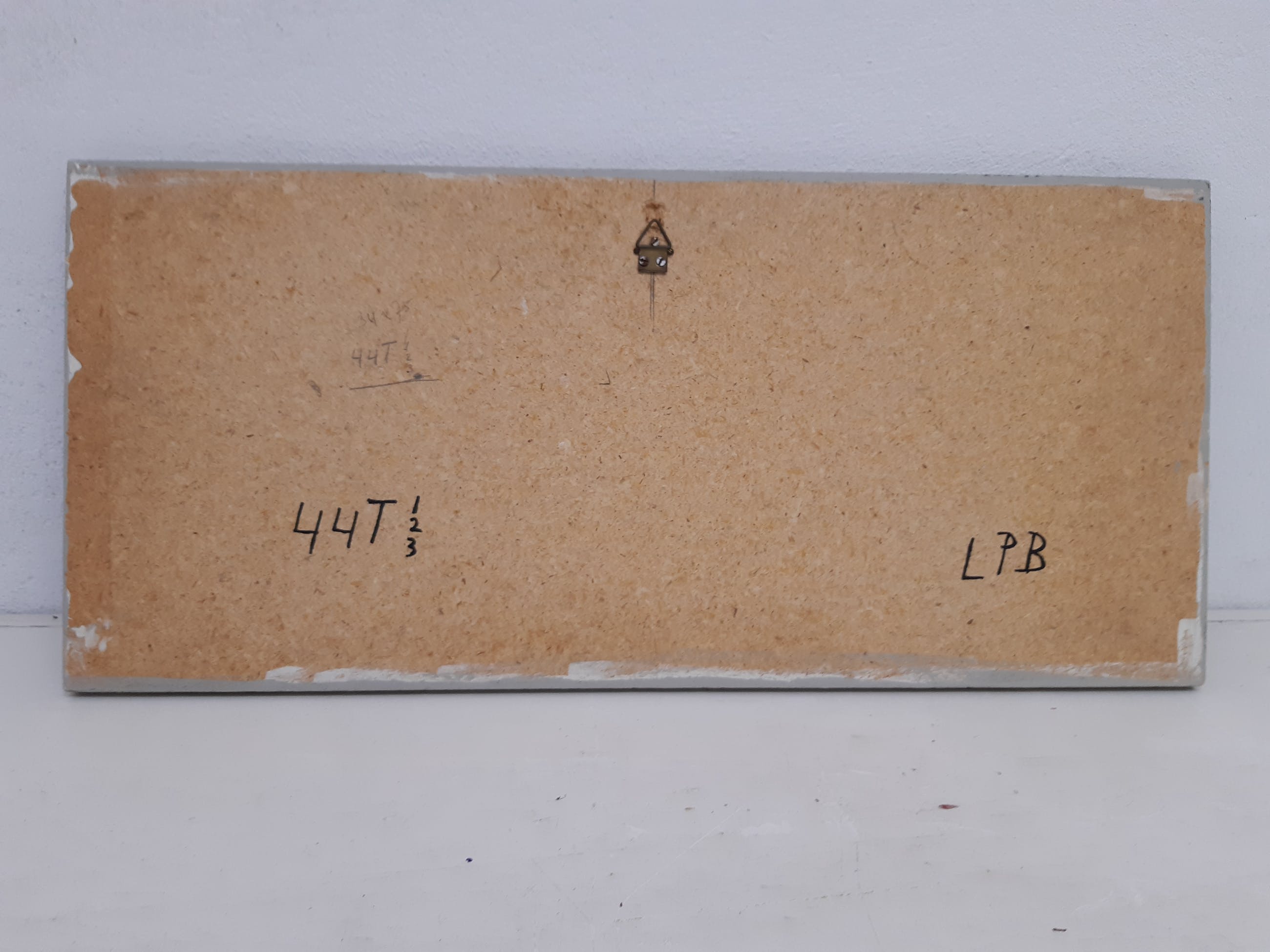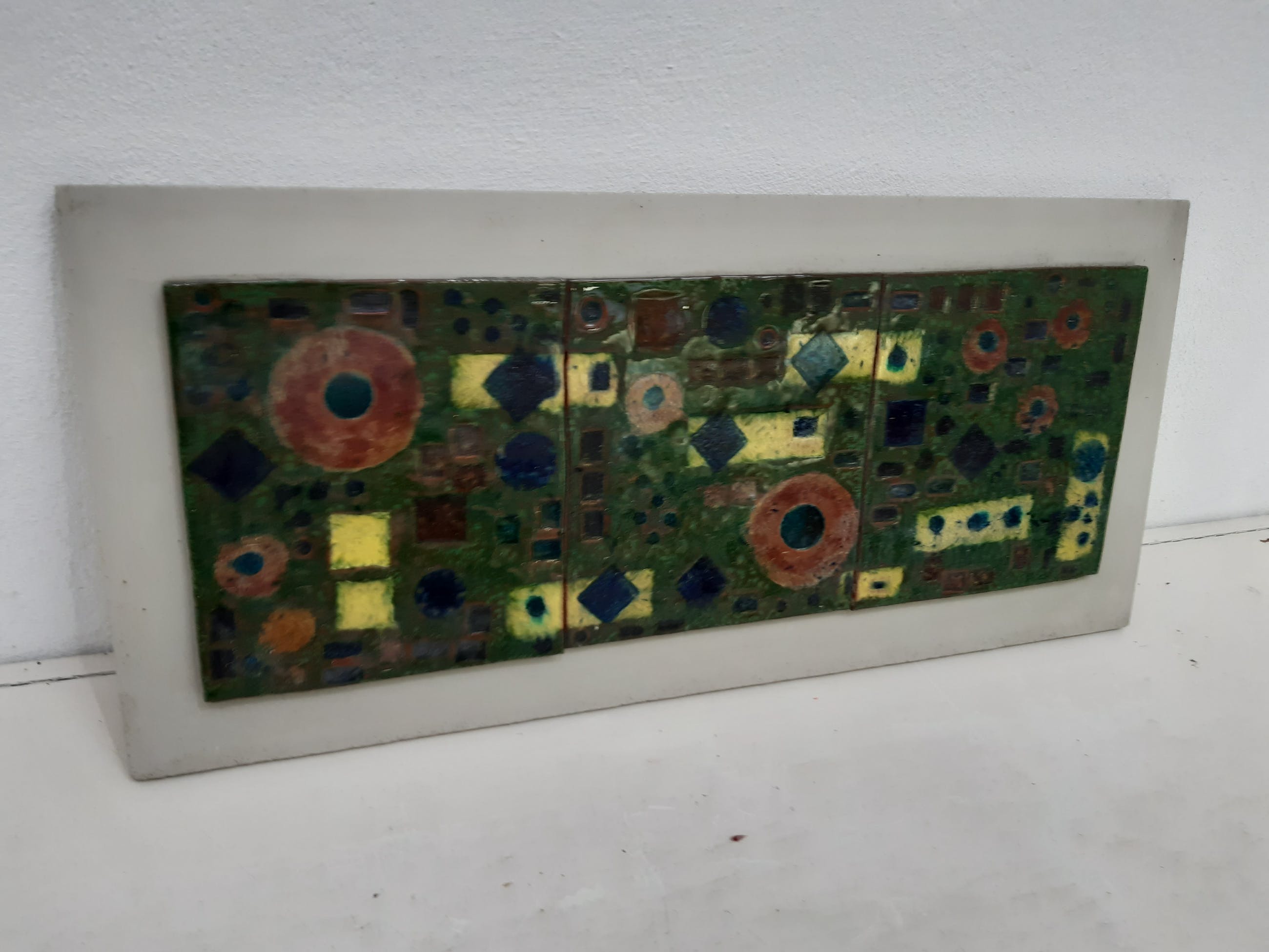 De drie vierkante tegels zijn horizontaal naast elkaar geplaatst op een rechthoekige drager van spaanderplaat. De afmeting van het tegeltableau is 24 x 66 cm. Aan de achterkant bevindt zich een ophanghaakje en het geheel is gesigneerd met het nummer 44T123 en de paraaf van L.P. Boone.
