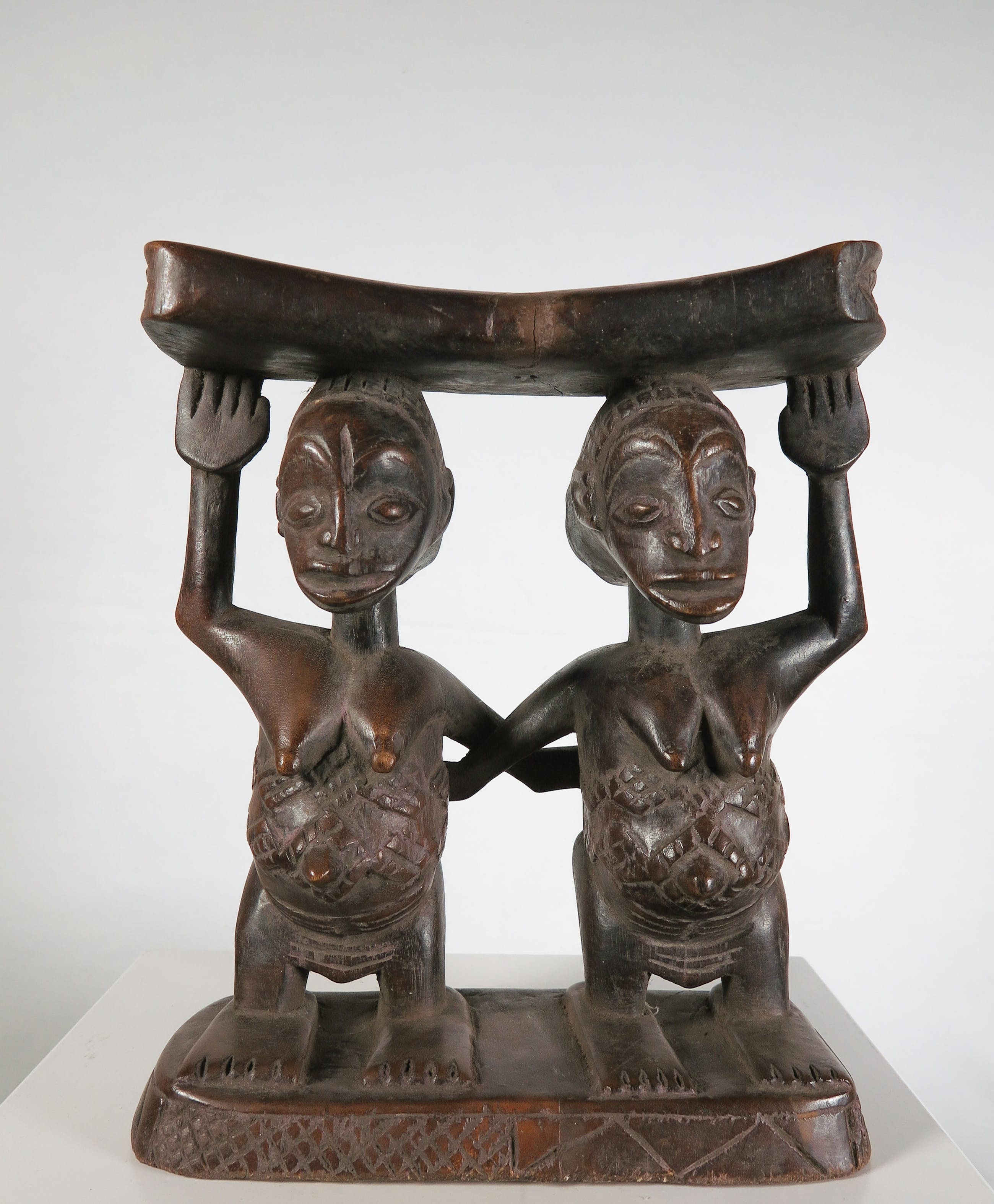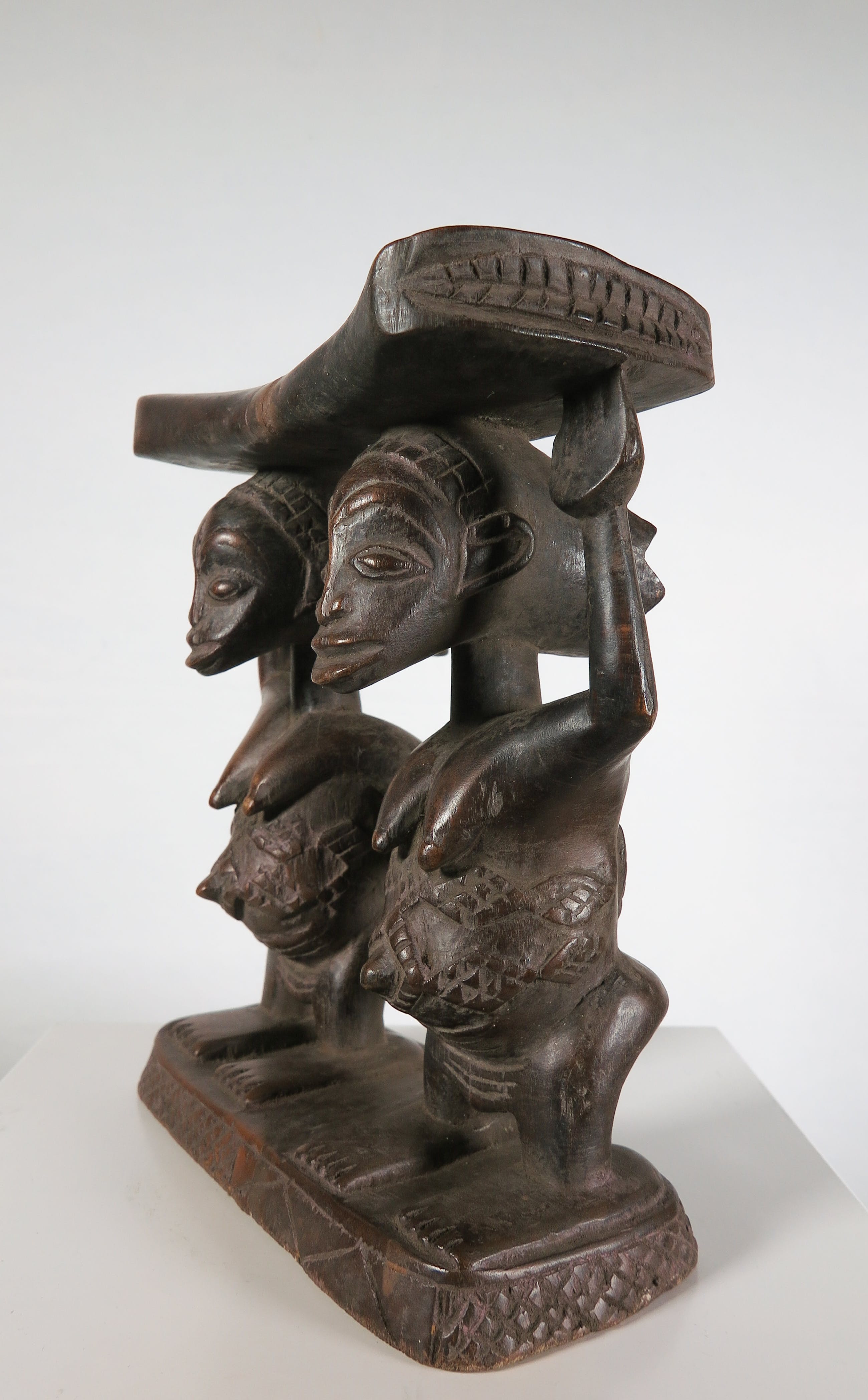 Sierlijk gestoken houten hoofdsteun, gedragen door twee vrouwfiguren met sierlijke haarddracht/tooien.