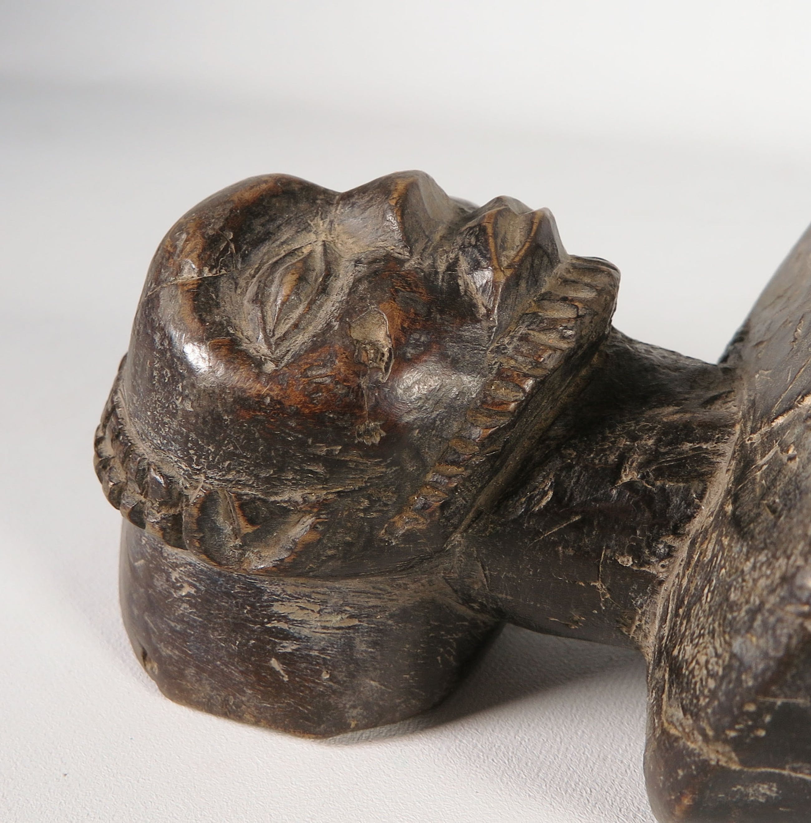 Houten gestoken Lubana neksteun bekroond met hoofden.