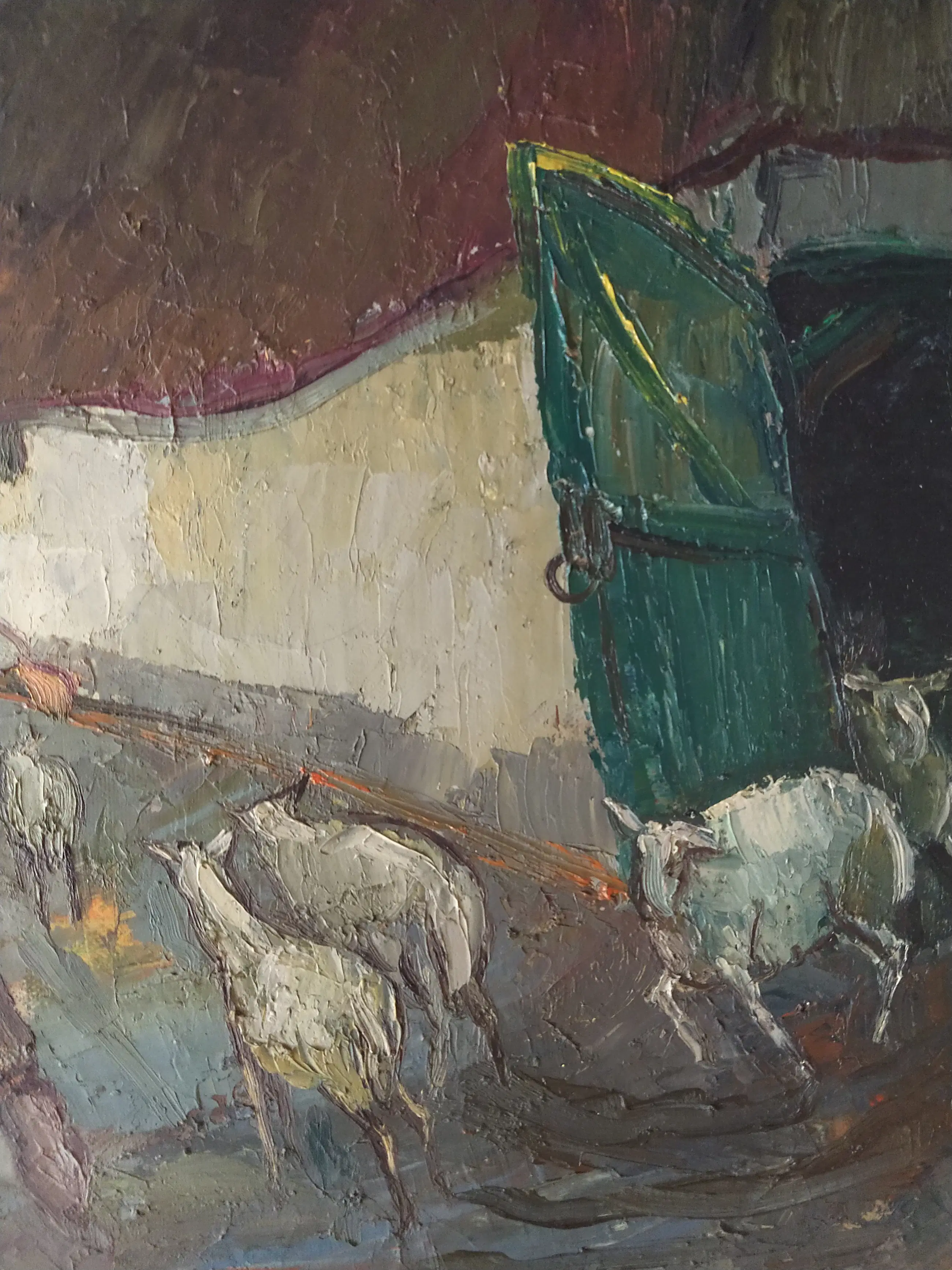 Luc Heirbaut (1919-2014). Boer en schapen met hooimijt in landschap. Olieverf op doek.  Het schilderij is in vrij goede staat met craquelé. De lijst is in goede staat met ouderdomssporen.