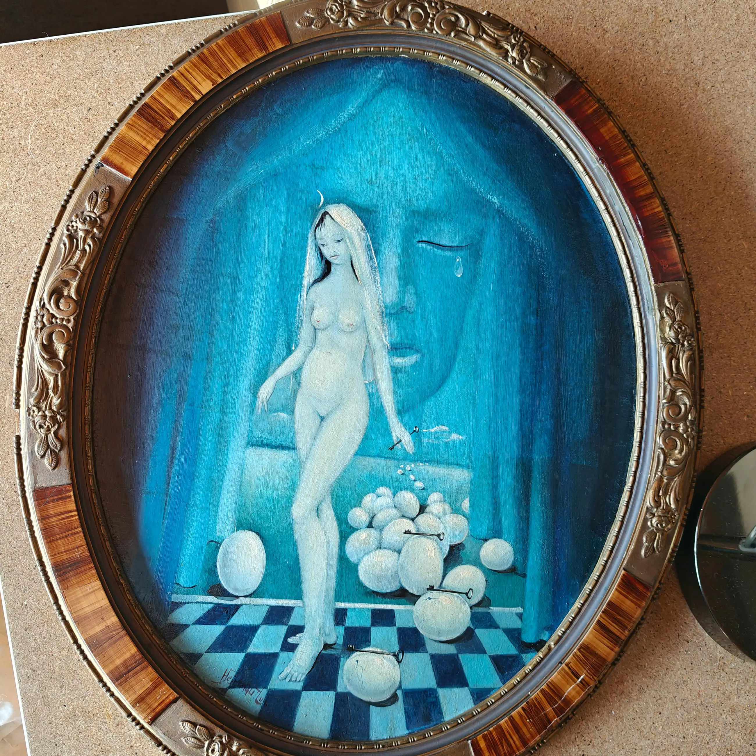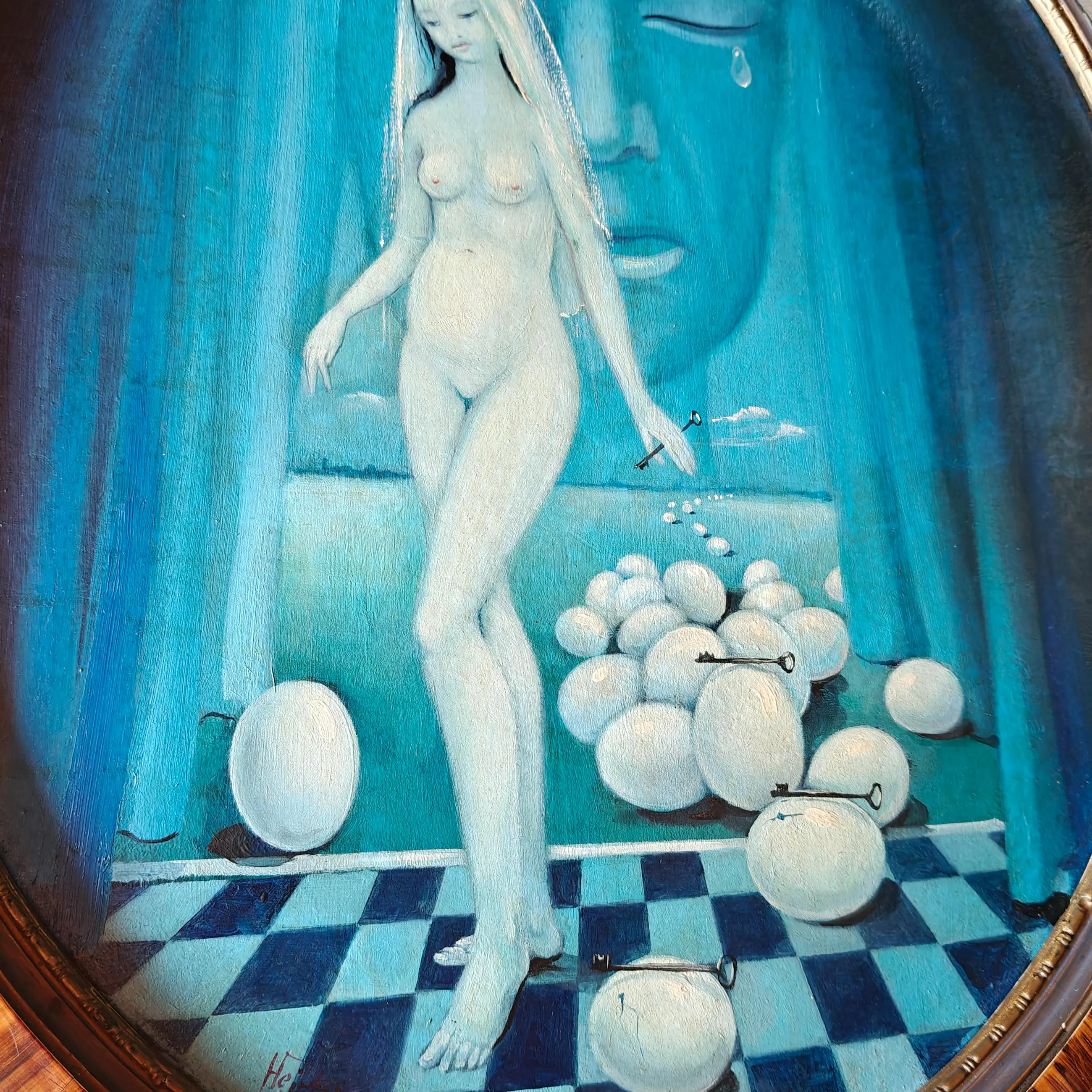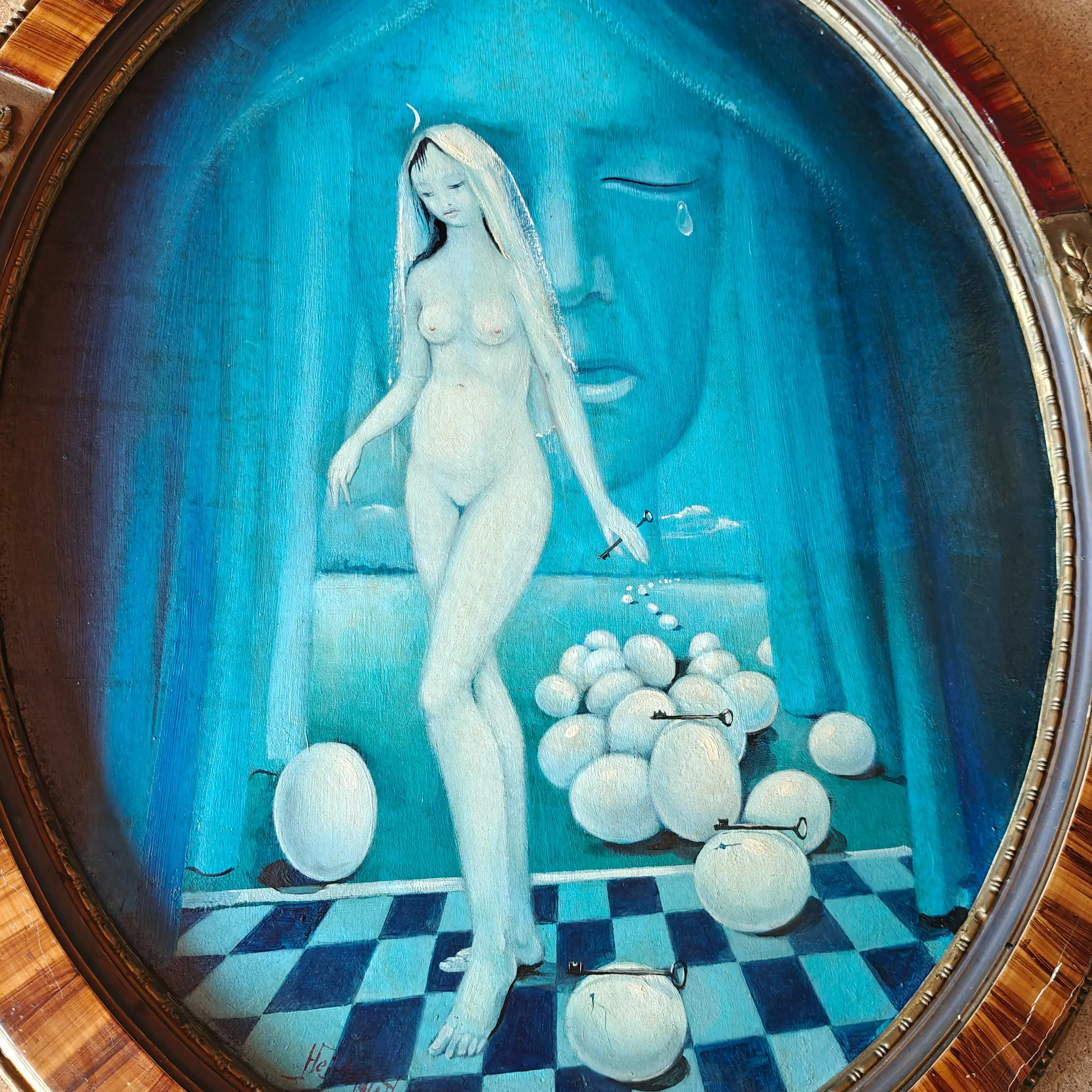 Dit werk trekt direct de aandacht: een serene naaktfiguur, zwevende symboliek (eieren, sleutels) en een diepblauw droomlandschap vol mysterie en emotie. De compositie voelt tijdloos aan – poëtisch, licht surrealistisch en onmiskenbaar een verzamelobject.