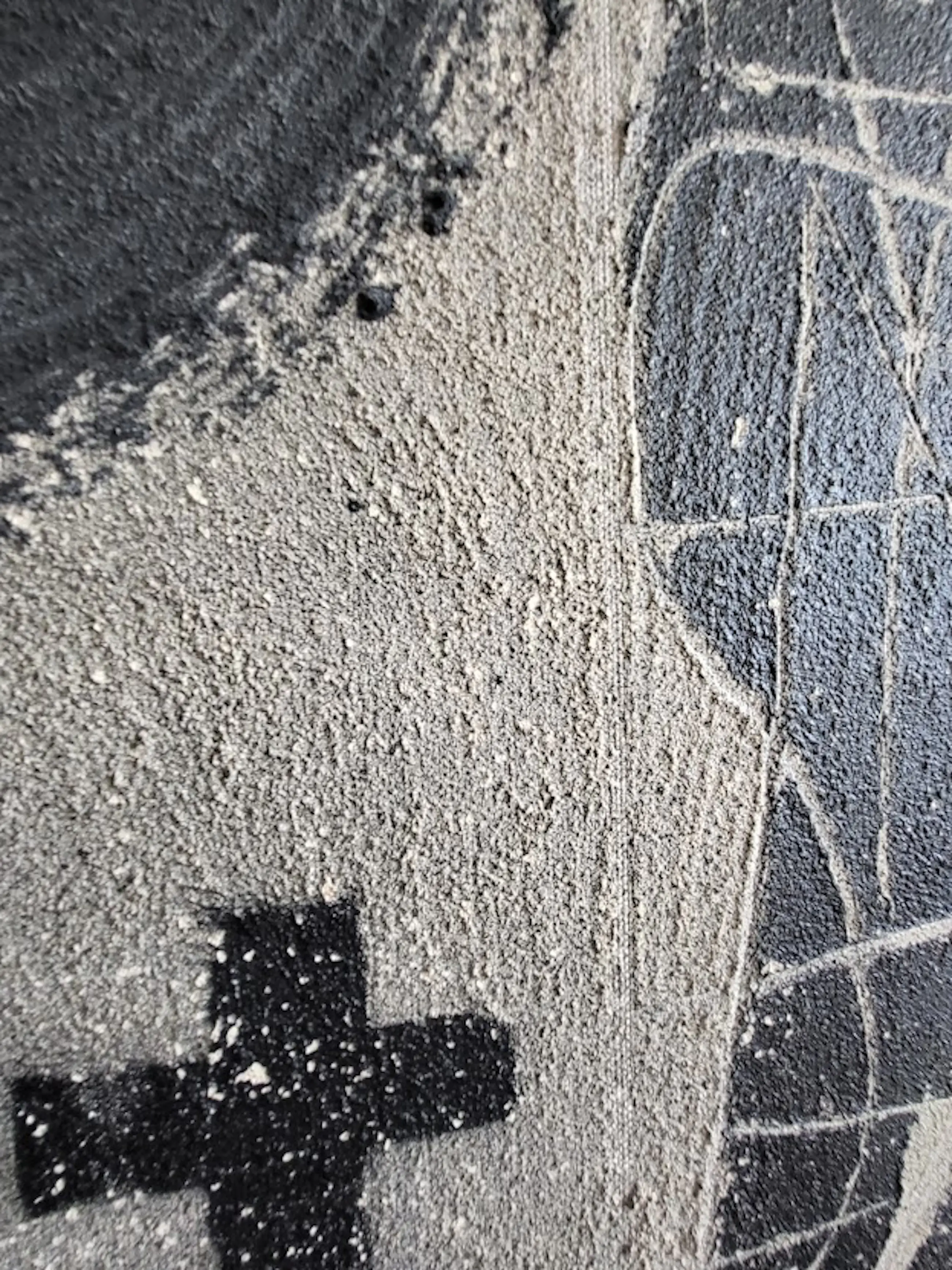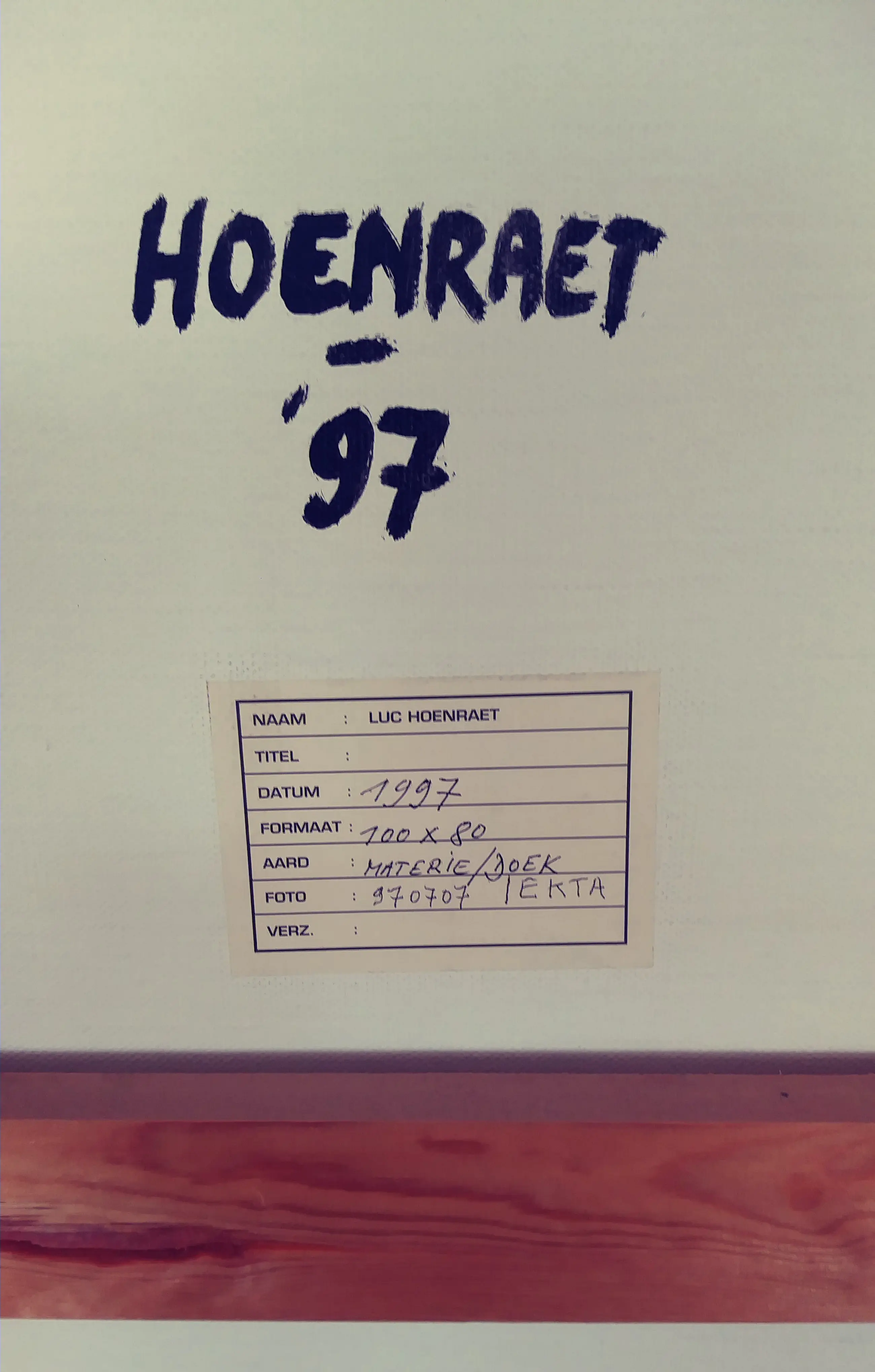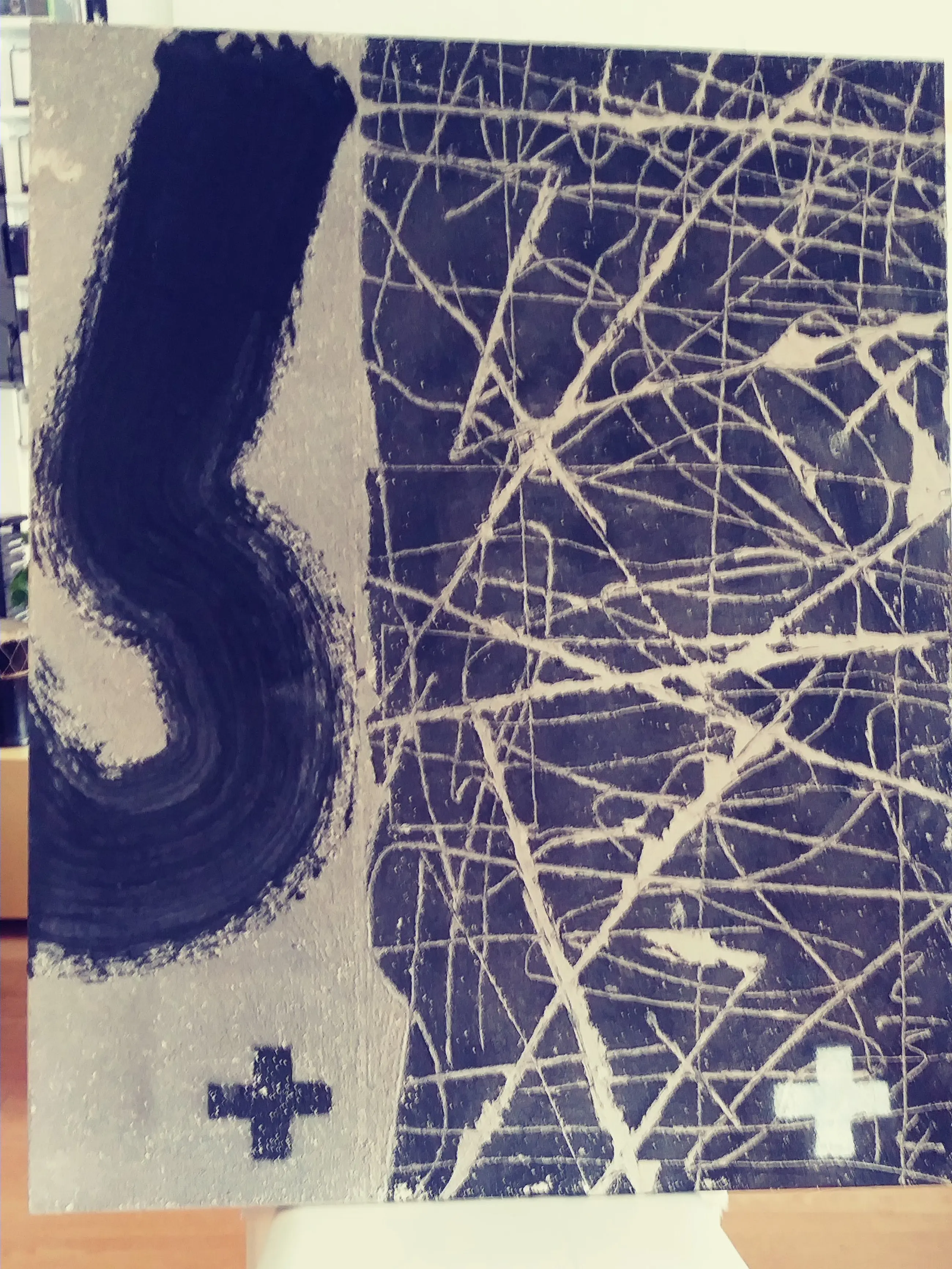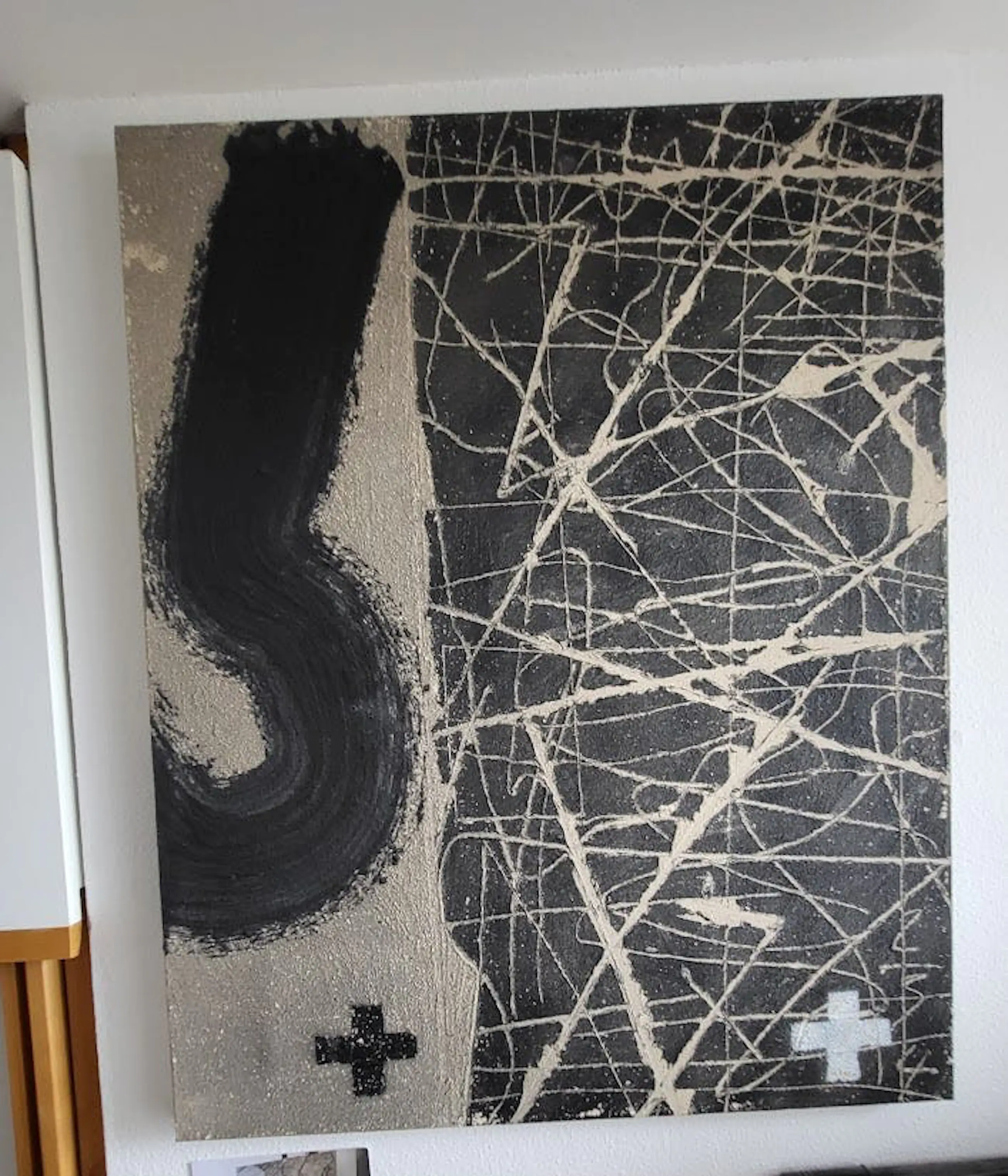 origineel schilderij gekocht op atelier (Brussel) van artiest in 1998 korrelige materie op doek, grijs, zwart, wit op rugzijde handgesigneerd + andere gegevens (zie foto 3 en 4) in perfecte staat
