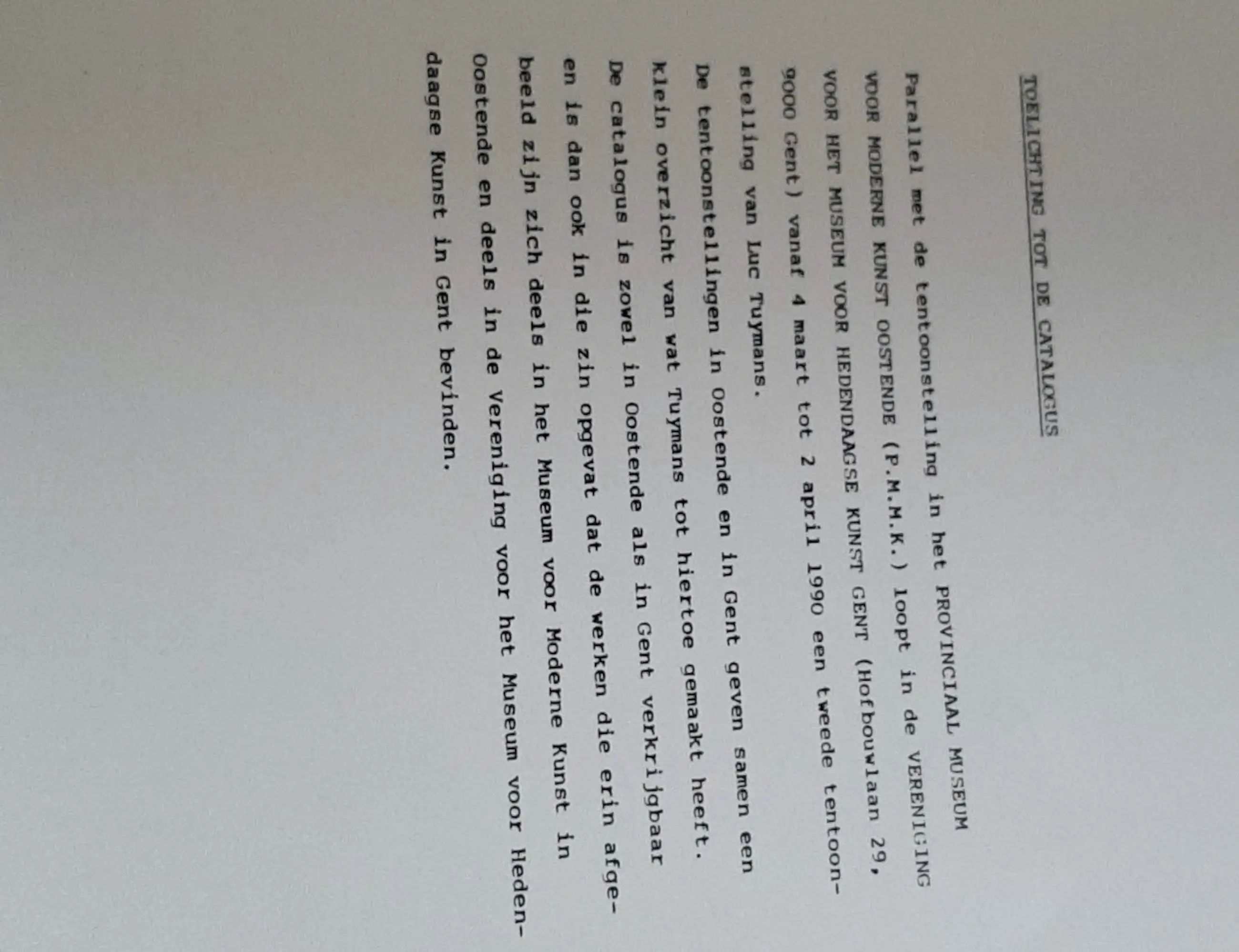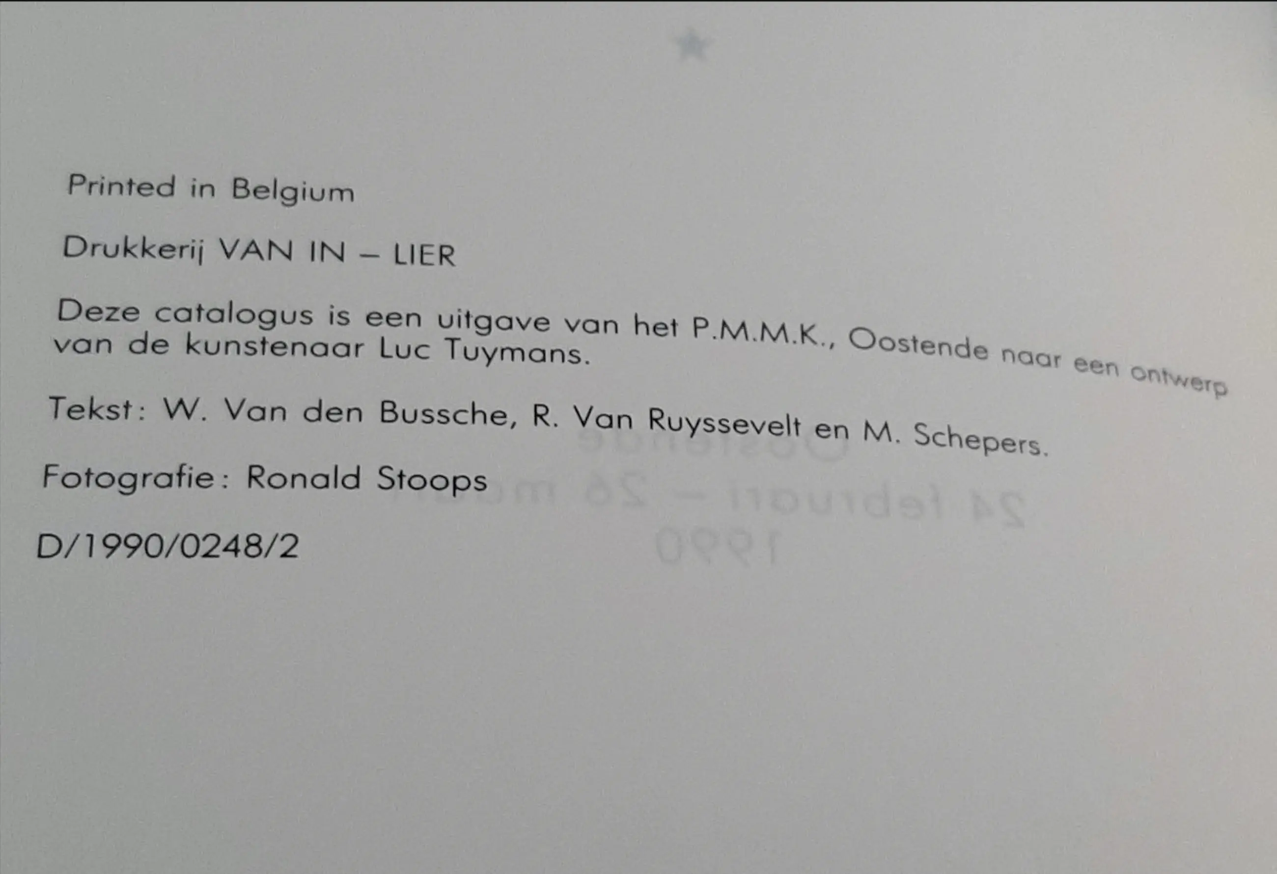 Catalogus van eerste grote tentoonstelling Luc Tuymans. 21 Afgebeelde schilderijen Qwadri druk. Met een originele toelichting en gesigneerd.
