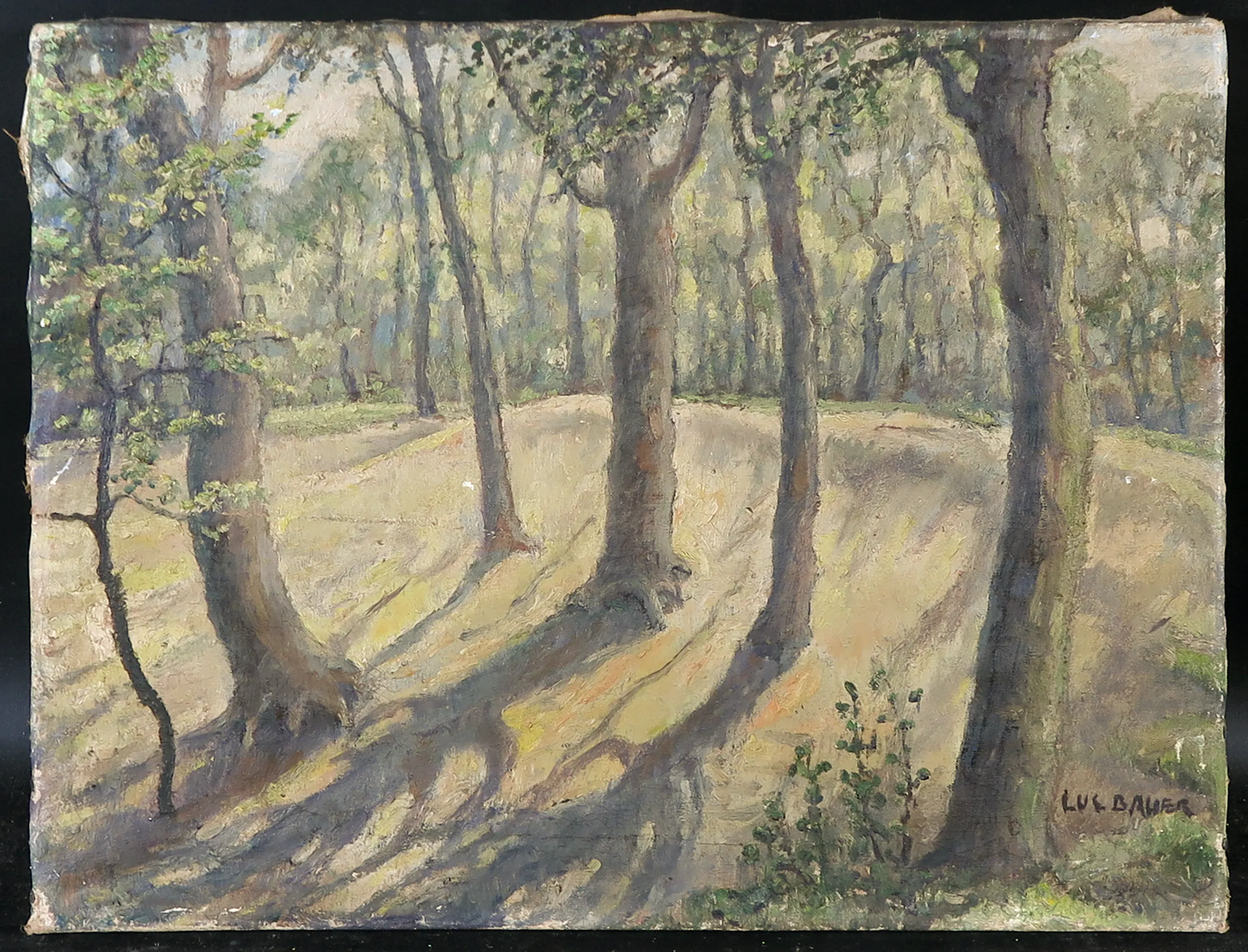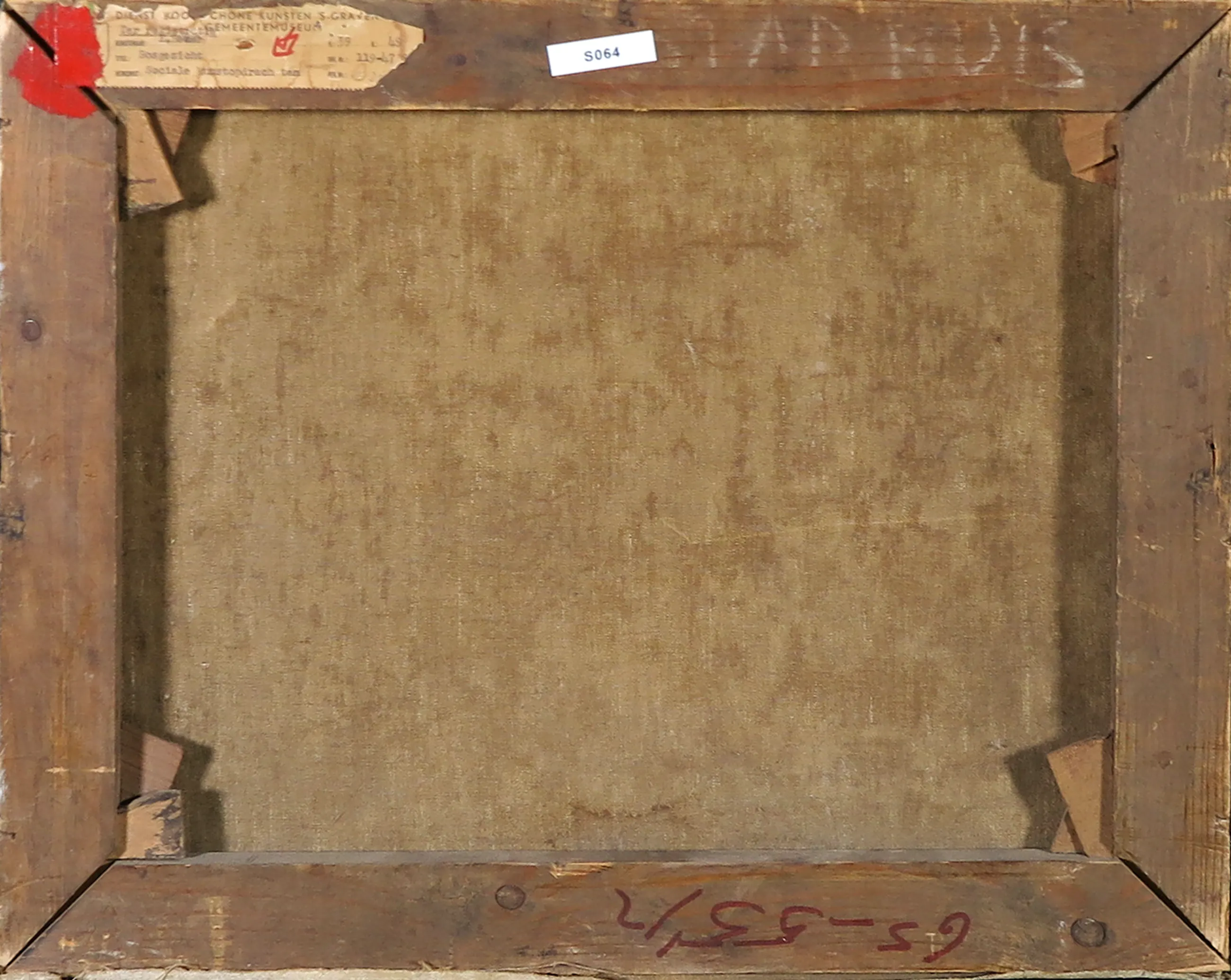 | Lichte golving in het doek. Langs de randen lichte slijtage van de verflaag. Aantal krassen in de verlaag en plekjes met verfverlies. | |