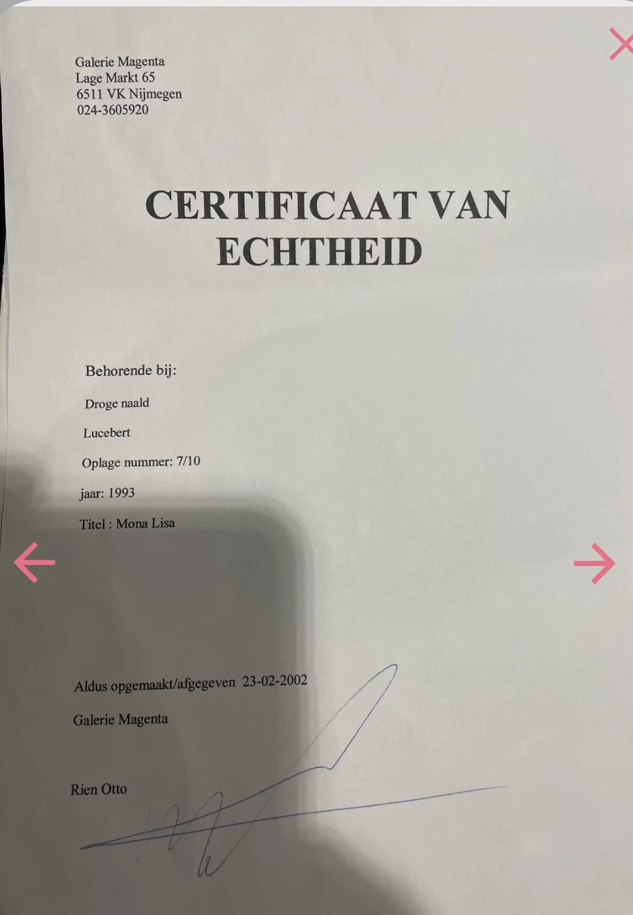 Ben u niet in staat om een werk zelf af te halen, dan kunt u een koeriersdienst inschakelen om het werk te laten afhalen. Klik hier voor meer informatie over hoe dit werkt en bekijk de tarieven.