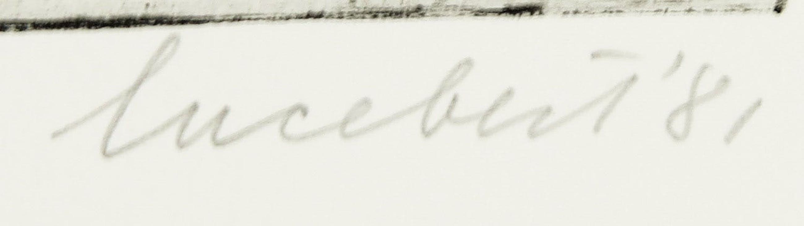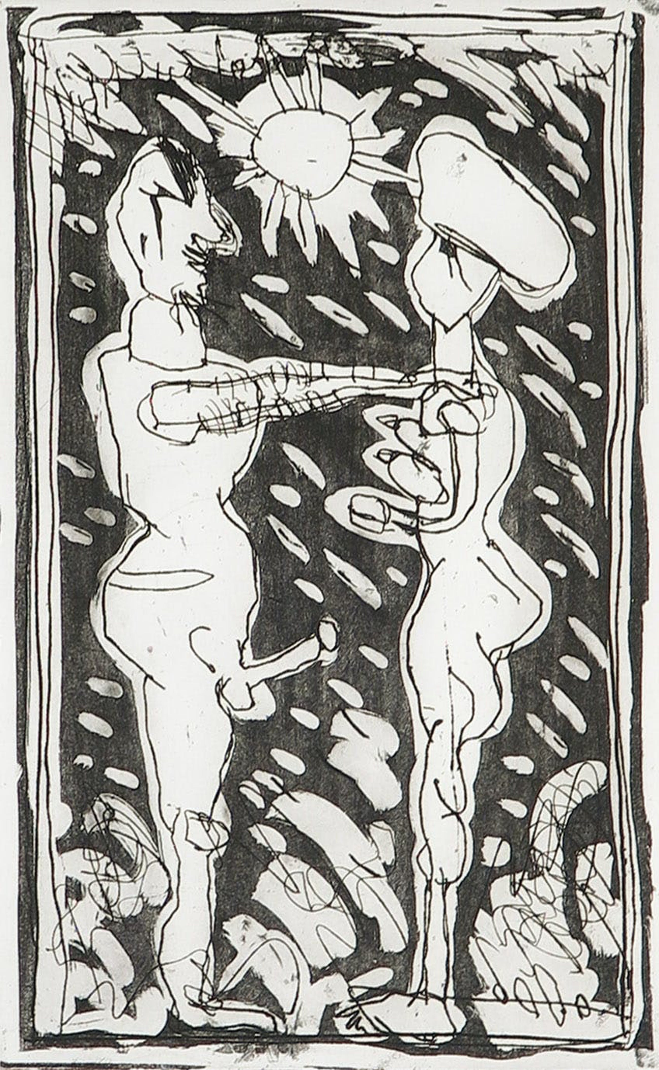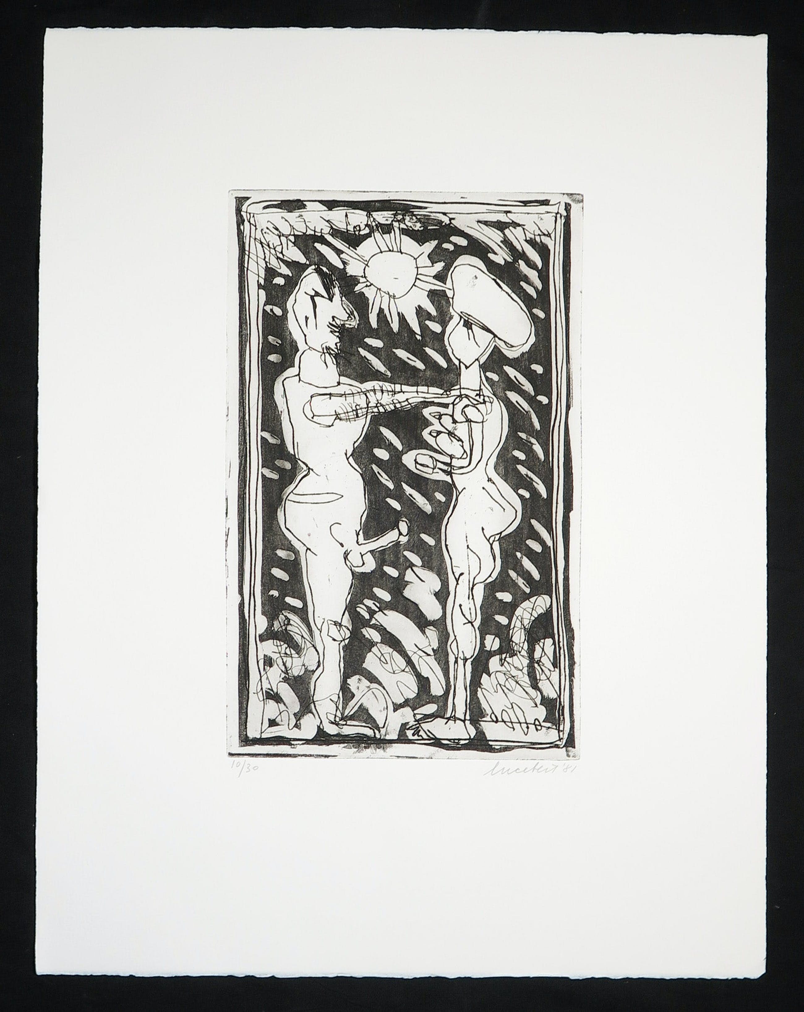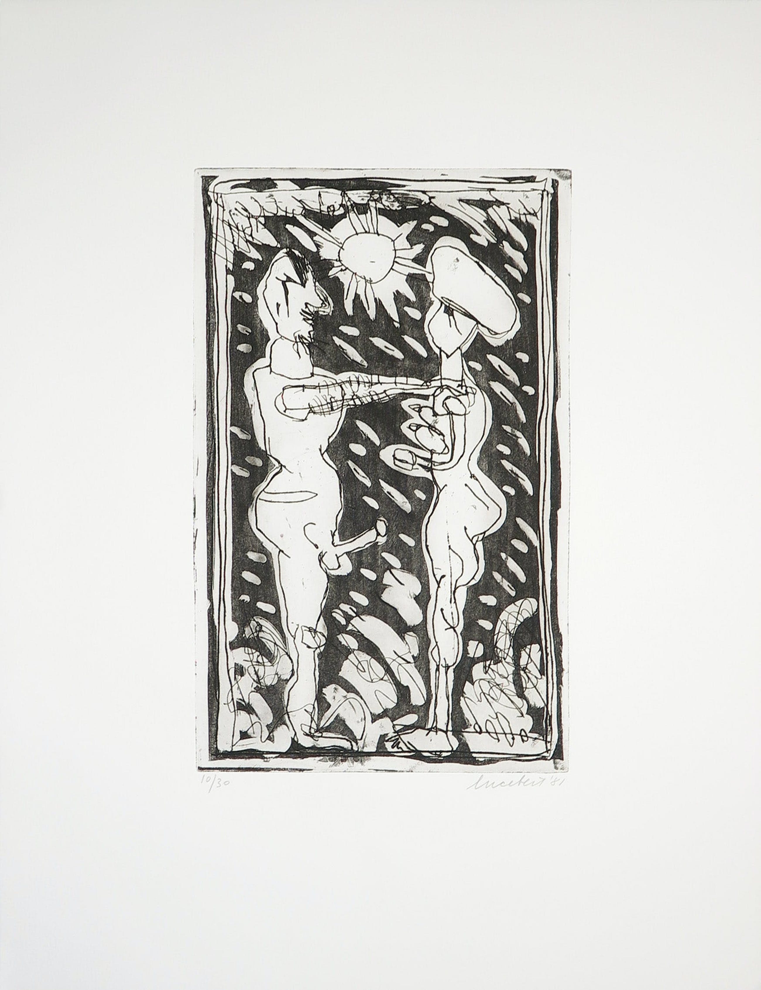 Ets van Lucebert uit de serie paradijs uitgegeven door galerie Nouvelles Images in 1981 met gedicht.