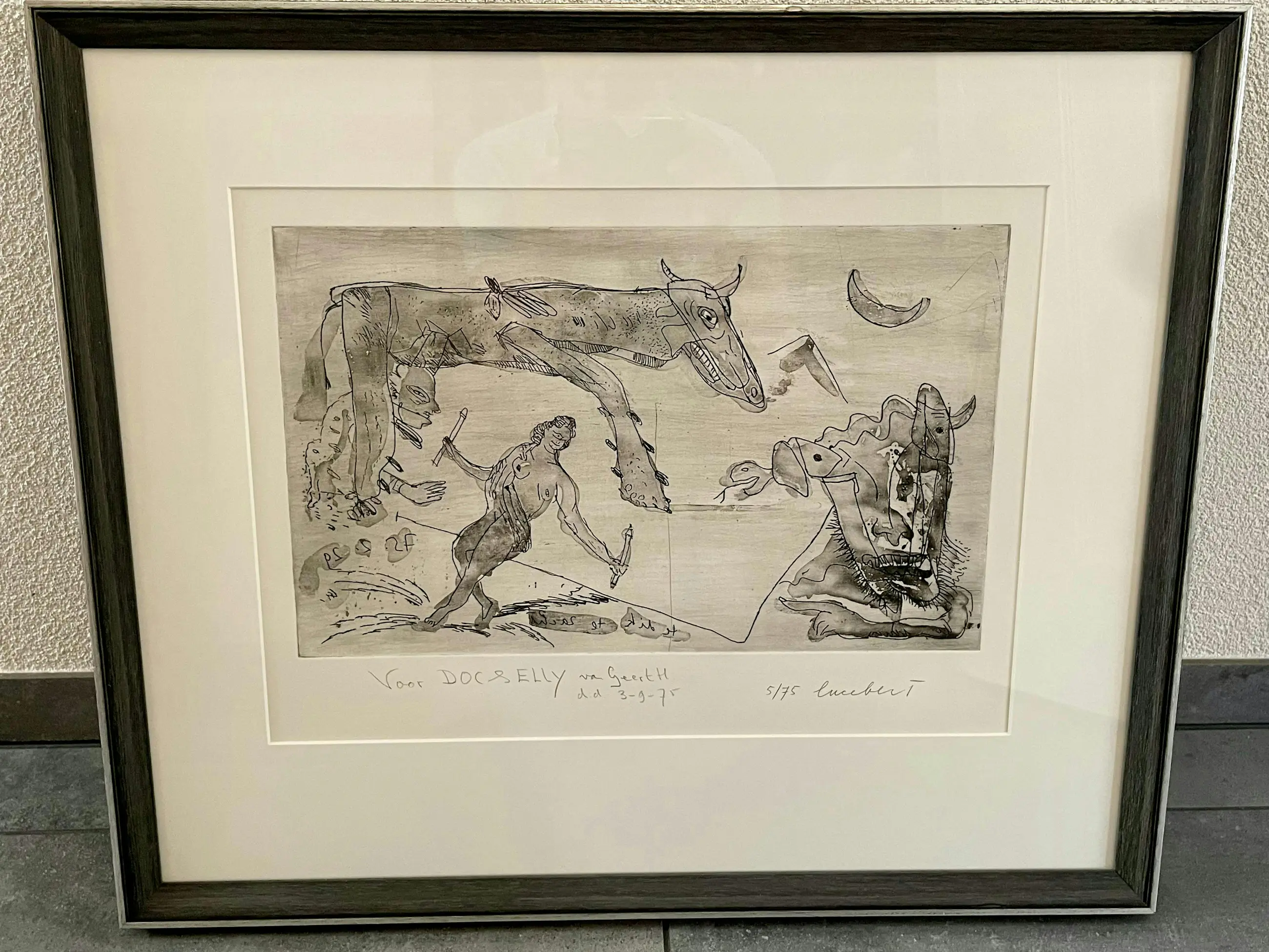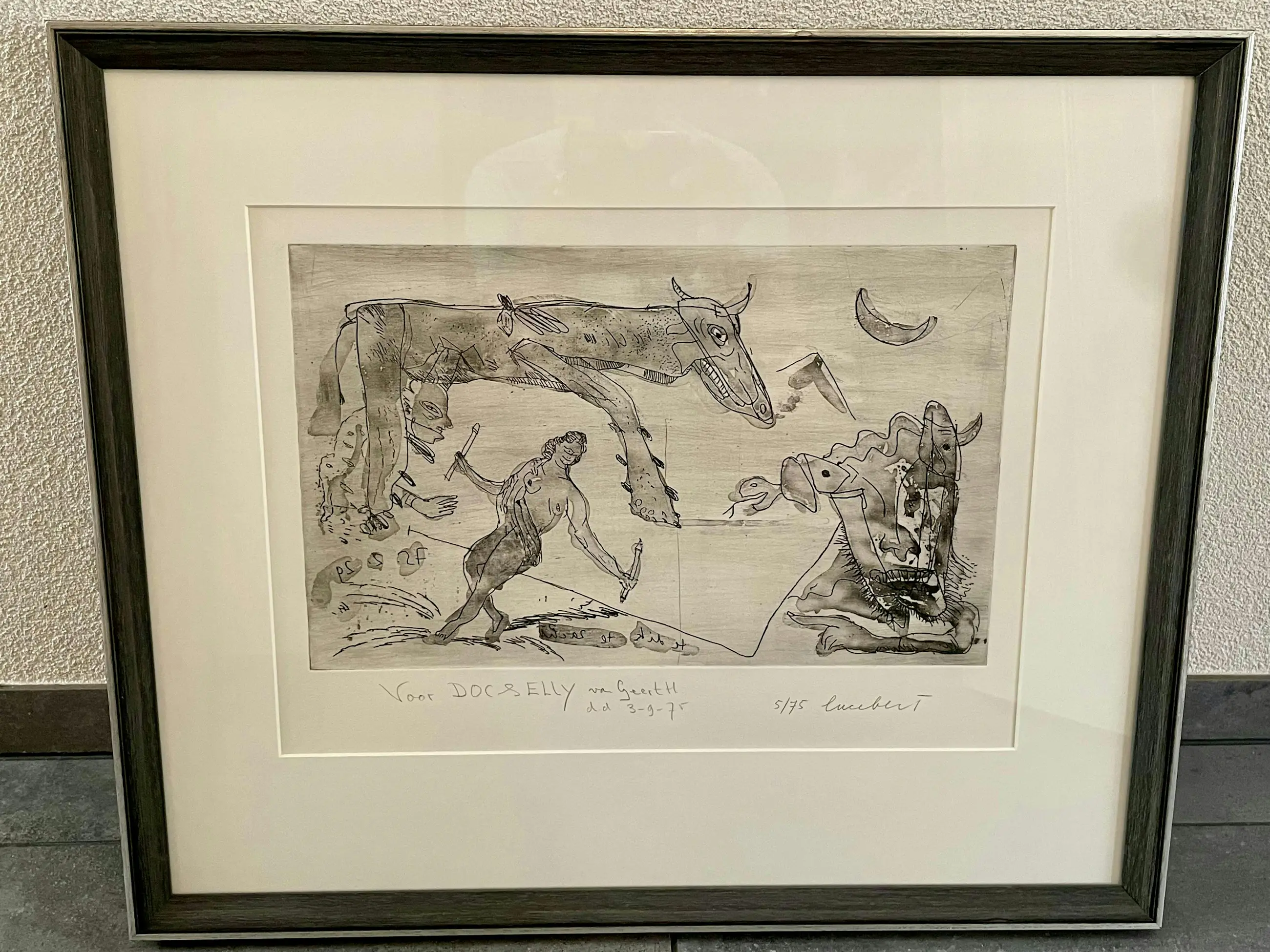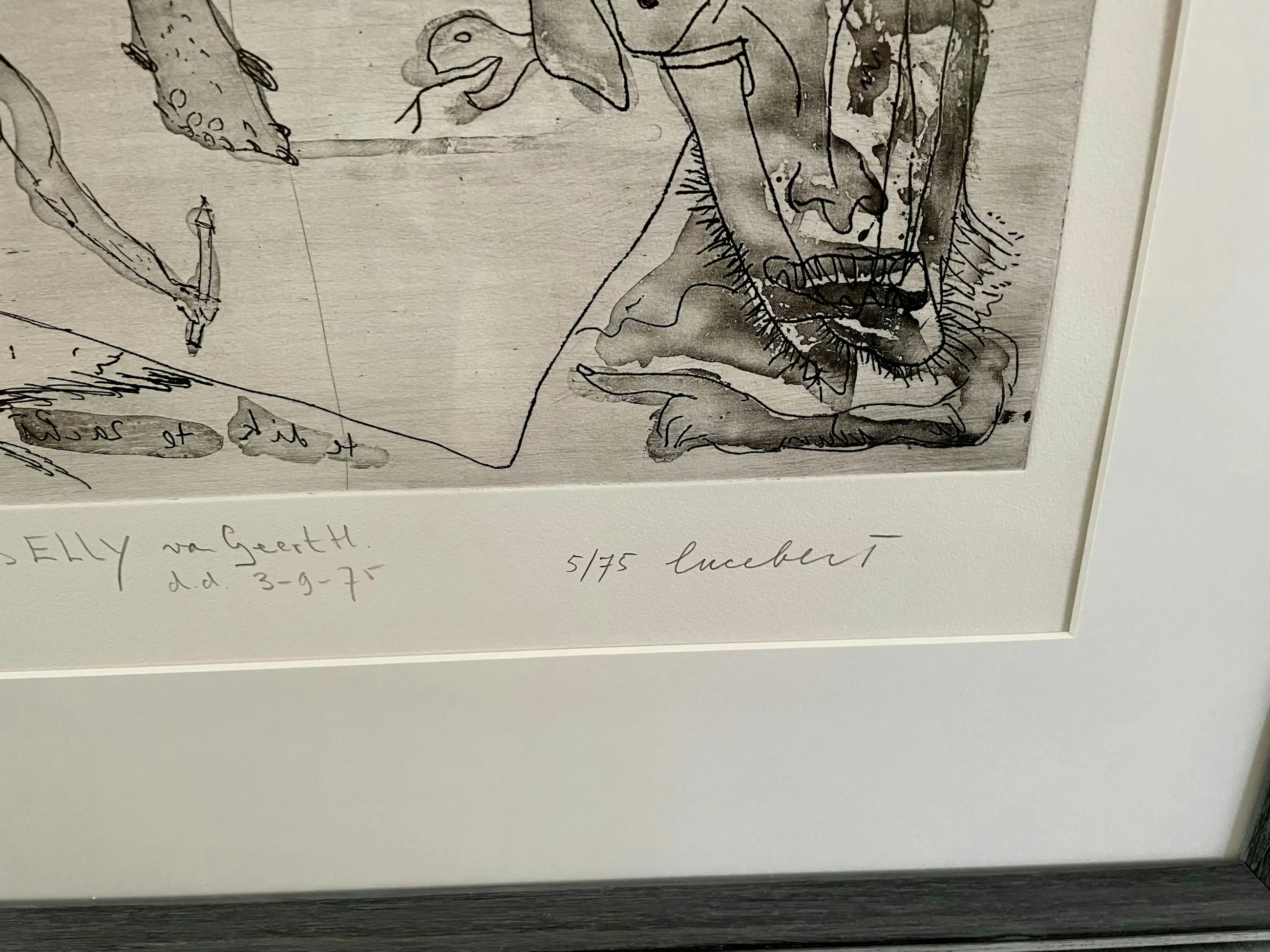 Prachtig werk van Lucebert - Dit keer een fraaie ets. De ets is geheel nieuw ingelijst door Lijstenmakerij Daleman uit Leiden. Feitelijk is het werk dus in nieuwstaat.