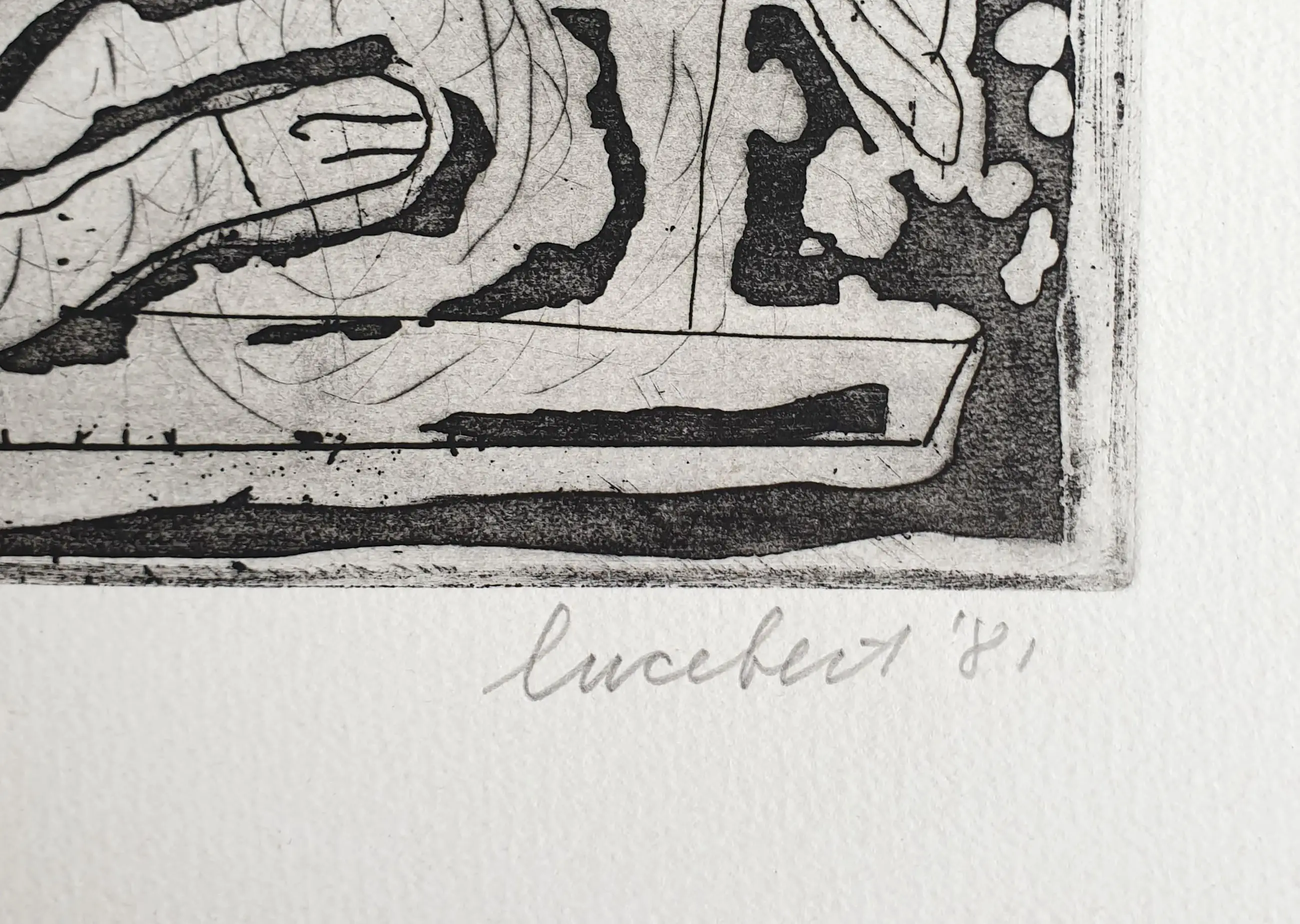 Ets van Lucebert met de titel: 'Paradijs' uit 1981. Het werk is rechtsonder met de hand gesigneerd door de kunstenaar.