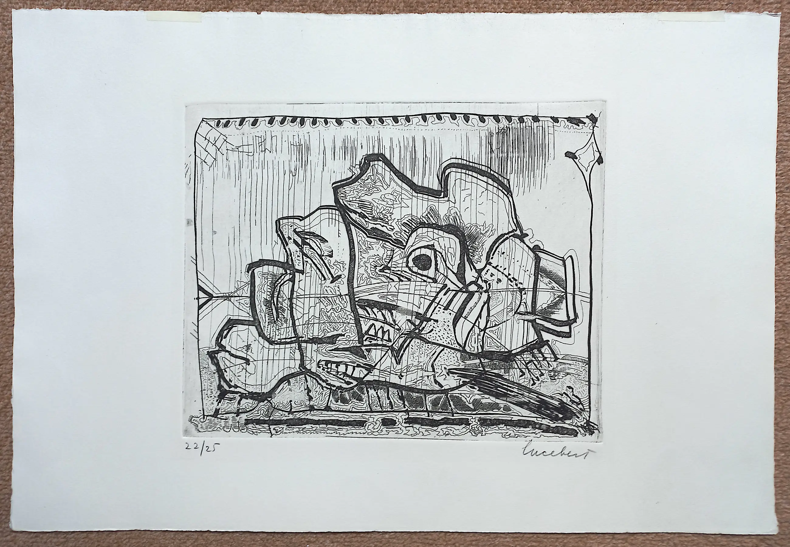 Mooi, relatief zeldzaam werk van Lucebert. Ets op geschept papier, met potlood gesigneerd en genummerd (22/25). In zeer goede conditie. Literatuur: Lucebert in het Stedelijk, 723-G.