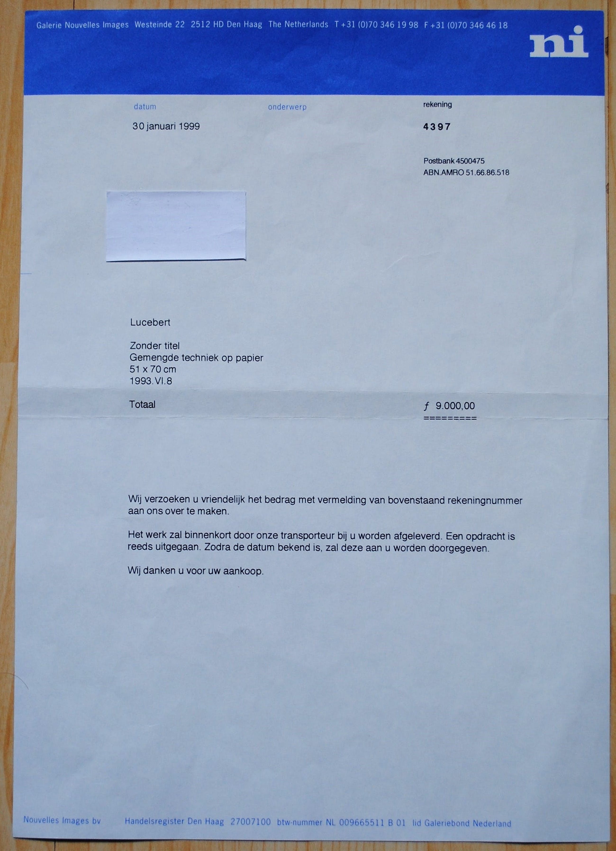 Het werk is in 1999 gekocht bij Galerie Nouvelles Images te Den Haag; zij hebben het inlijsten verzorgd. Originele aankoopnota gaat mee (zie foto 6).