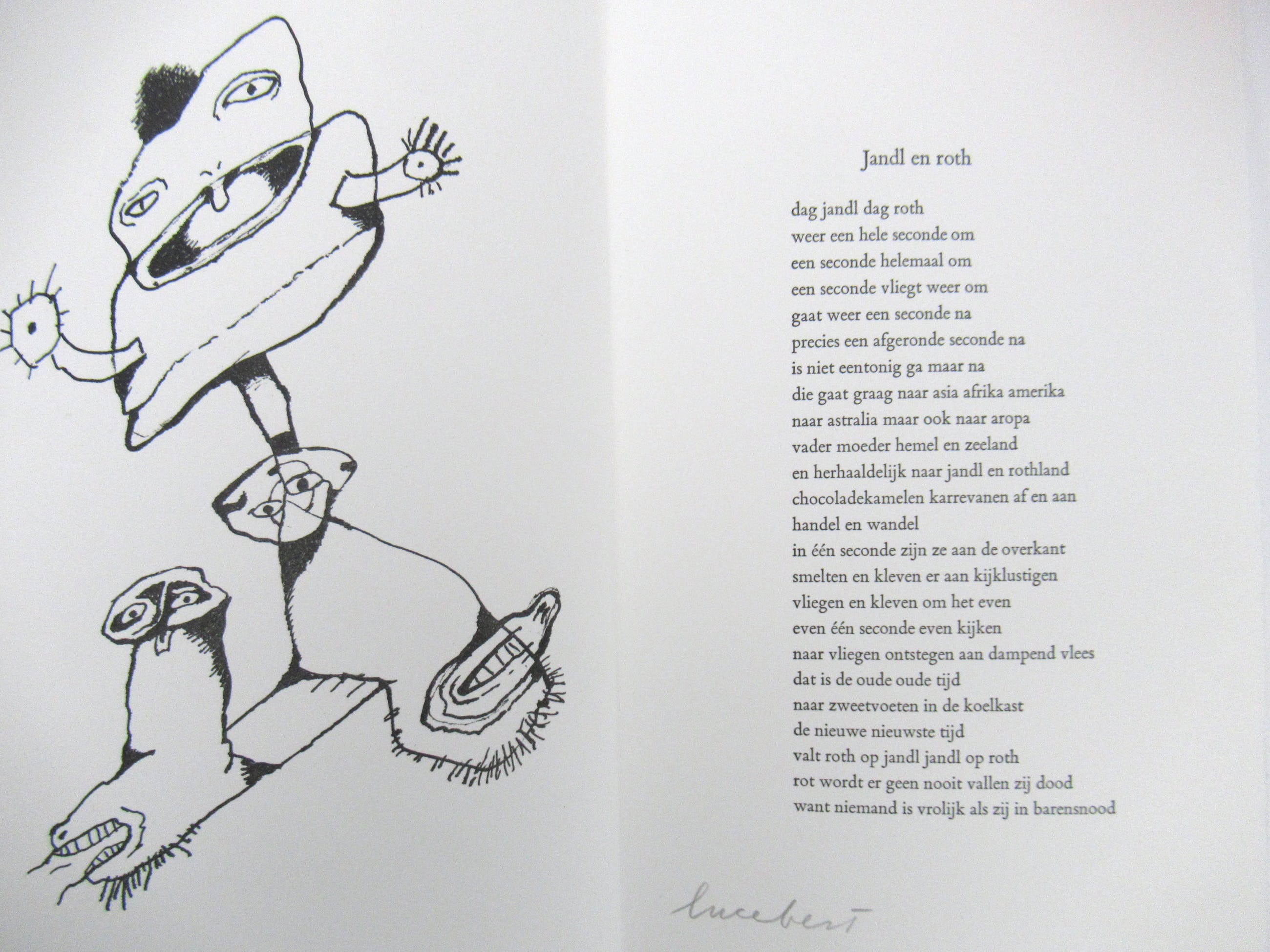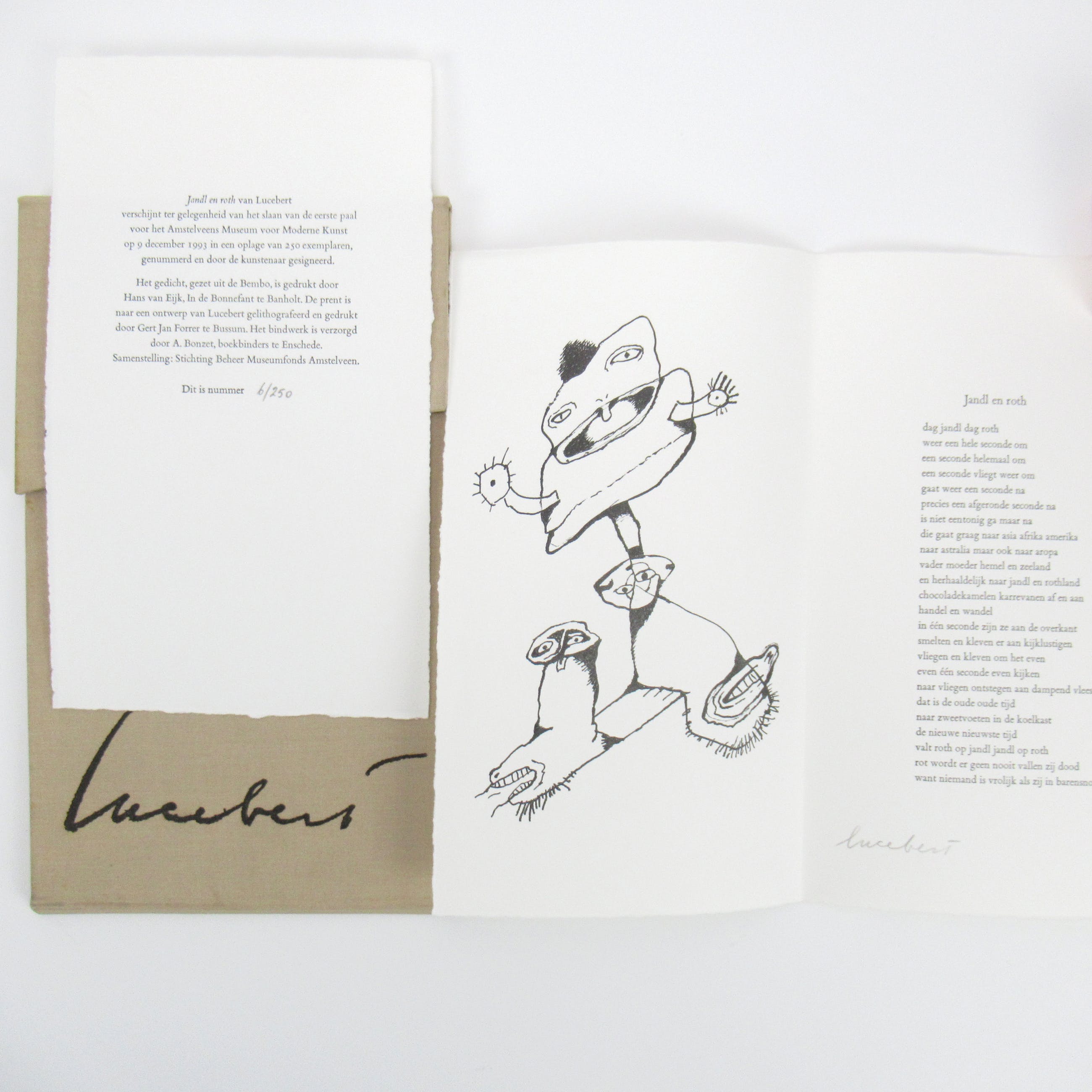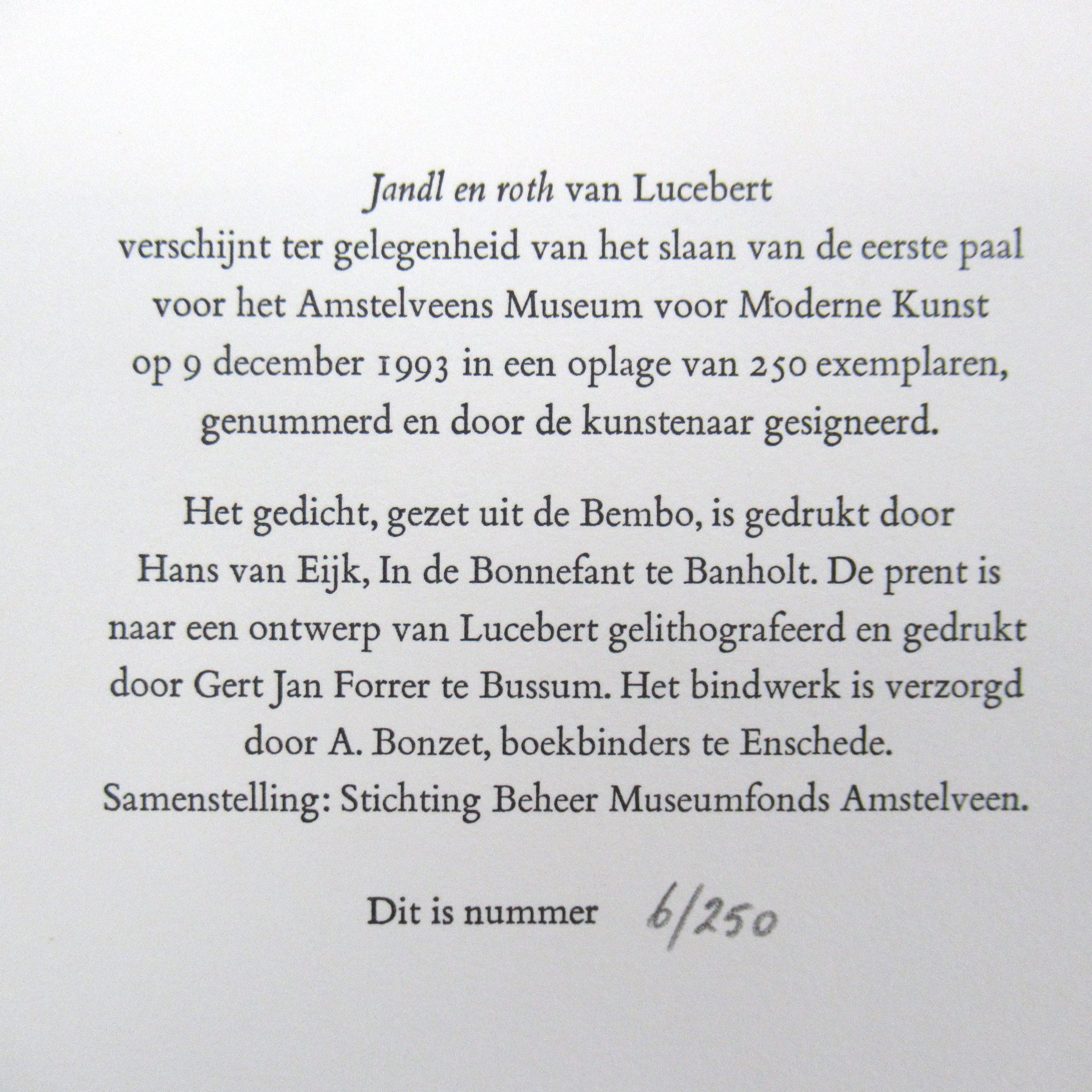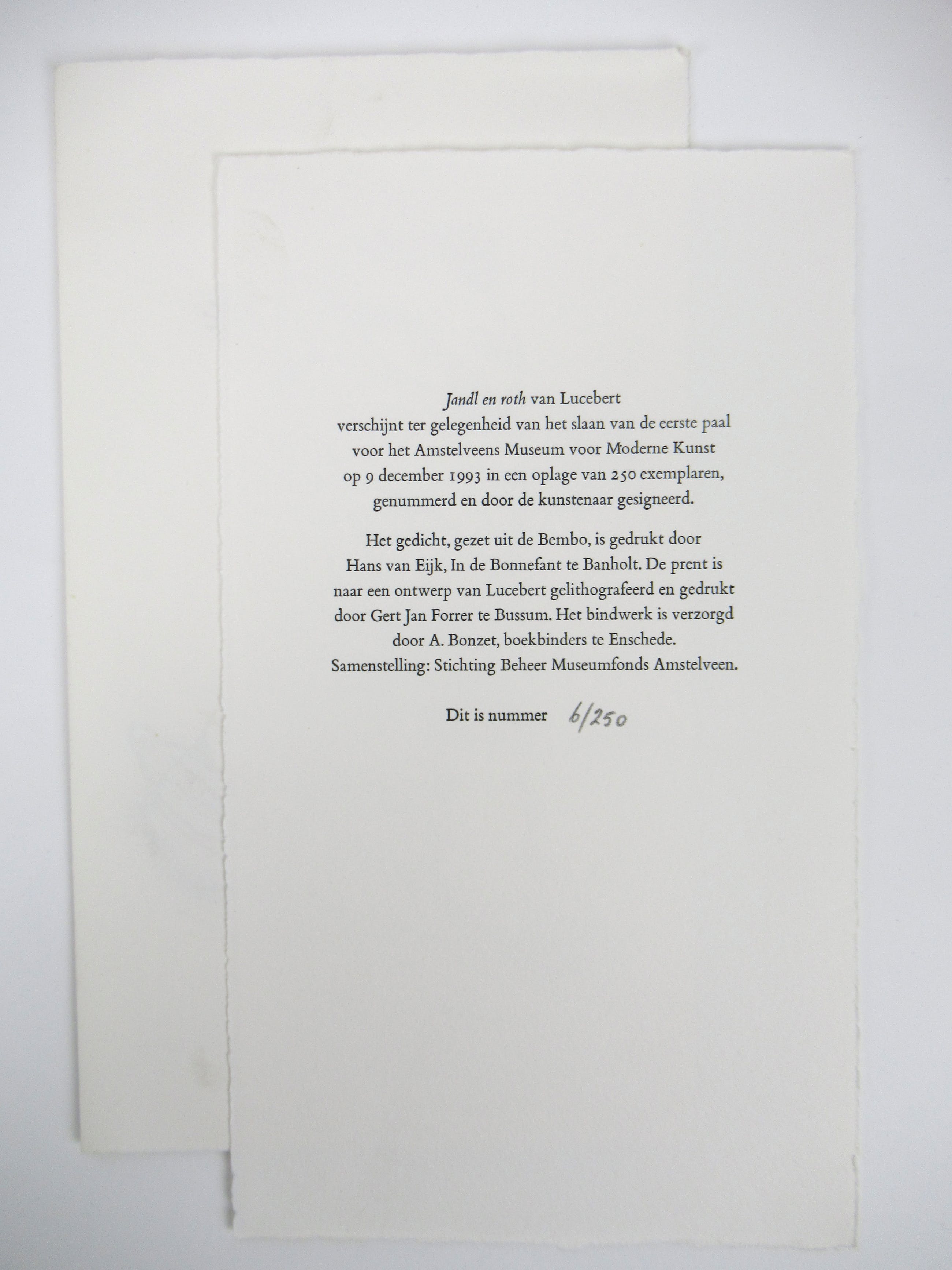 Beige linnen mapje (31 x 18,5 cm.) met asymmetrische overslaande boven- en onderflap en zwarte drukknoop. Goudkleurig gemarmerd openslaand binnenblad, met daarin een vouwblad van geschept papier, 28 x 16 cm (enkel), met binnenin links de zeefdruk is naar ontwerp van Lucebert en gedrukt door Gert Jan Forrer. Aan de rechterzijde het gedicht 'Jandl en roth'. Gesigneerd in potlood onder het gedicht.
