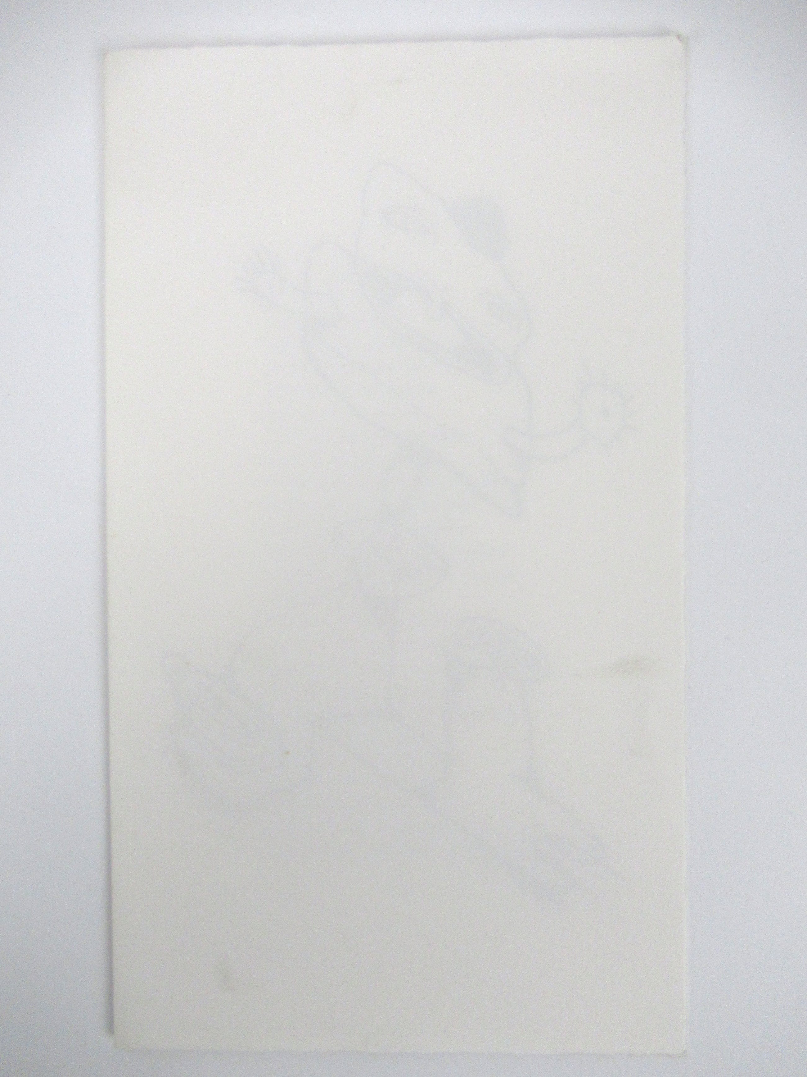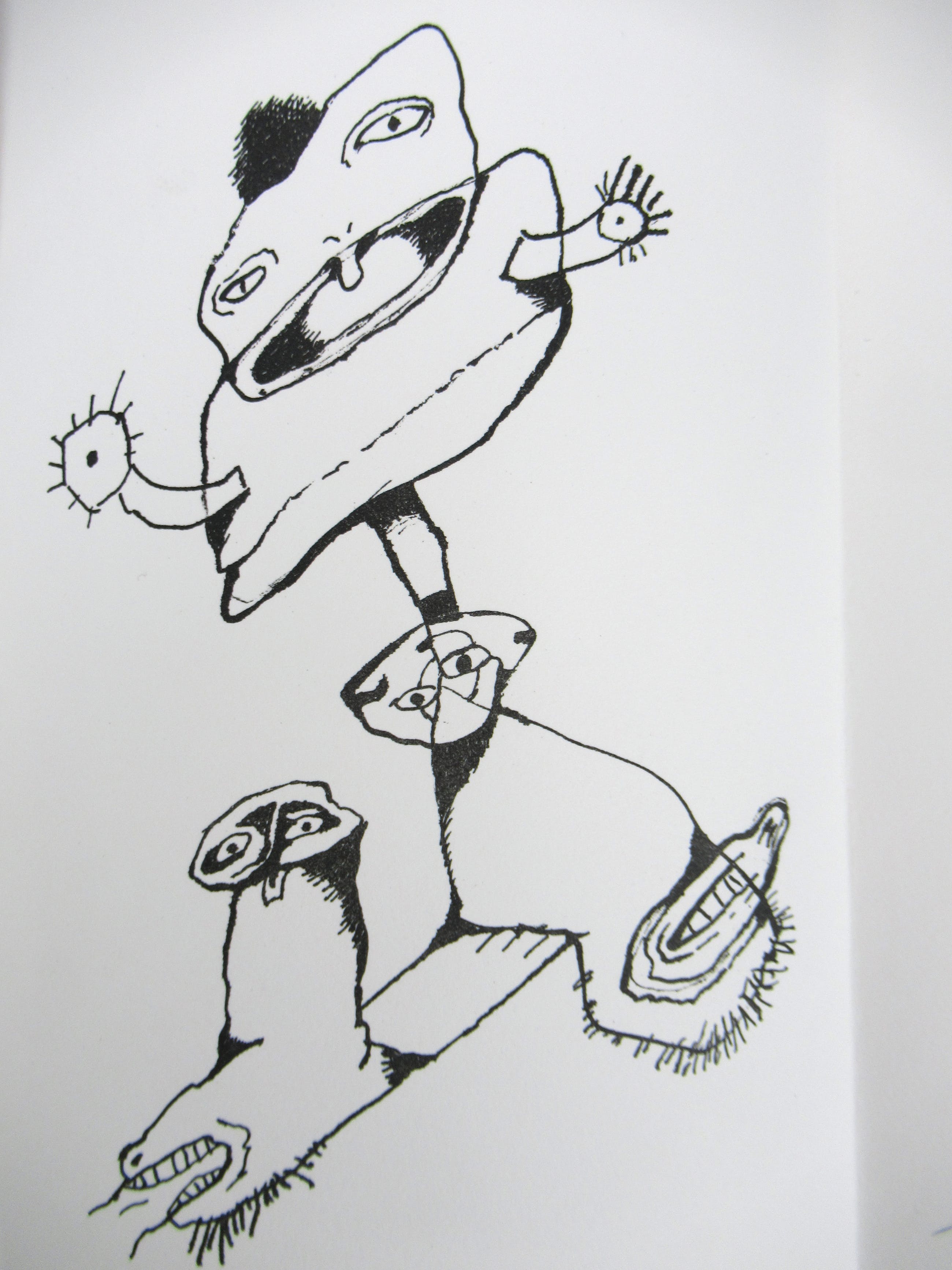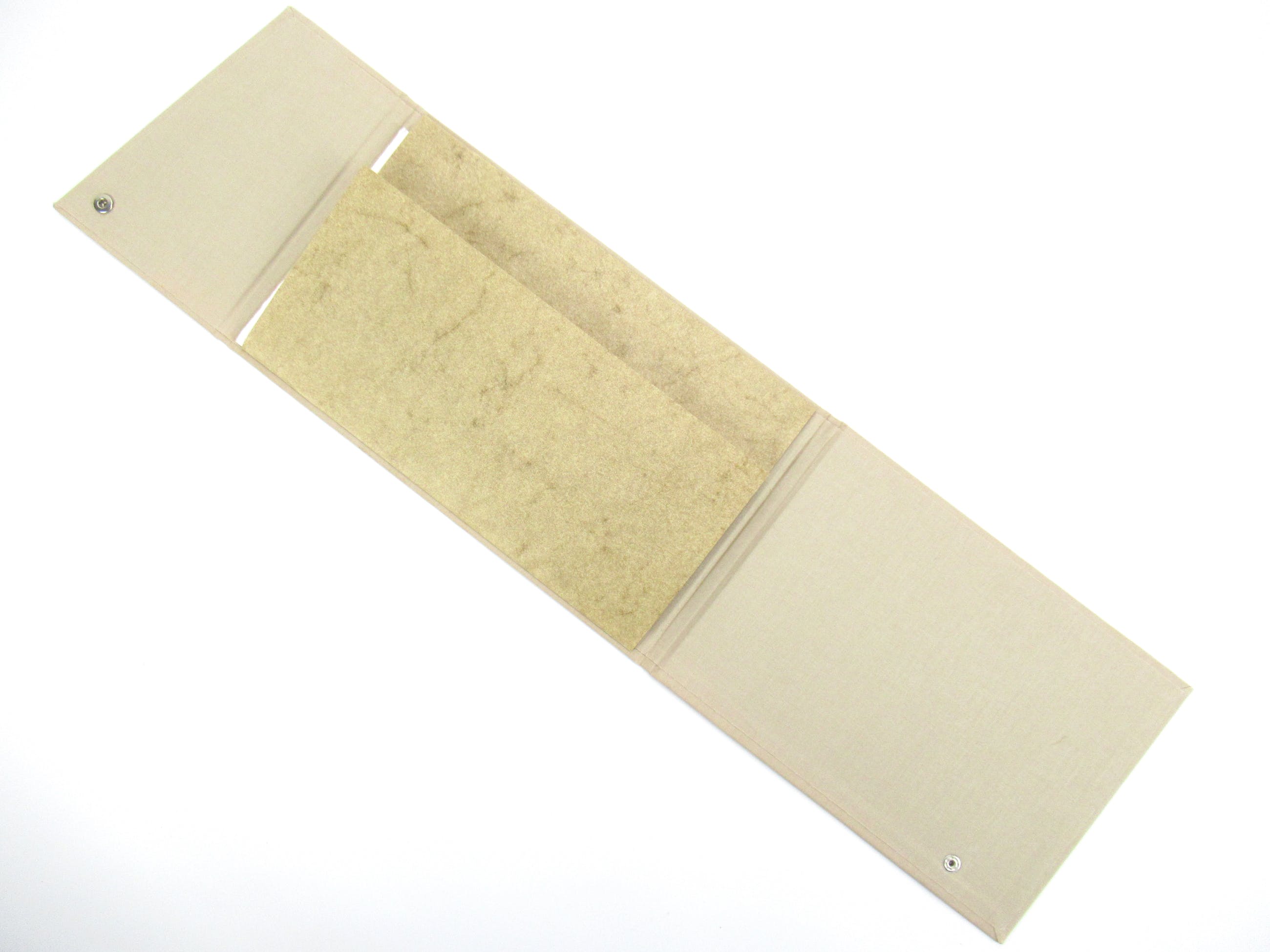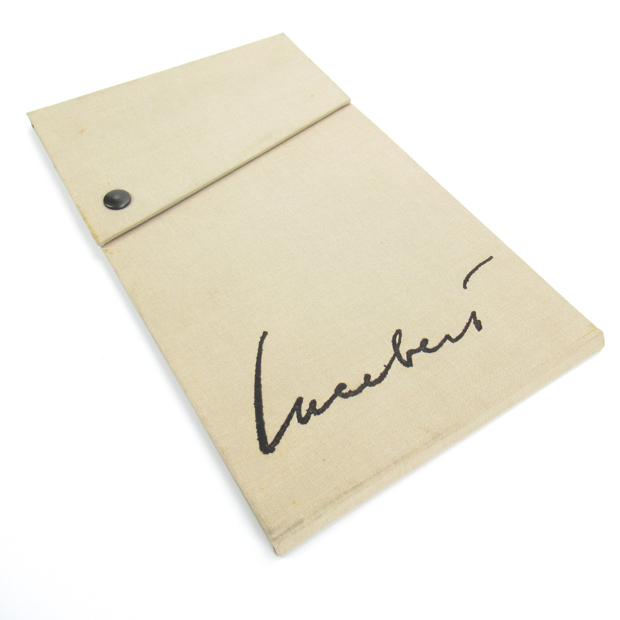 Beige linnen mapje (31 x 18,5 cm.) met asymmetrische overslaande boven- en onderflap en zwarte drukknoop. Goudkleurig gemarmerd openslaand binnenblad, met daarin een vouwblad van geschept papier, 28 x 16 cm (enkel), met binnenin links de zeefdruk is naar ontwerp van Lucebert en gedrukt door Gert Jan Forrer. Aan de rechterzijde het gedicht 'Jandl en roth'. Gesigneerd in potlood onder het gedicht.