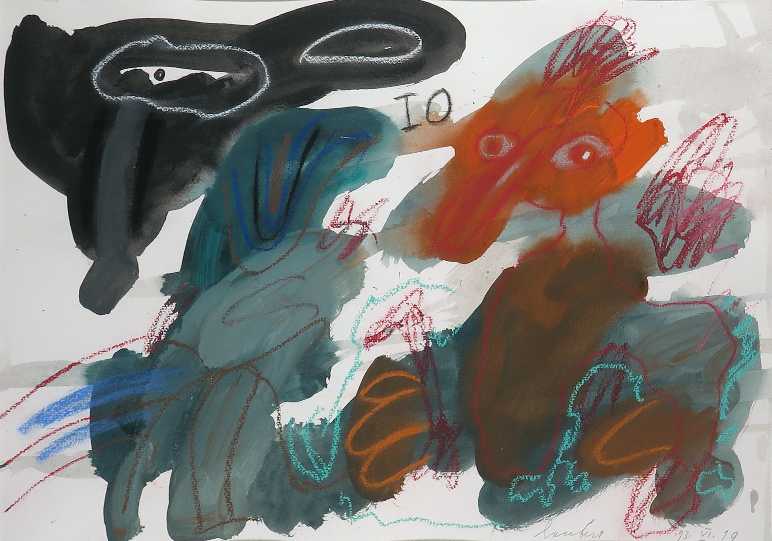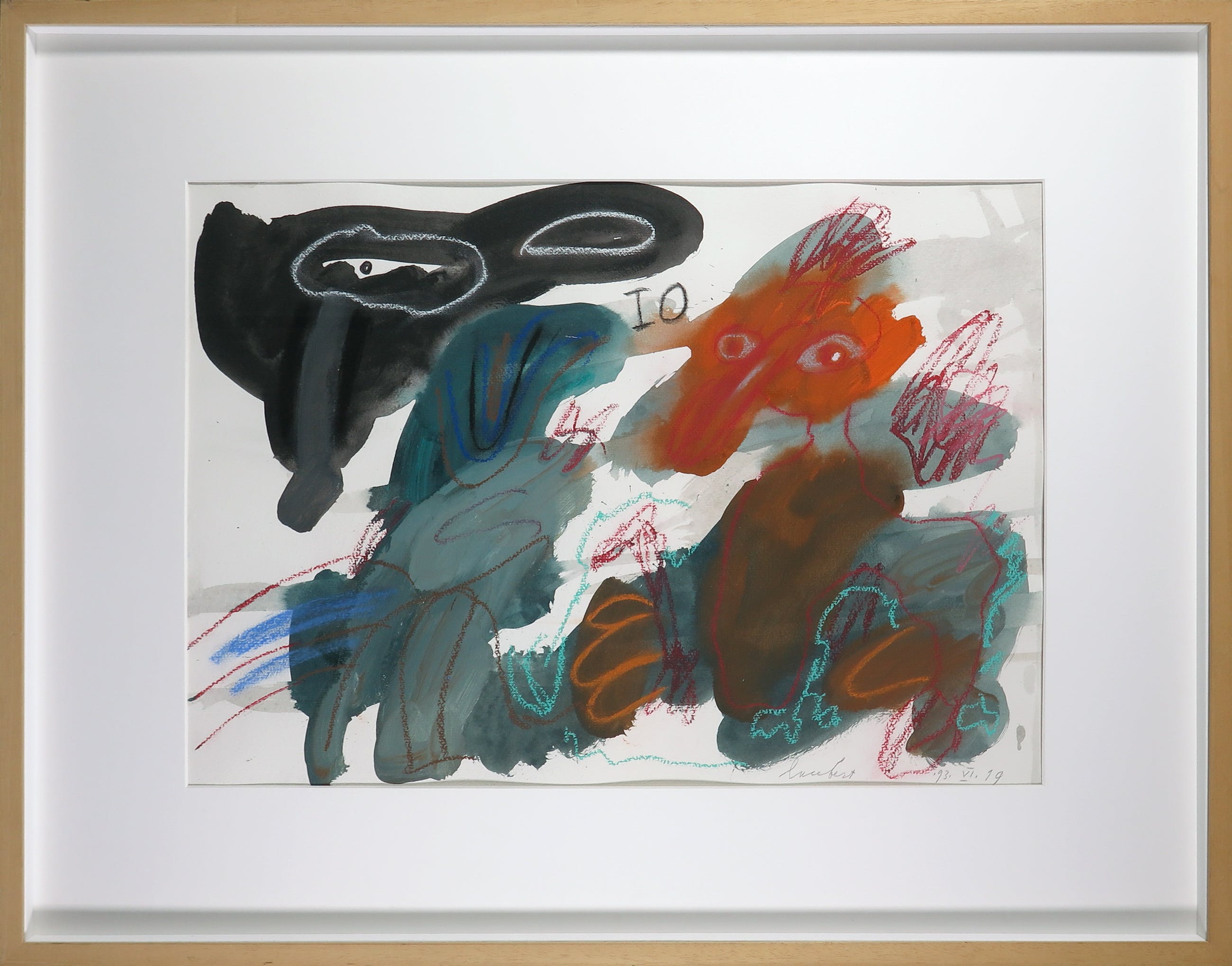 Krachtige tekening, bestaande uit onder andere gouache, aquarel en pastelkrijt, op papier. Het kleurgebruik is ingetogen maar toch ook zeer sterk.