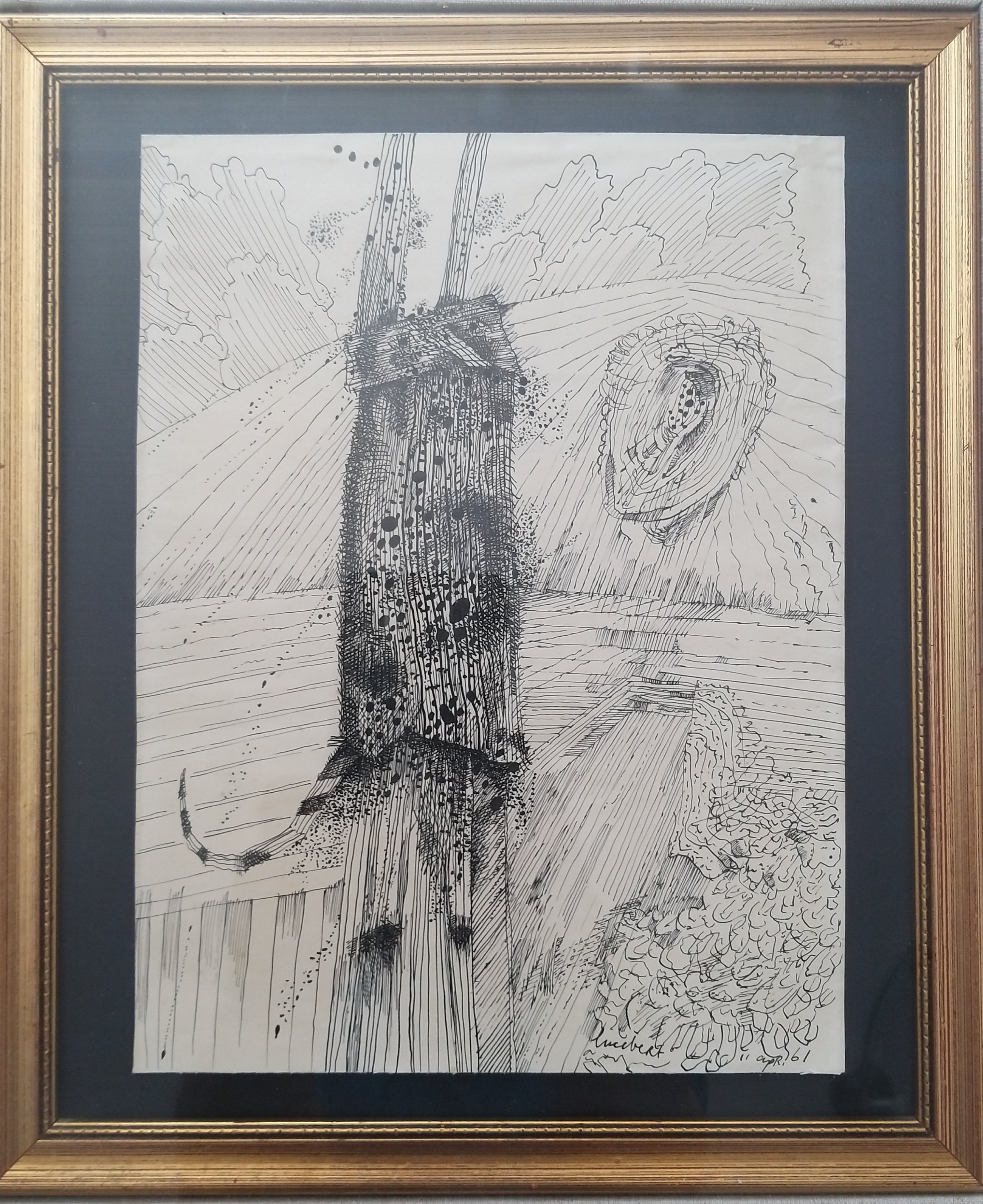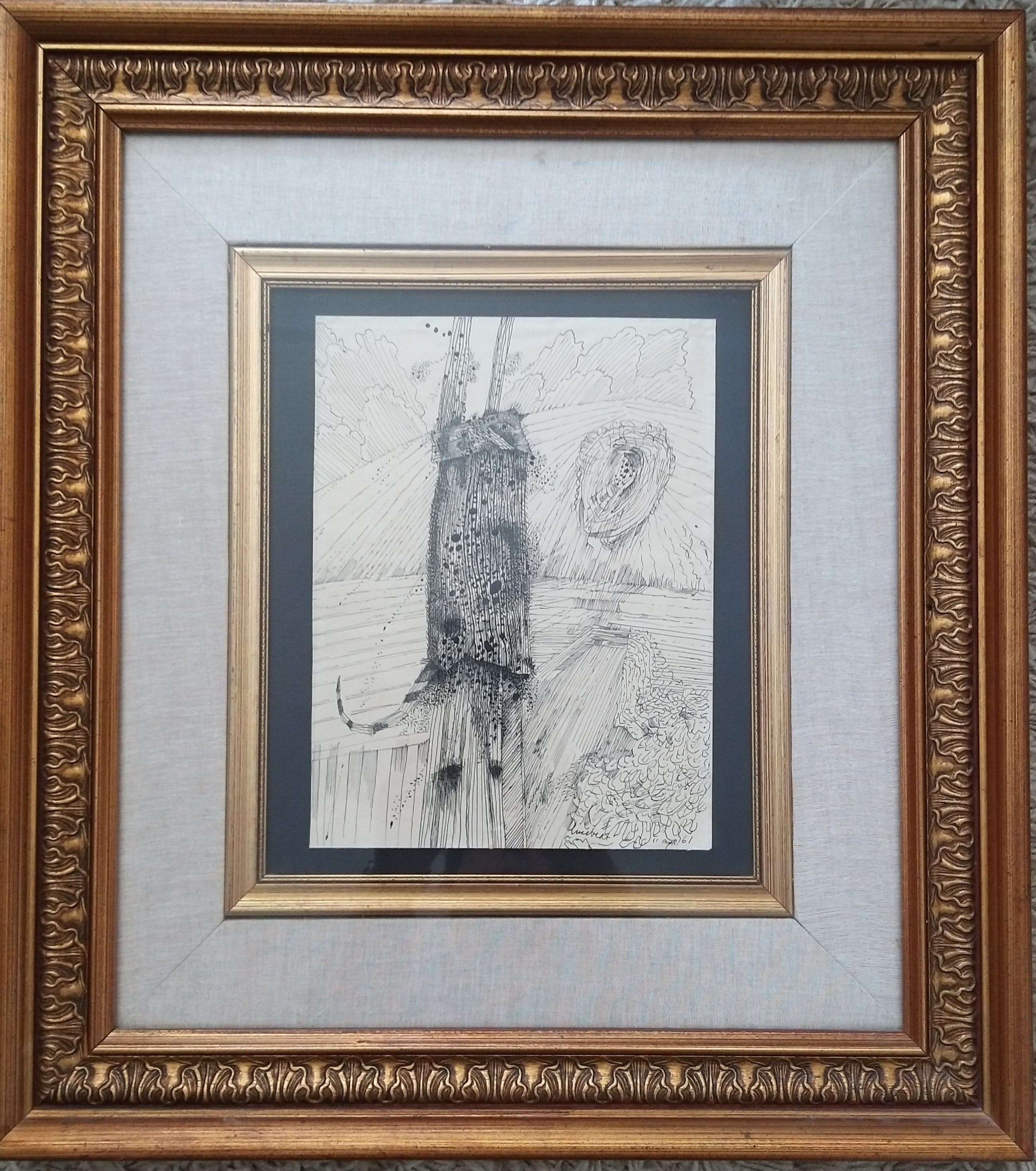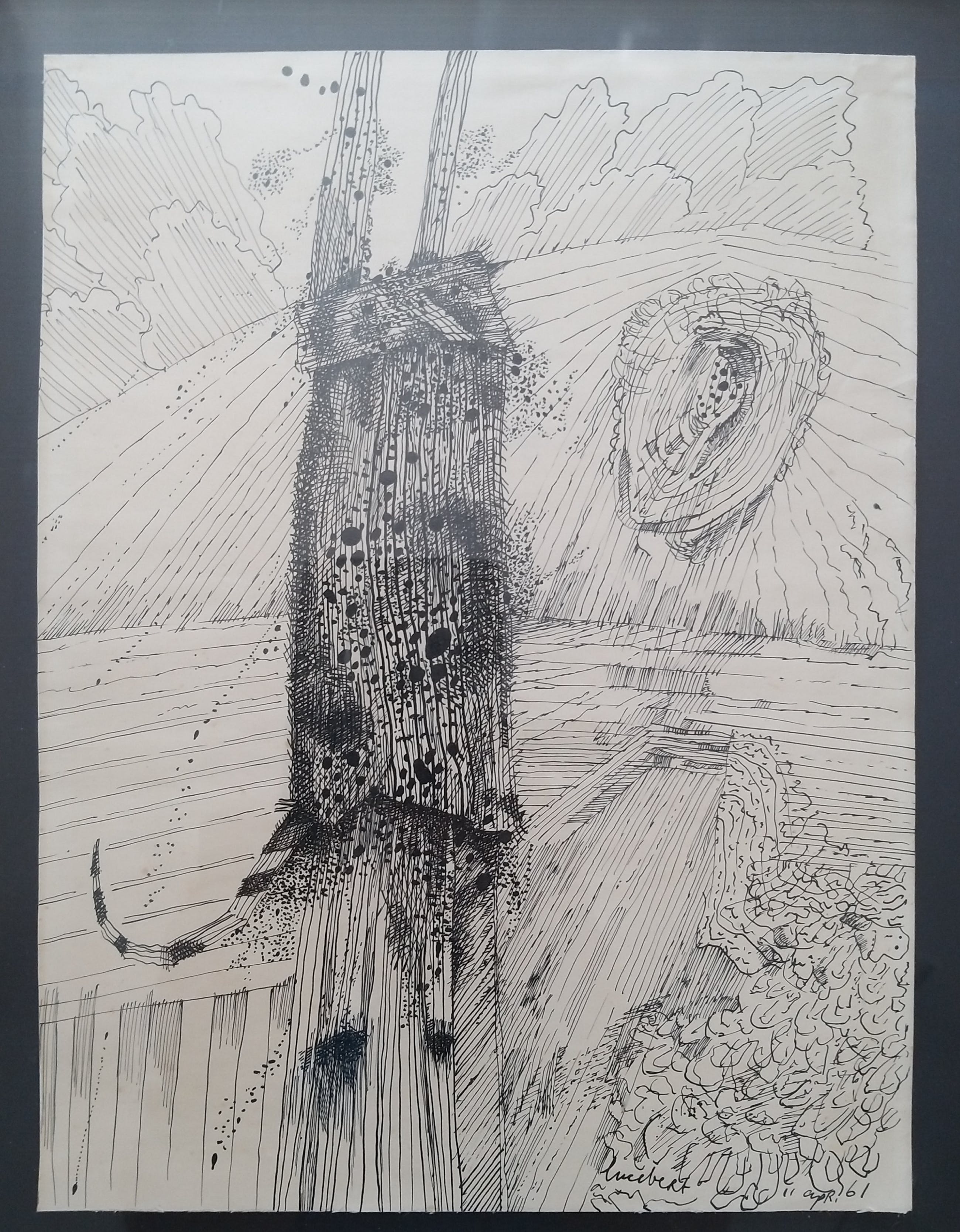 Landschap met personen en zonEen zeer Prachtige inkttekening uit 11 april 1961 Afmeting zoals boven vermeld ( circa) Ingelijst in een omlijsting uit de tijd Verso een tekening met gouache Gesigneerd rechtsonder en gedateerd 11 april 1961 Wordt aangetekend en verzekerd verstuurd