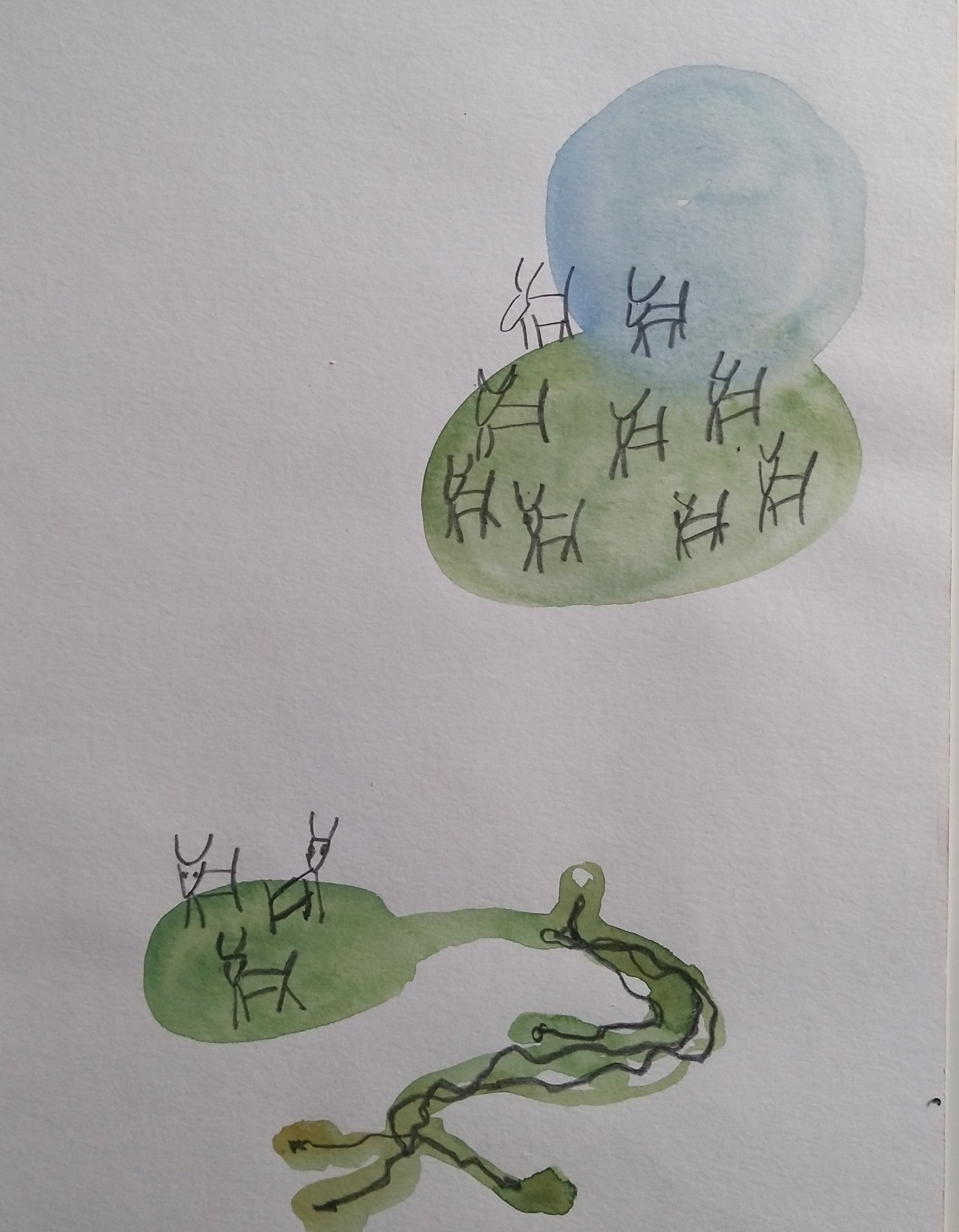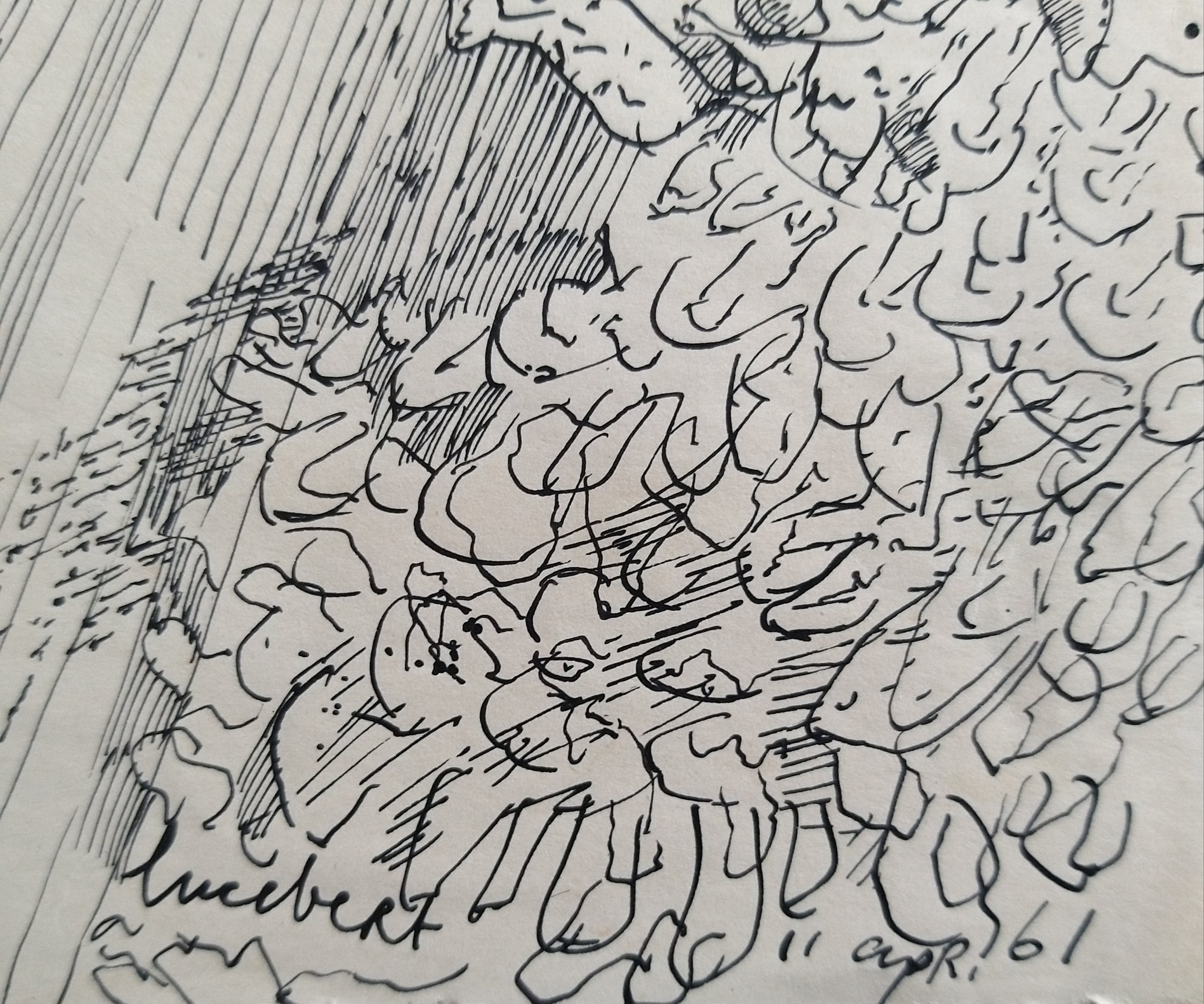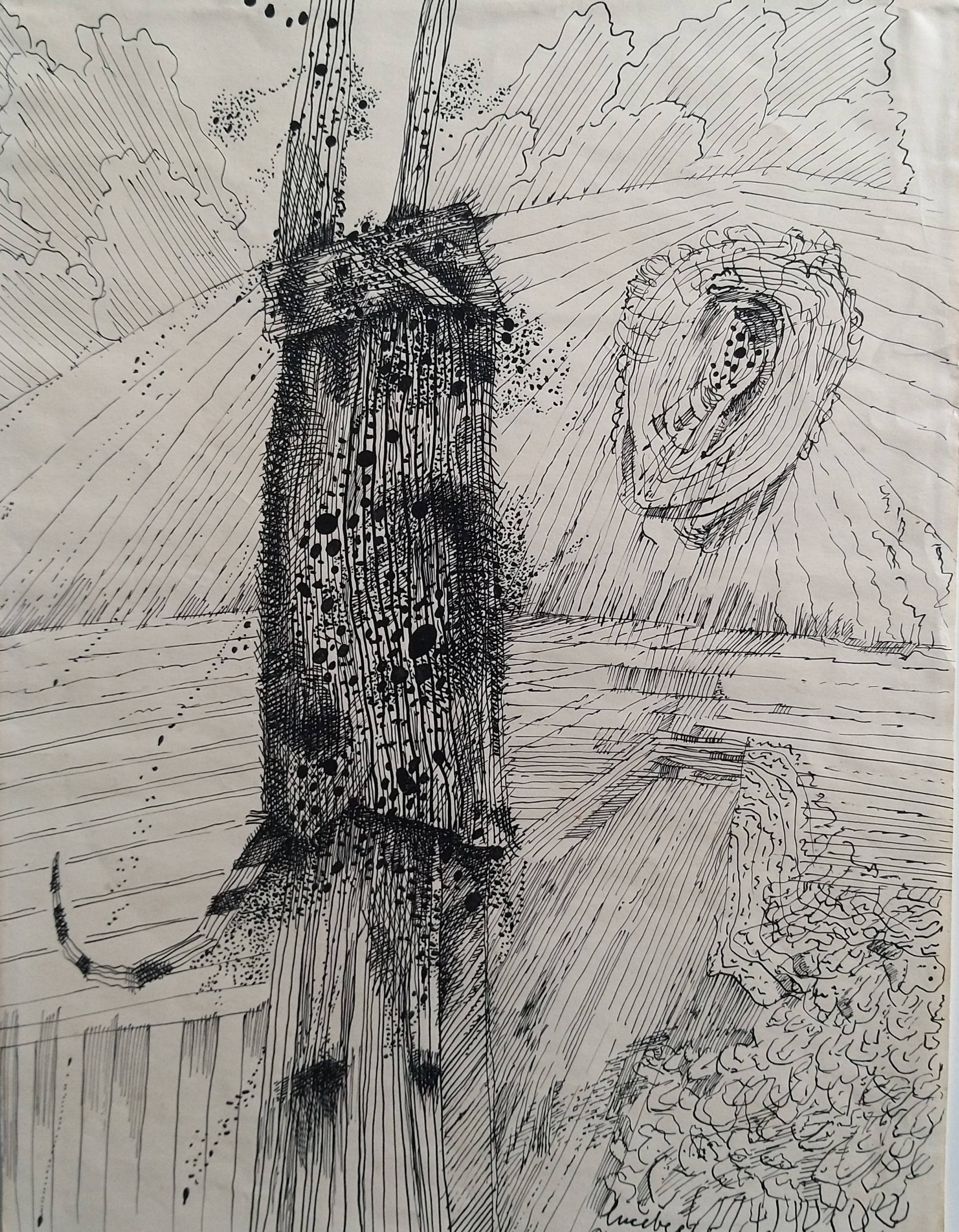 Landschap met personen en zonEen zeer Prachtige inkttekening uit 11 april 1961 Afmeting zoals boven vermeld ( circa) Ingelijst in een omlijsting uit de tijd Verso een tekening met gouache Gesigneerd rechtsonder en gedateerd 11 april 1961 Wordt aangetekend en verzekerd verstuurd