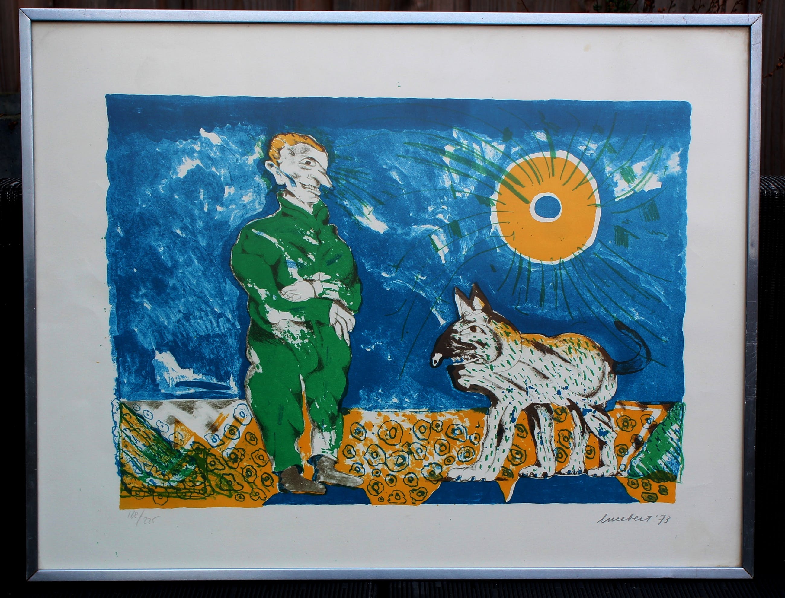Litho van Lucebert. Man met hond. Jaar: 1973. Afmetingen blad: H50.5 x b65.5cm. cm. Afmetingen voorstelling: H37 x b51cm. Het werk is rechts onderin, met potlood, gesigneerd door de kunstenaar. De authenticiteit van het werk wordt volledig gegarandeerd. Een certificaat van echtheid kan, op aanvraag, worden gemaild.