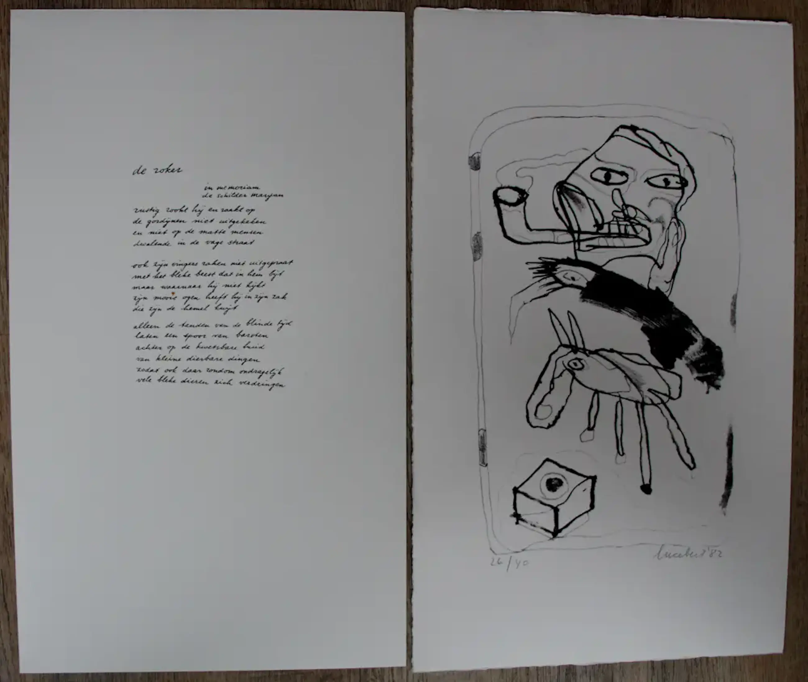 Litho van Lucebert, met gedicht: De roker. Jaar: 1982. Oplage: 26/40. Afmetingen blad: H50 x b29.5cm. Afmetingen voorstelling: H34 x b21cm. Het werk is, rechts onderaan, gesigneerd door de kunstenaar. De authenticiteit van dit werk wordt volledig gegarandeerd. Een certificaat van echtheid wordt, op aanvraag, gemaild.