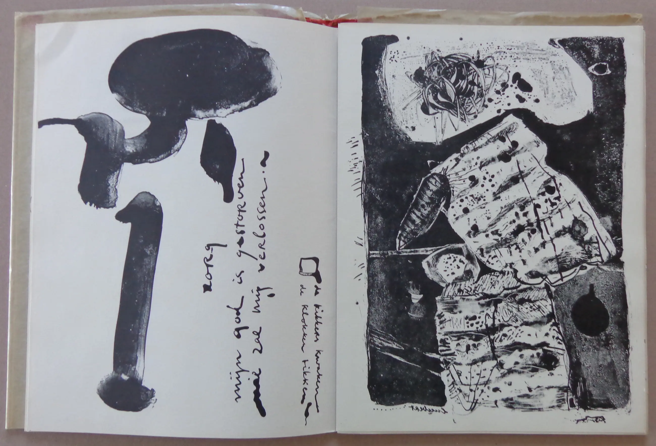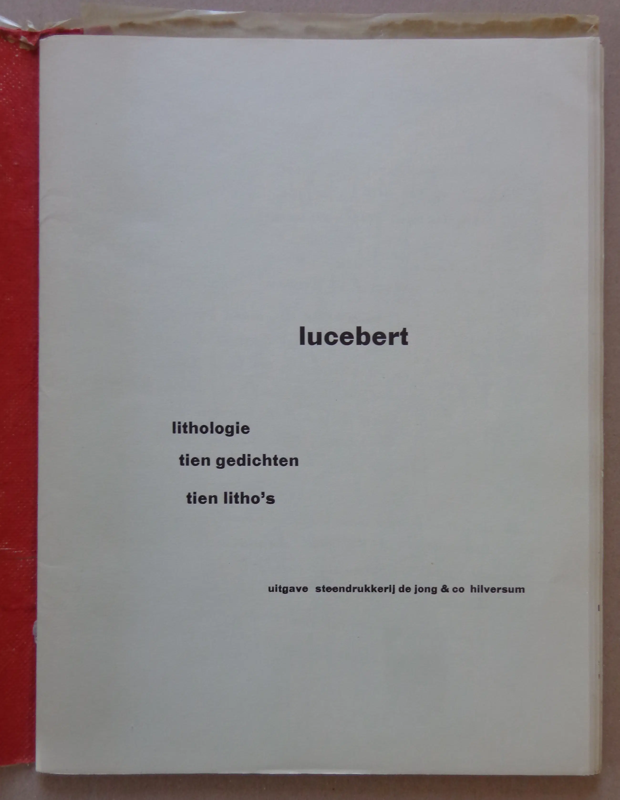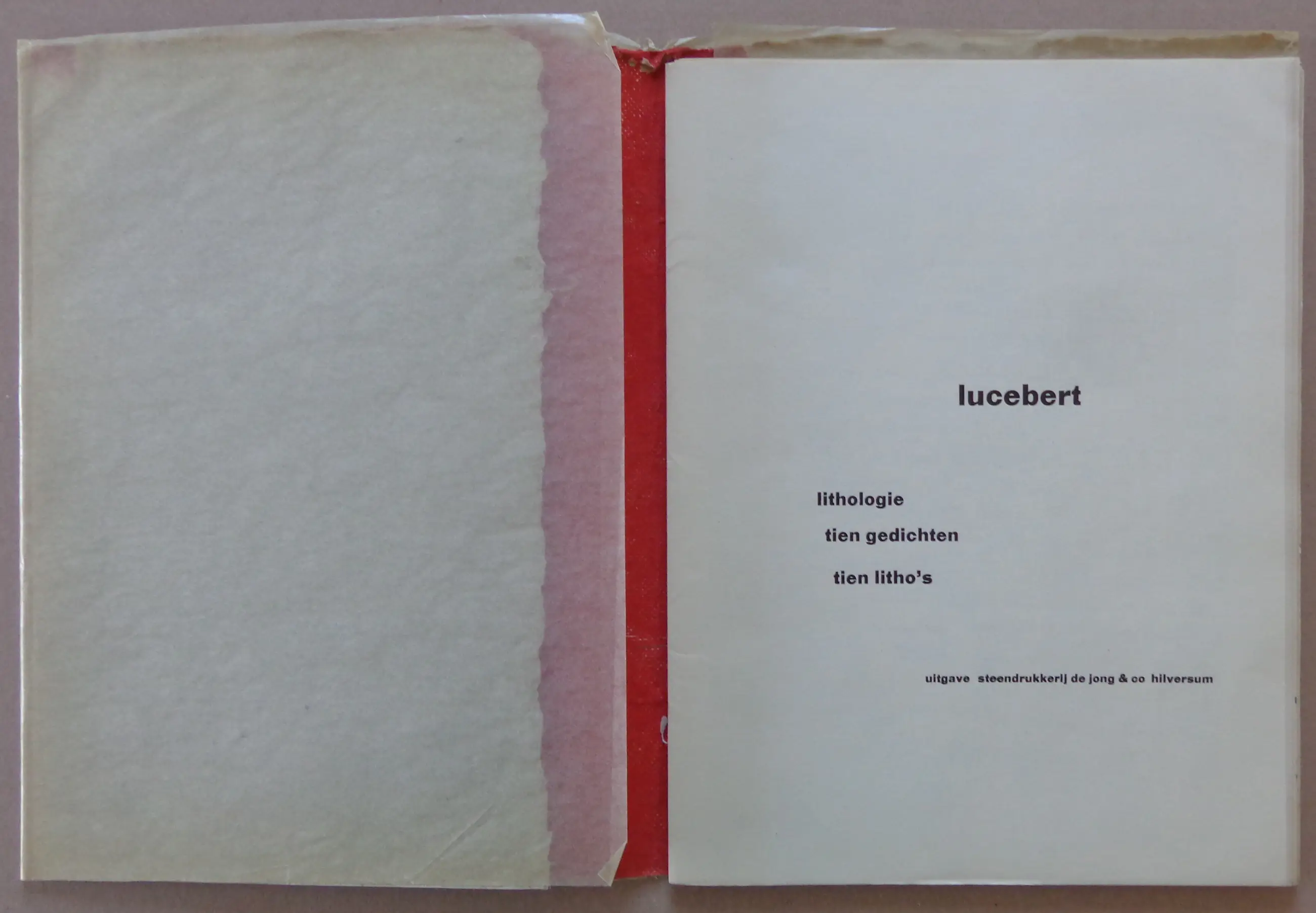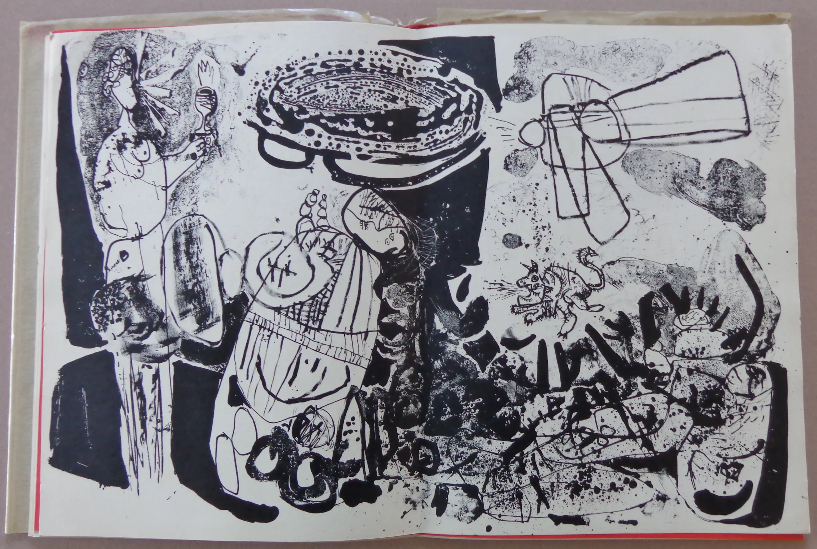 Lucebert (1924-1994). Titel: "Lithologie. Tien gedichten. Tien litho's". Kunstboekje met 10 gedichten + 10 zwart-wit litho's. Signatuur in de plaat. Geen nummering. Winter 1959. Uitgave Steendrukkerij De Jong & Co, Hilversum. Mapje met kartonnen rug en doorzichtig omslagblaadje. Losbladige litho's. Achteraan zit nog een extra blaadje met litho's + extra recto-verso krant over deze uitgave. Zeldzaam en waardevol werkje van Lucebert. Blad: 31x23cm. Proper blad. Boekje in goede staat.