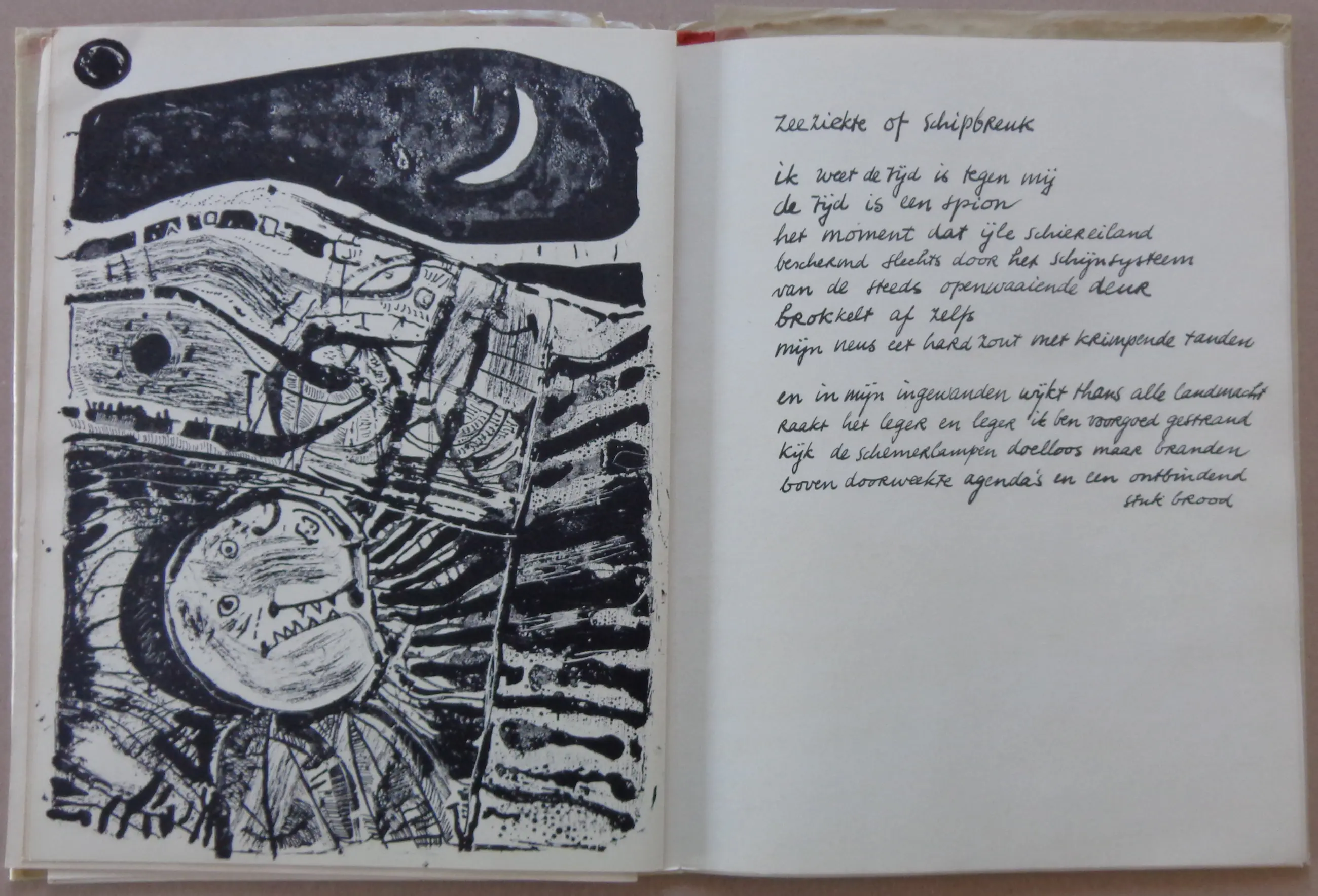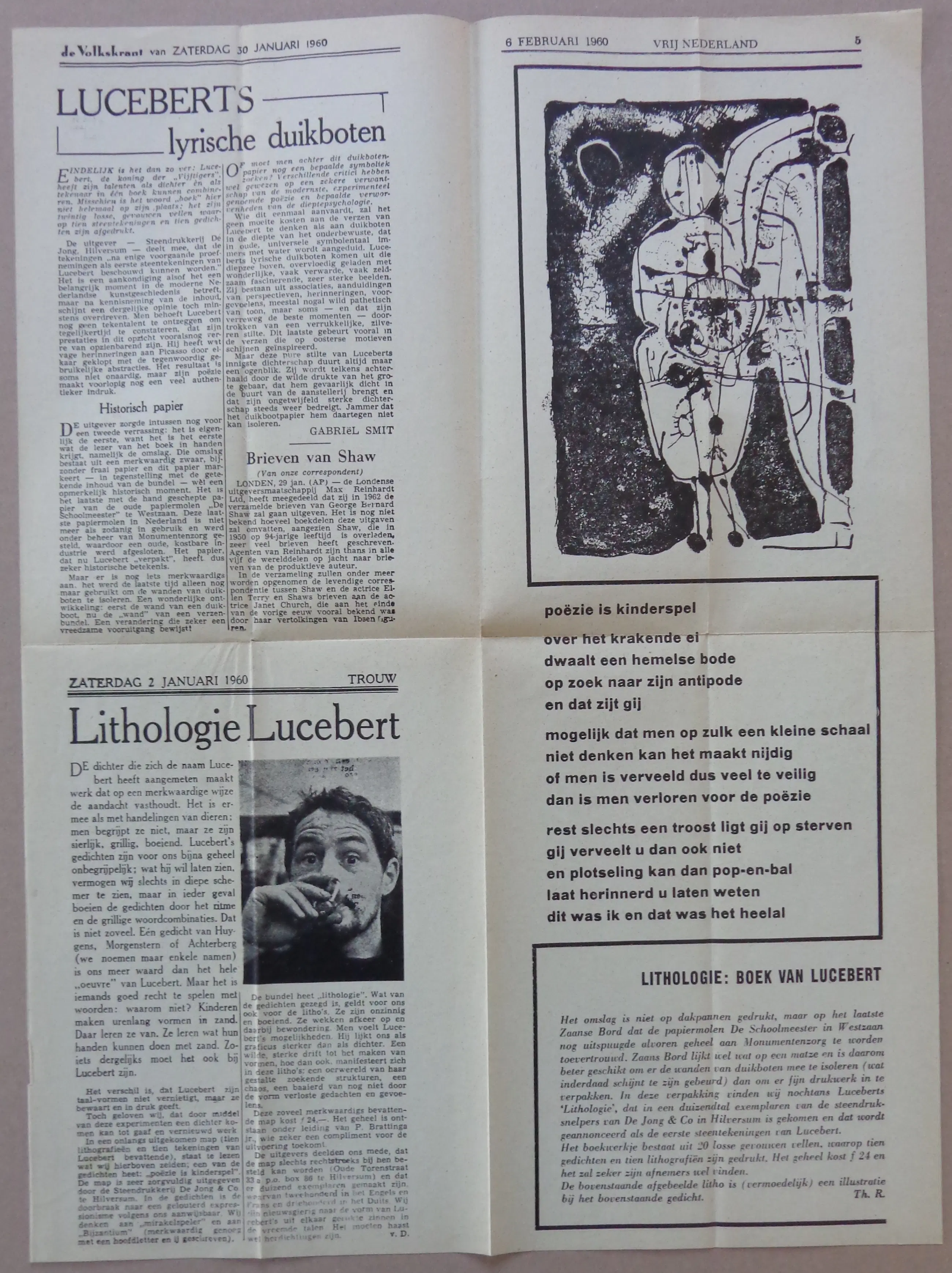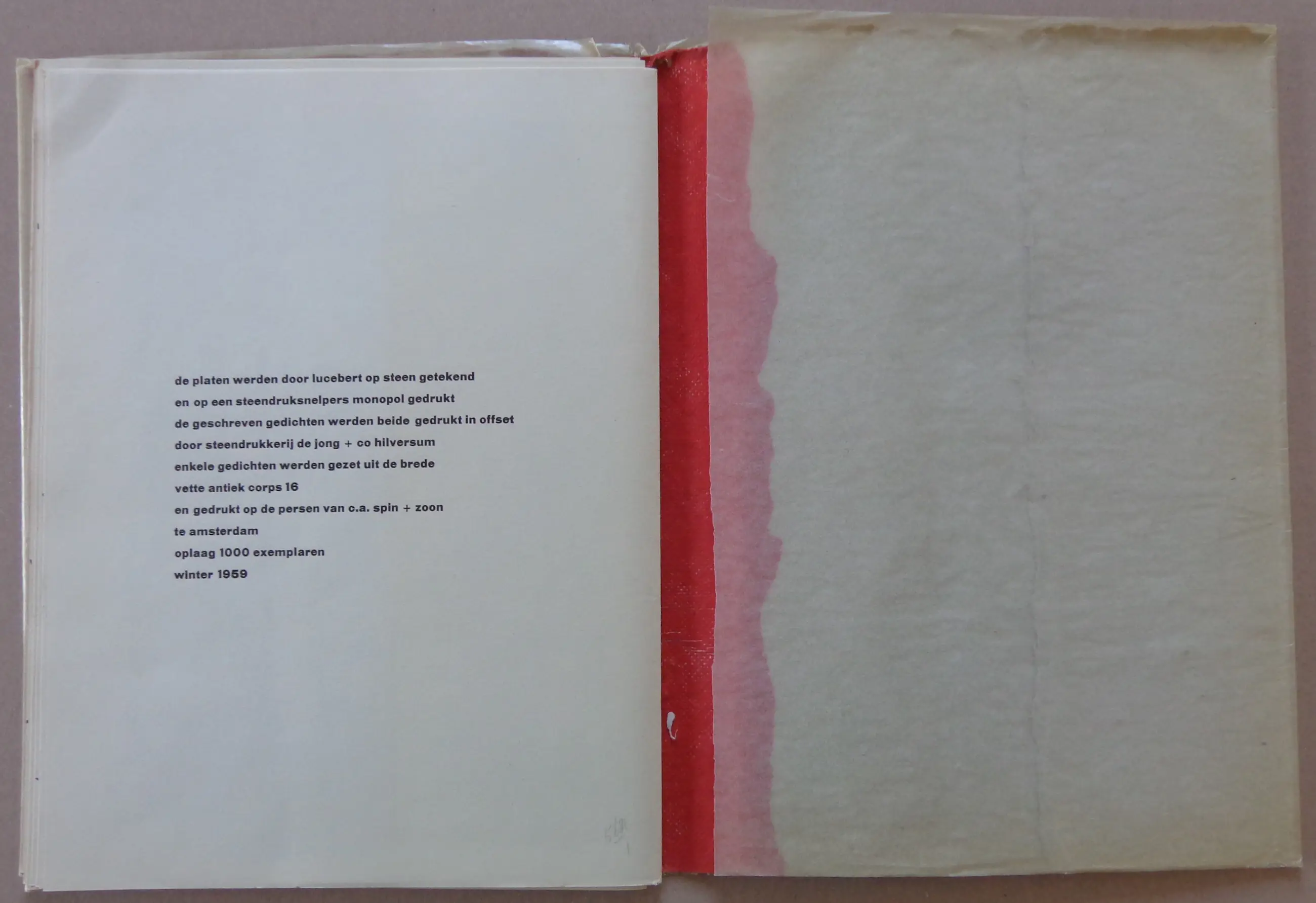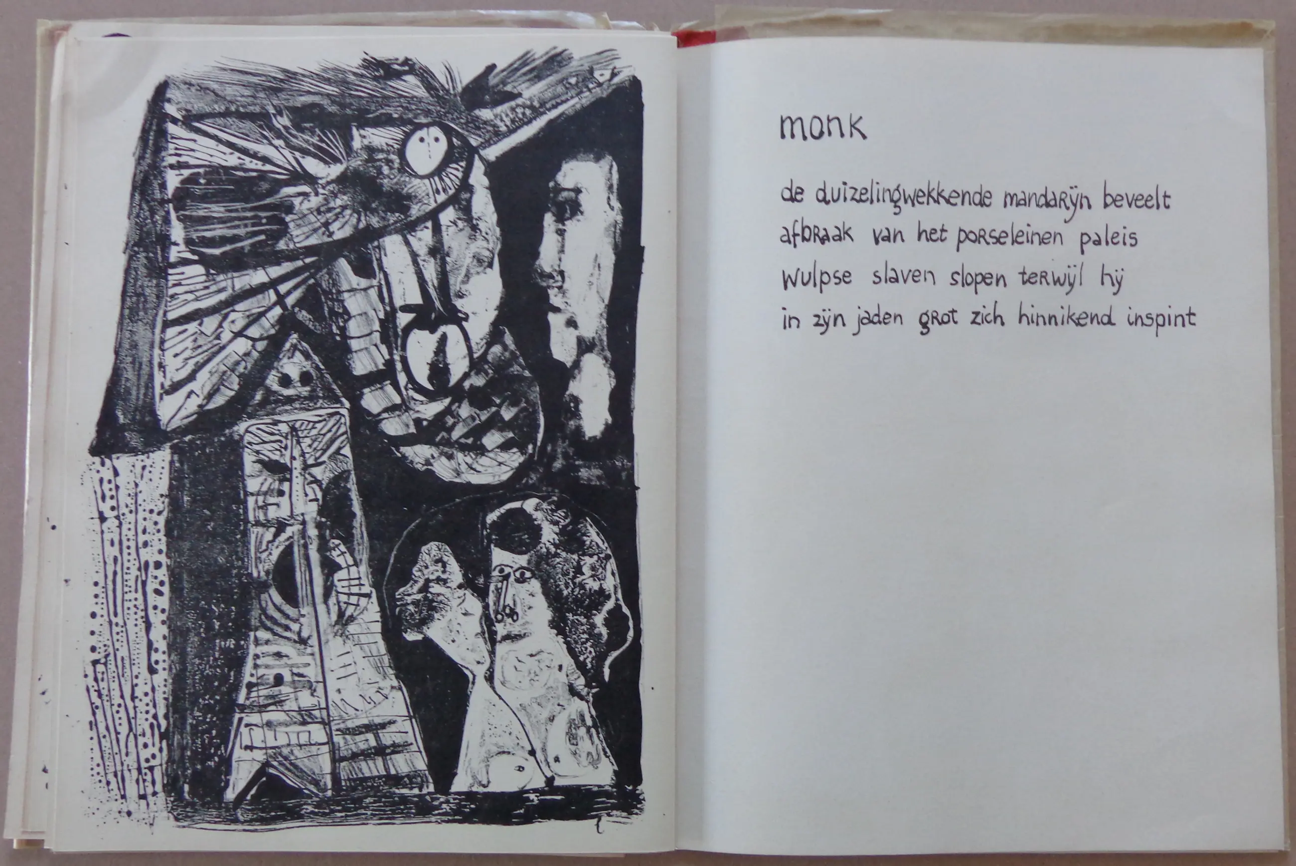Lucebert (1924-1994). Titel: "Lithologie. Tien gedichten. Tien litho's". Kunstboekje met 10 gedichten + 10 zwart-wit litho's. Signatuur in de plaat. Geen nummering. Winter 1959. Uitgave Steendrukkerij De Jong & Co, Hilversum. Mapje met kartonnen rug en doorzichtig omslagblaadje. Losbladige litho's. Achteraan zit nog een extra blaadje met litho's + extra recto-verso krant over deze uitgave. Zeldzaam en waardevol werkje van Lucebert. Blad: 31x23cm. Proper blad. Boekje in goede staat.