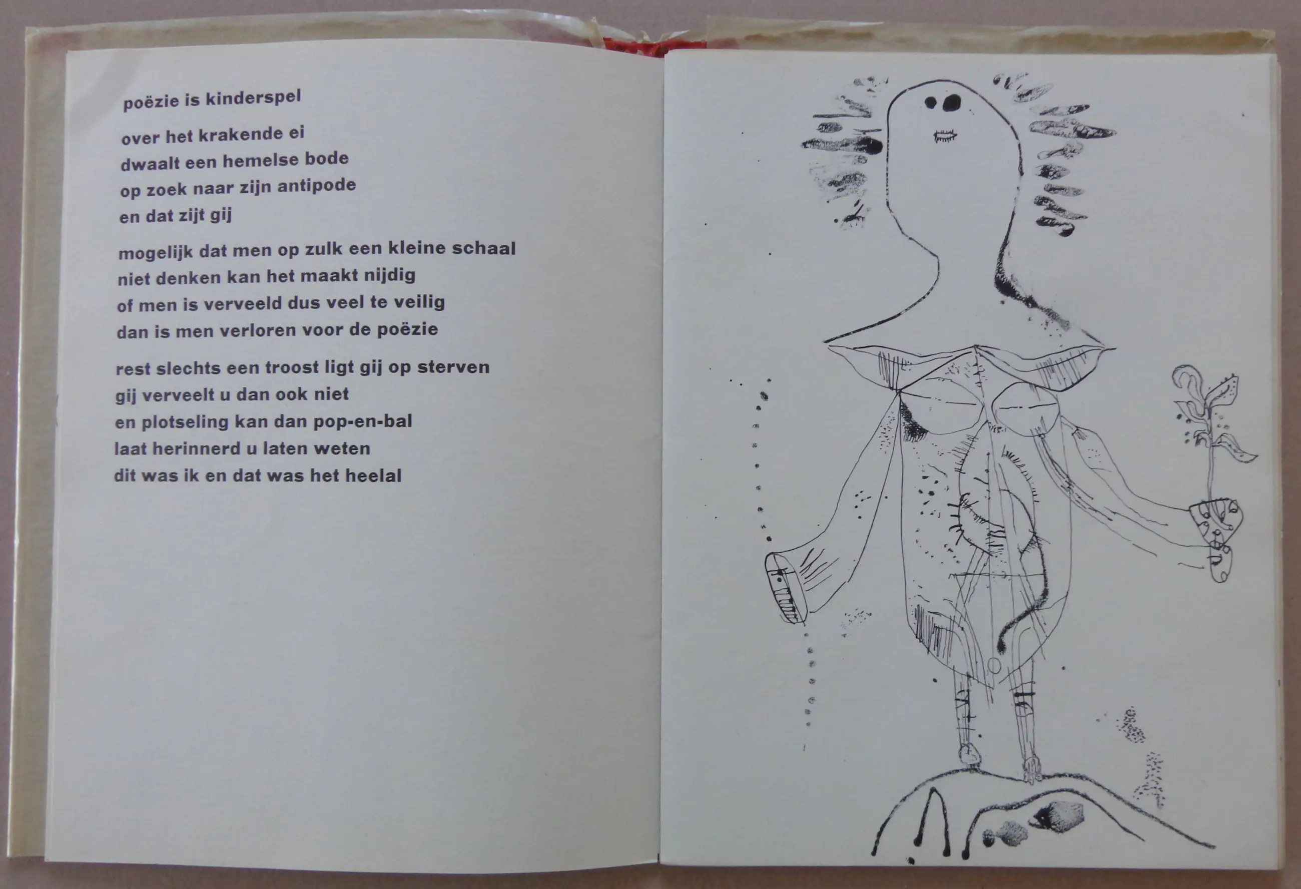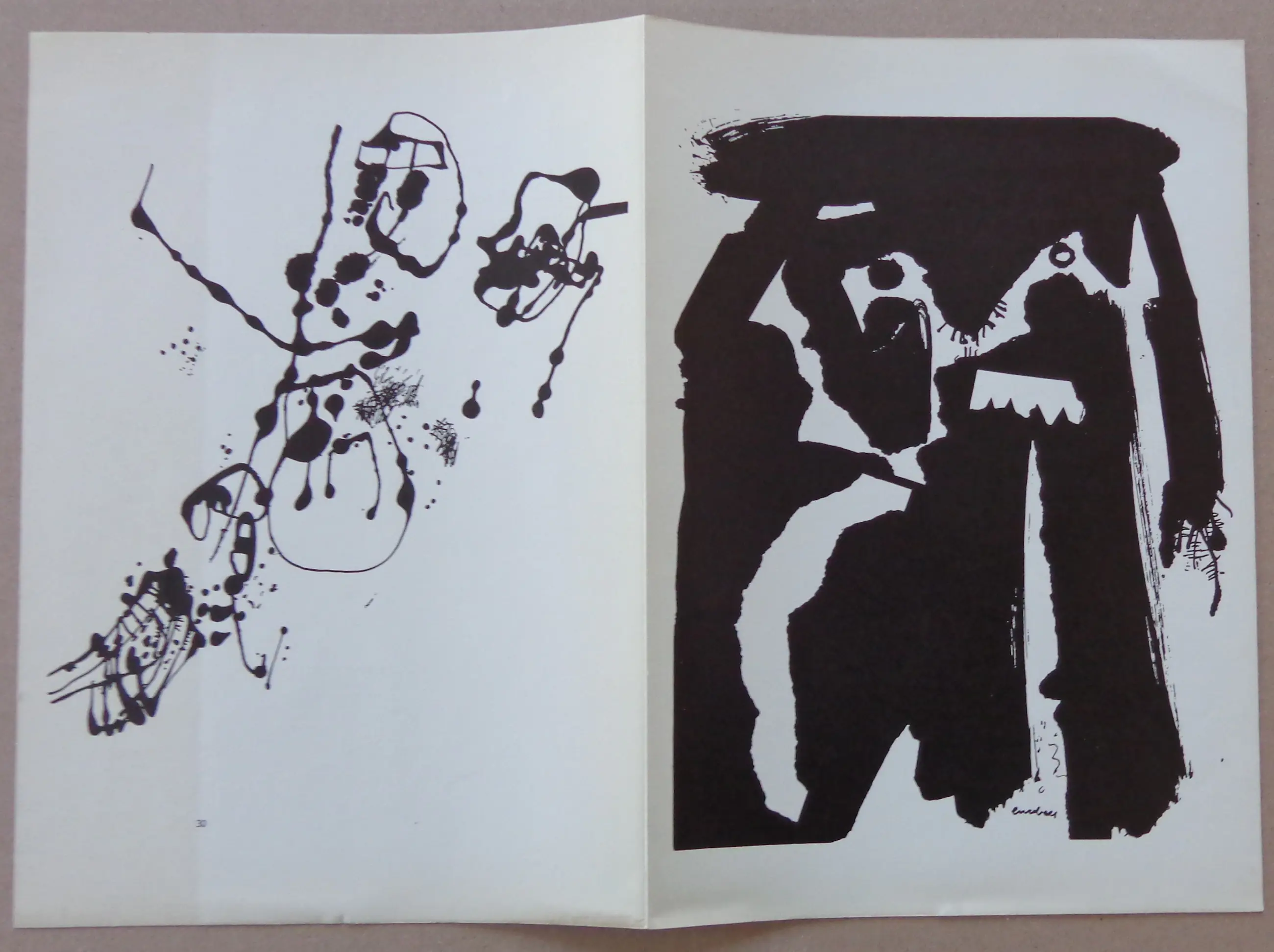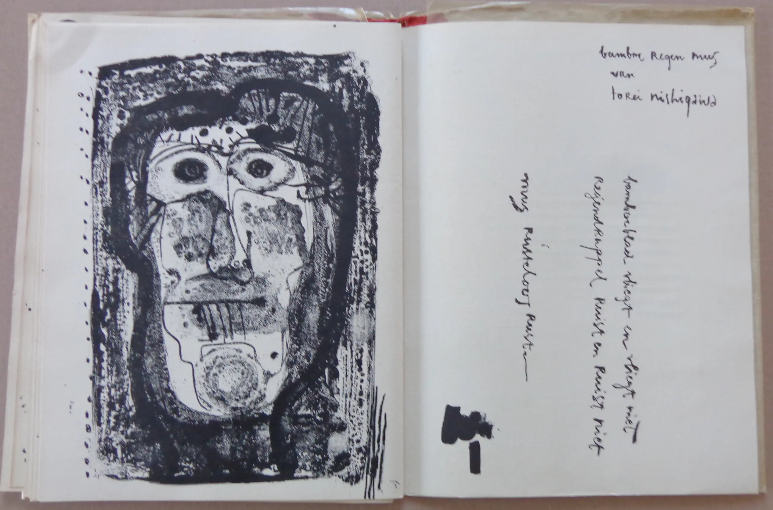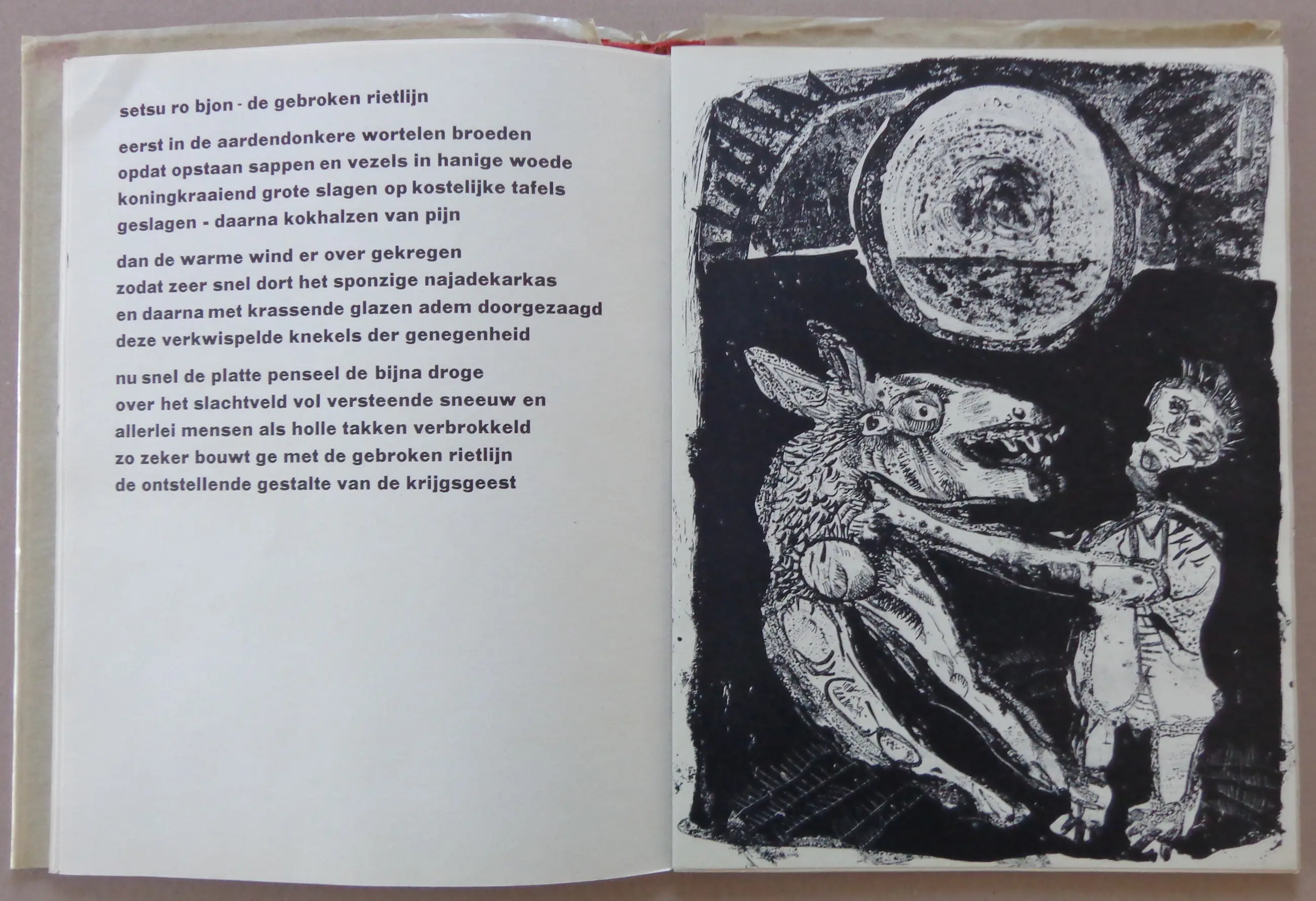 Lucebert (1924-1994). Titel: "Lithologie. Tien gedichten. Tien litho's". Kunstboekje met 10 gedichten + 10 zwart-wit litho's. Signatuur in de plaat. Geen nummering. Winter 1959. Uitgave Steendrukkerij De Jong & Co, Hilversum. Mapje met kartonnen rug en doorzichtig omslagblaadje. Losbladige litho's. Achteraan zit nog een extra blaadje met litho's + extra recto-verso krant over deze uitgave. Zeldzaam en waardevol werkje van Lucebert. Blad: 31x23cm. Proper blad. Boekje in goede staat.
