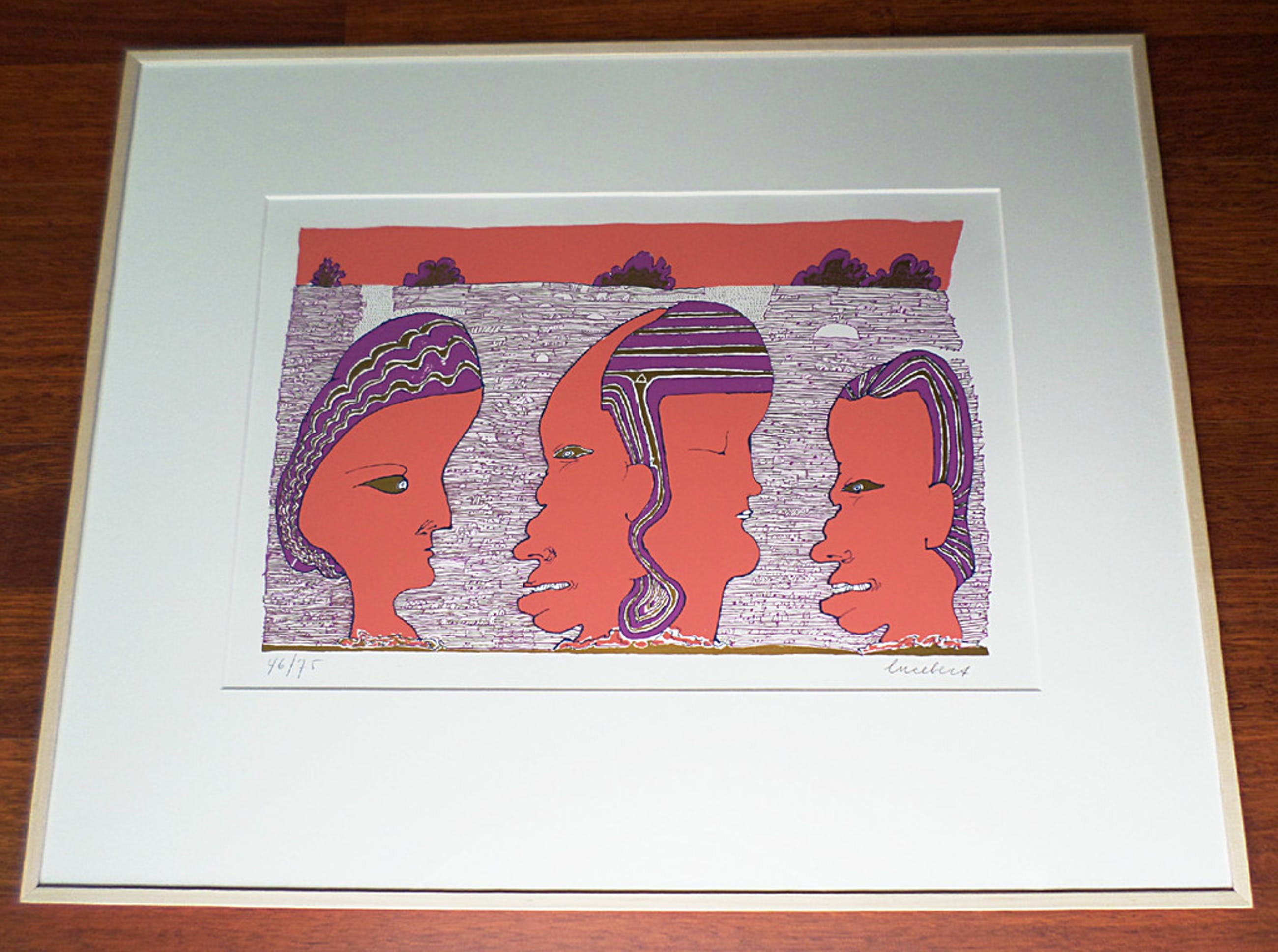 Prachtige zeefdruk van Lucebert uit de portfolio Buhnescreens (1971). Gedrukt door Piet Clement op Hahnemuhle papier. Heel recent en strak ingelijst, achter glas en passepartout. Handgesigneerd en genummerd. Dit is nummer 46 uit een oplage van slechts 75 stuks.