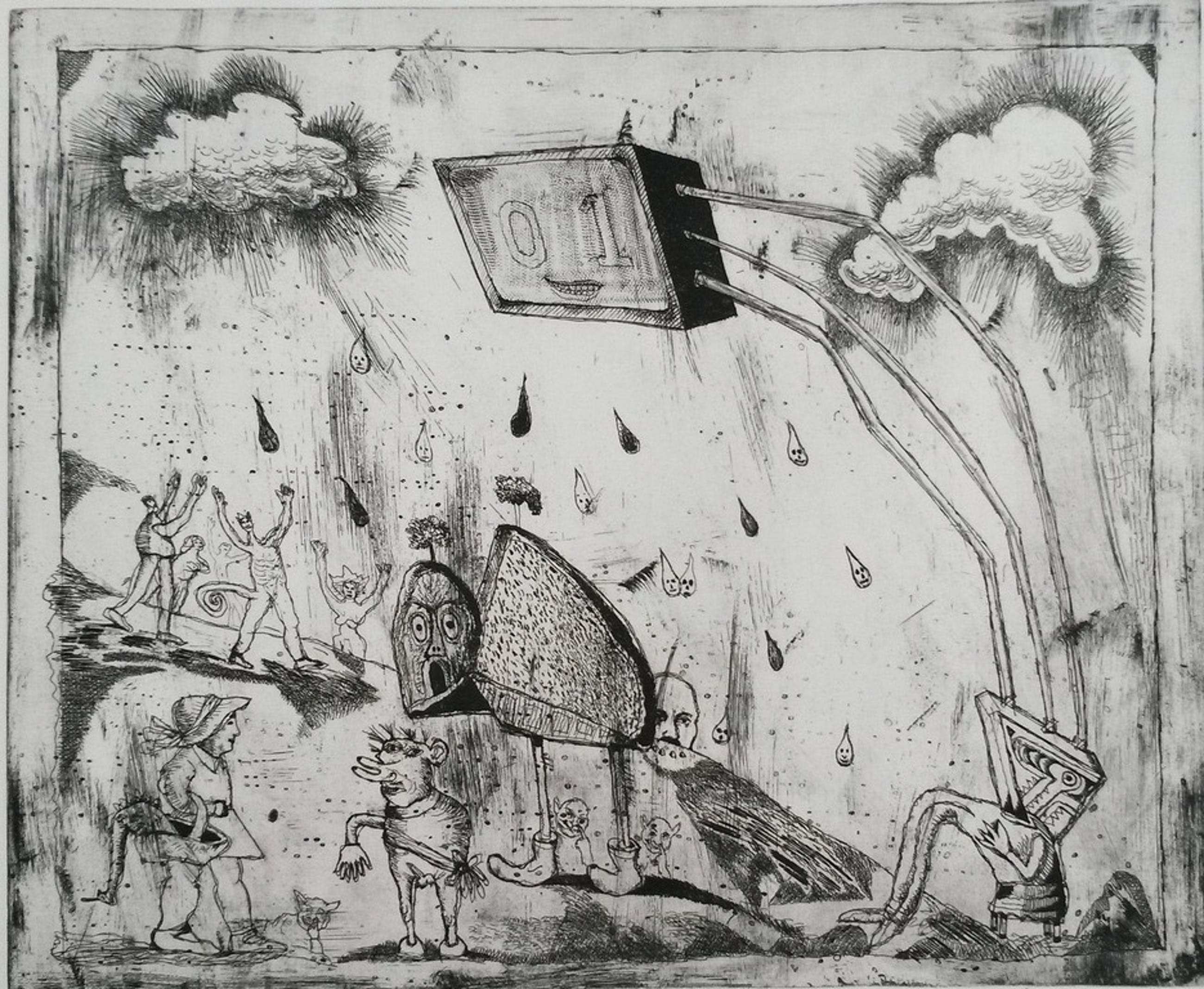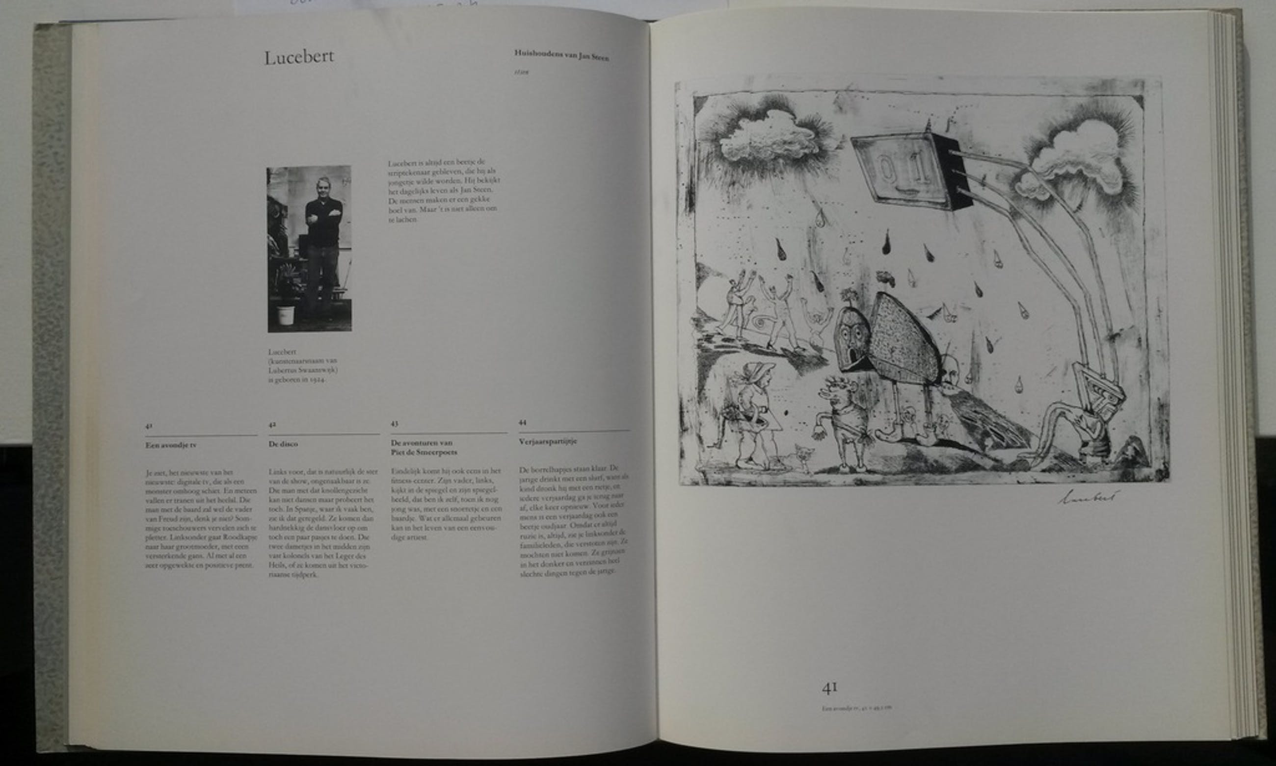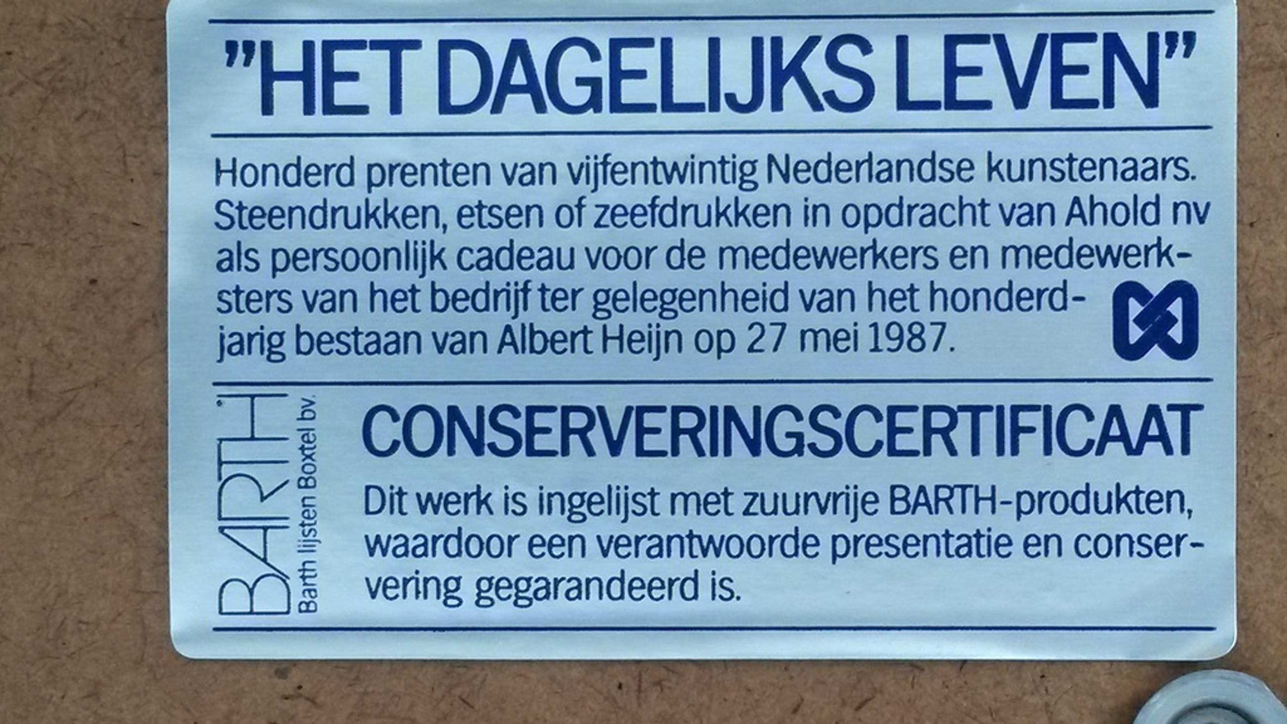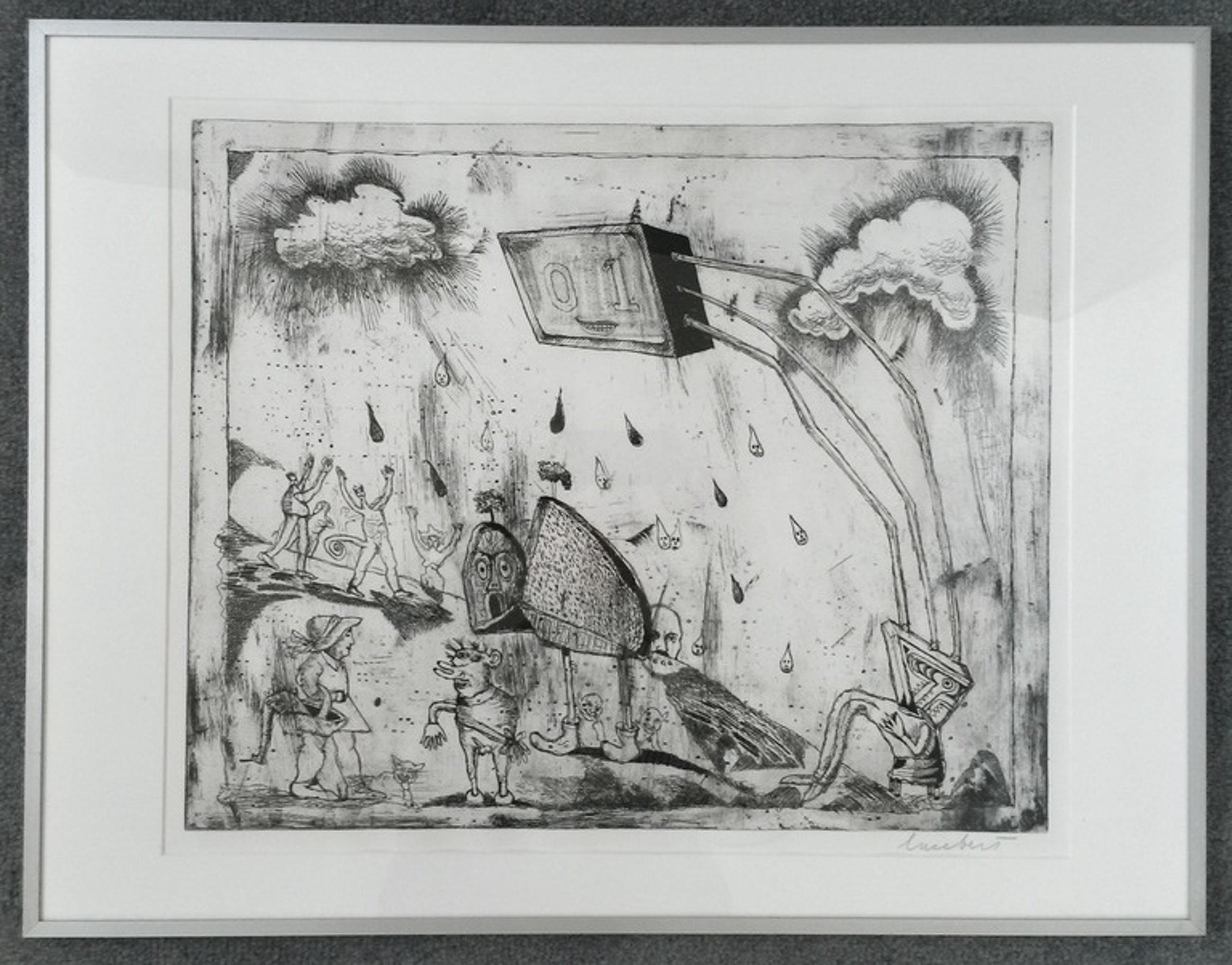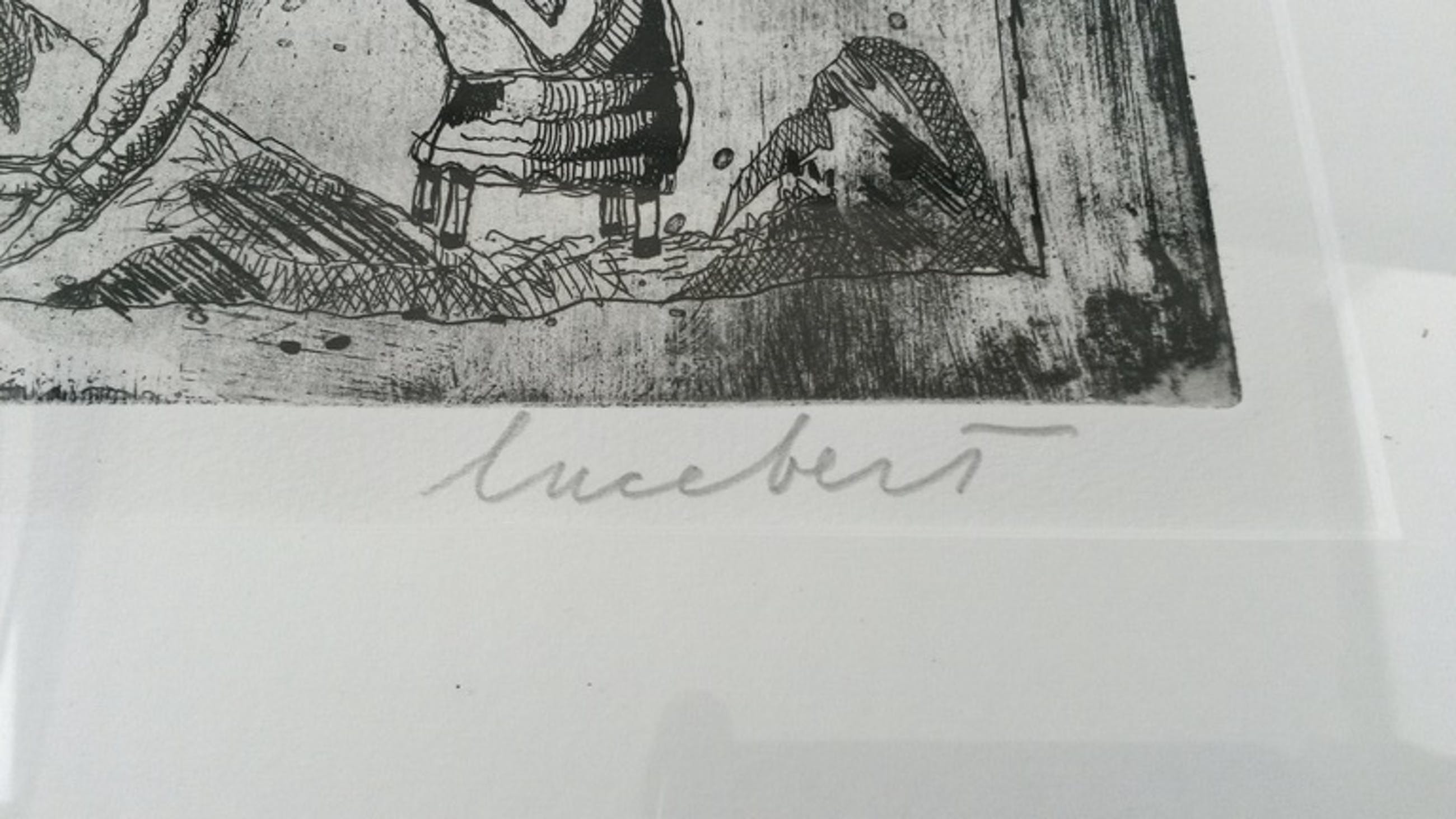 Grote ets van Lucebert, getiteld Een avondje tv. De ets is uitgegeven in het kader van het 100-jarig bestaan van Albert Heijn en afgebeeld in het begeleidende boek Het dagelijks leven (geen onderdeel van kavel). De ets is 41 x 49,5 cm groot en ingelijst in de originele lijst van 50 x 65 cm. Het geheel verkeert in nieuwstaat.