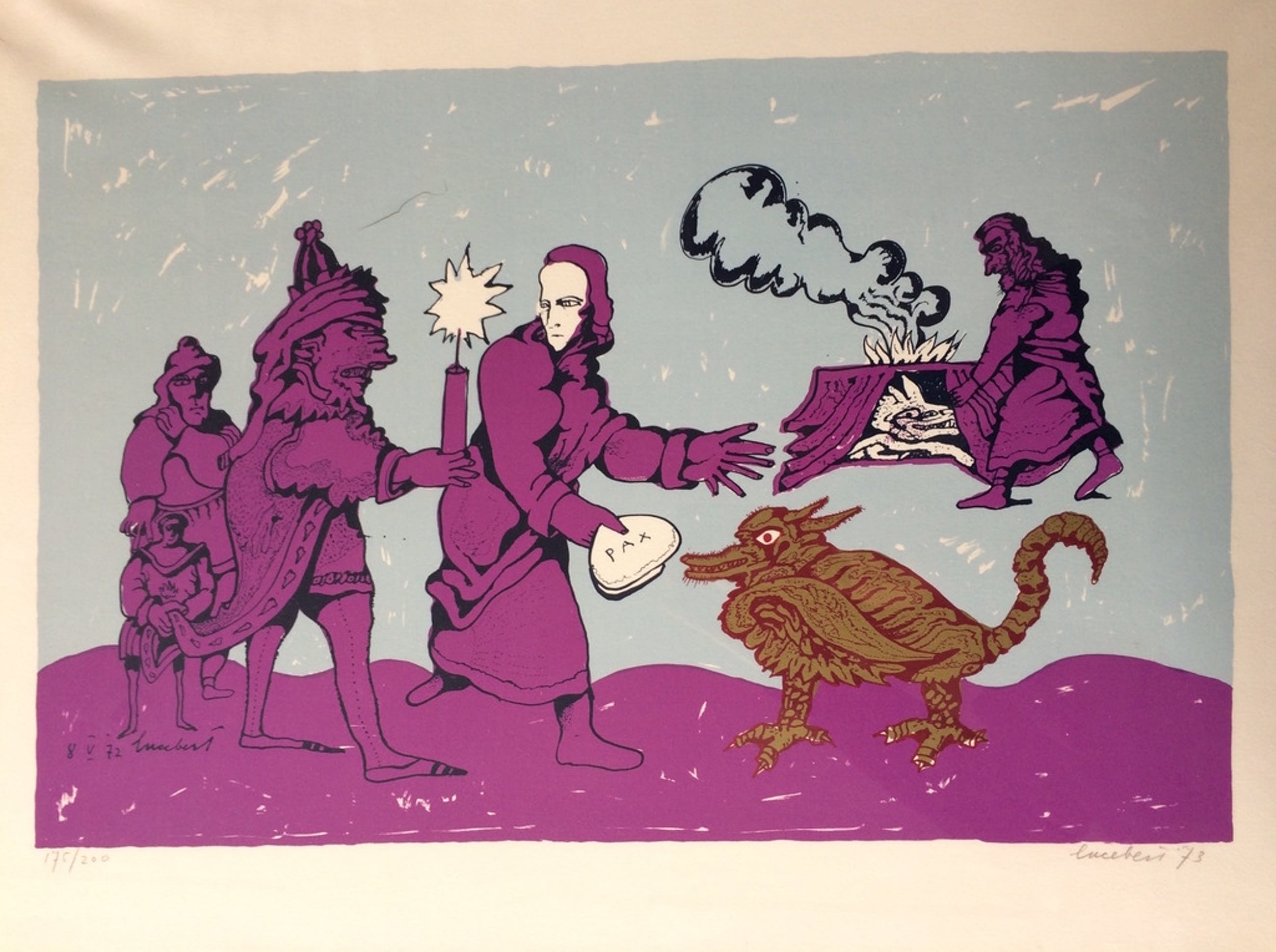 Deze grafiek is door een familielid via Sotheby's aangekocht in 1989 en is gedateerd op 1973. Na aankoop via Sotheby's heeft hij altijd ingepakt in het archief gestaan. Daardoor is het werk niet verkleurd en in het echt nog mooier en voller van kleur dan op de foto. Wij vermoeden dat het werk over vrede gaat, en iemand verbeeldt die middels een object (steen?) de vrede aanbiedt tussen strijdende partijen. Maar dat is onze interpretatie. We hopen dat iemand voor het werk valt en er dagelijks van zal genieten.