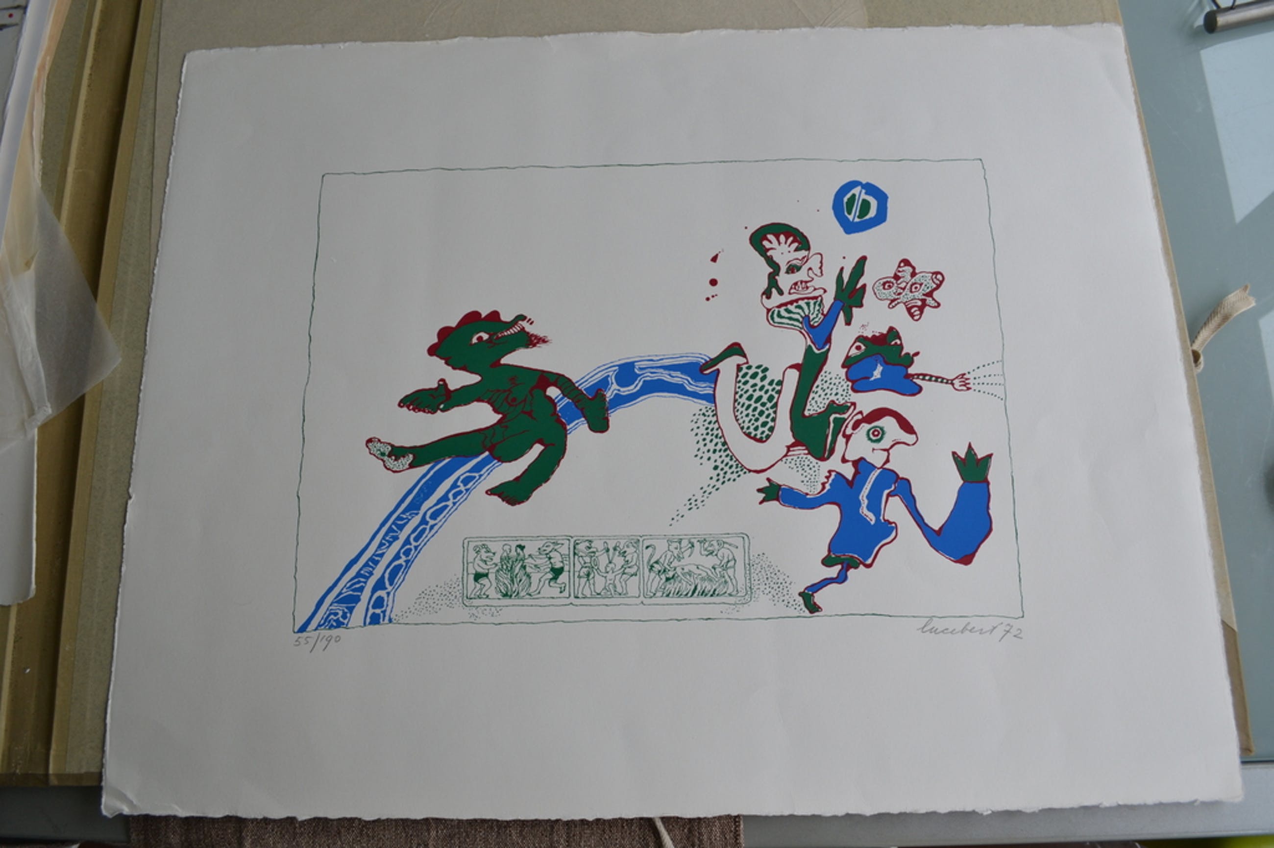Overig: Onderdeel van de Prent 190 reeks. Lucebert is een bekend Nederlands kunstenaar en dichter, als schilder was hij nauw betrokken bij de Amsterdams poot van de experimentele COBRA groep.