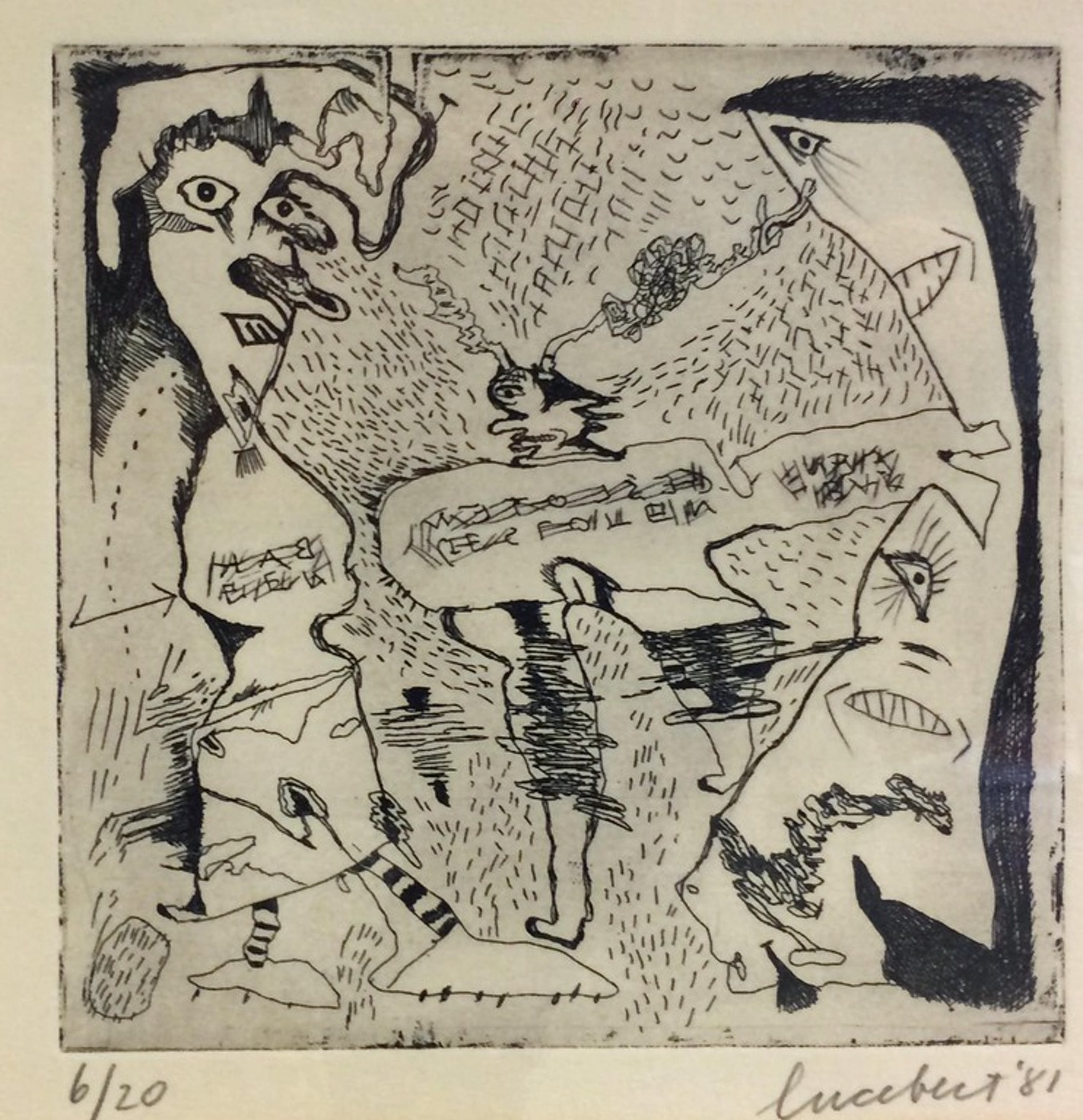 Gesigneerde en genummerde ets van Luecbert uit 1981. Afgedrukt in een oplage van 20 exemplaren is dit nummer 6. De prent is 20 x 20 cm en waarschijnlijk onder het passe partout nog wat groter. De lijst is 65 x 50 cm. De ets kan met lijst en passe partout worden opgehaald in onze galerie in Arkel of zonder lijst aangetekend worden verzonden in een stevige kartonnen verpakking.