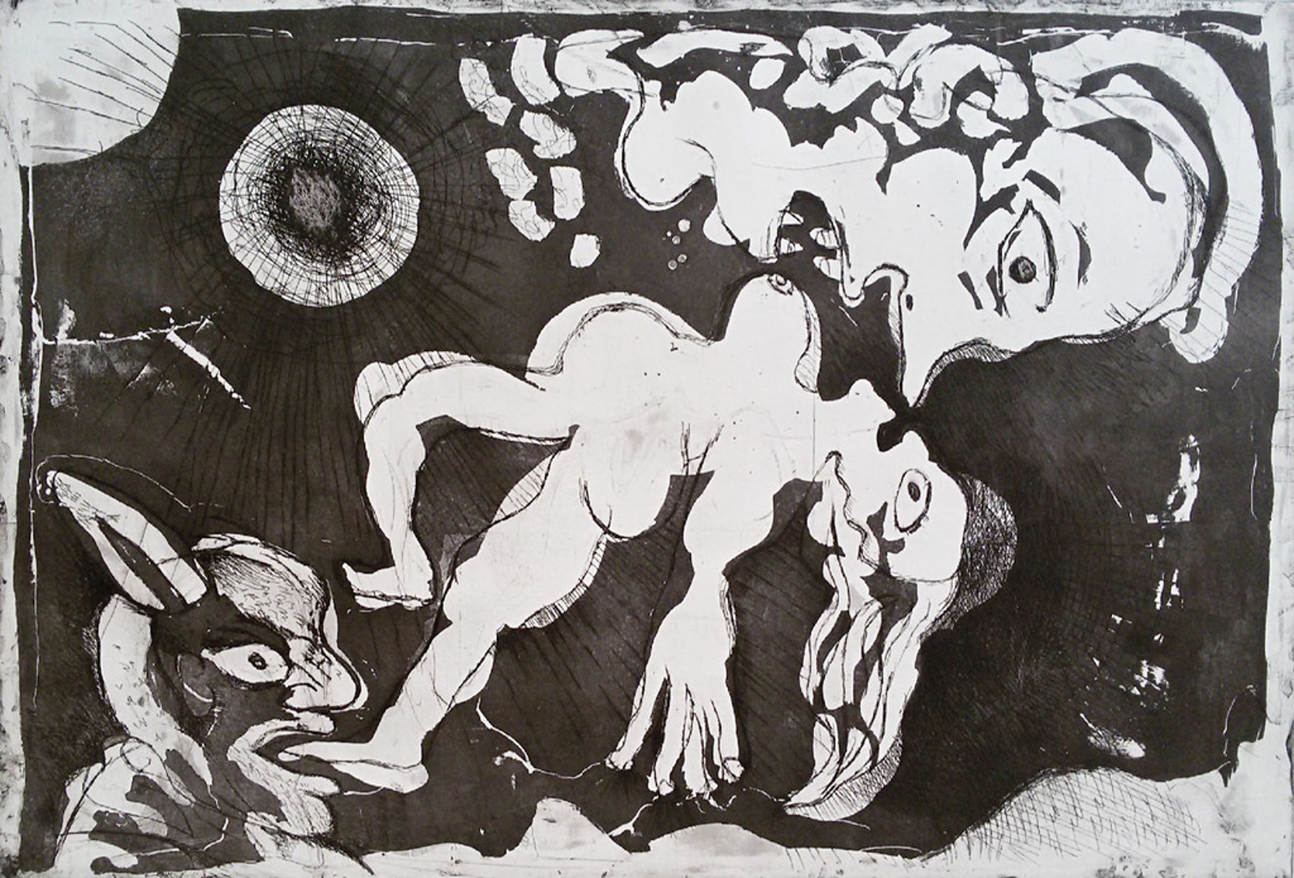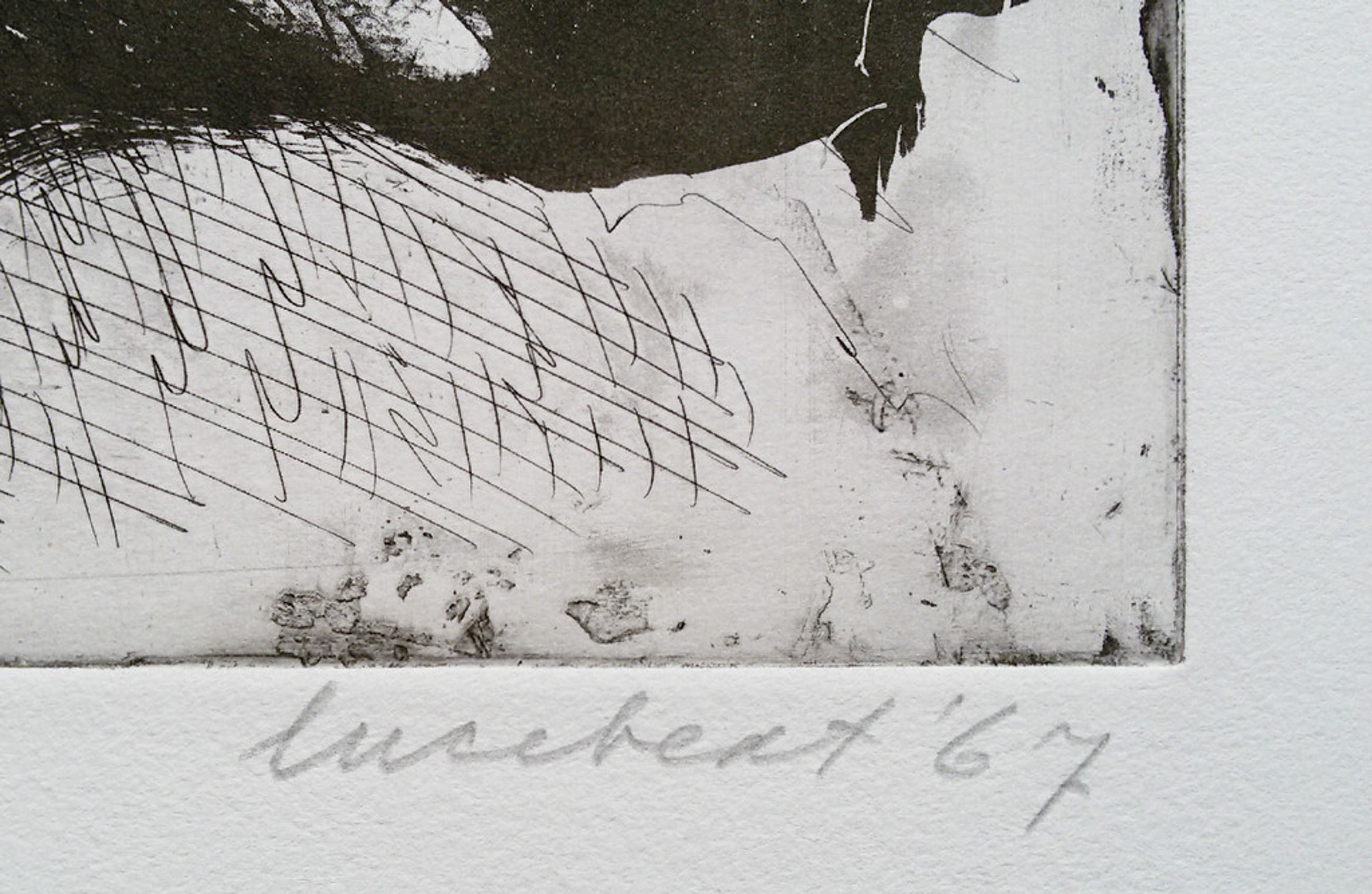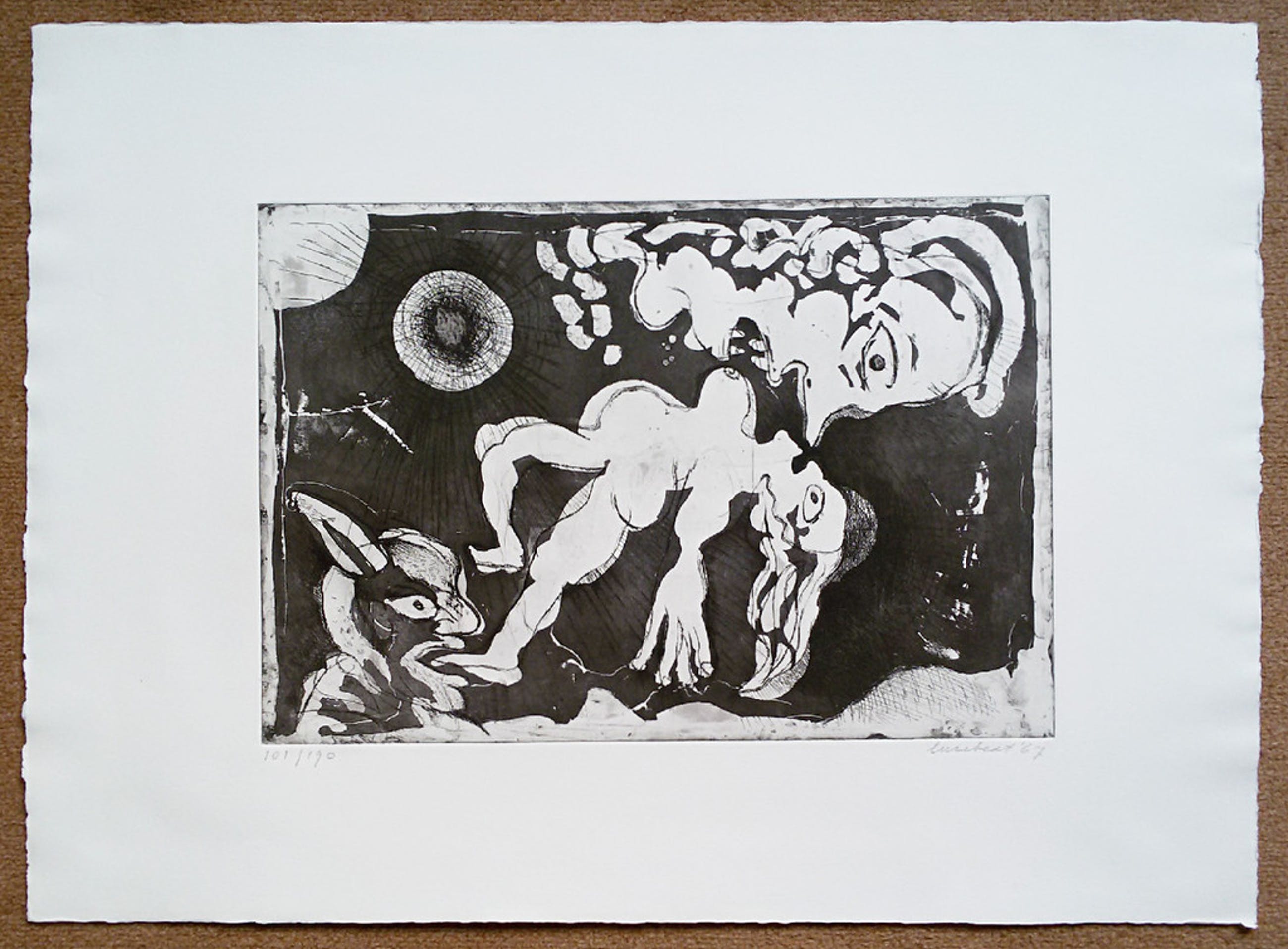 Bekend en herkenbaar werk van Lucebert uit 1967. Misschien wel de meest gezochte Lucebert ets uit de Prent 190 reeks. Ets op geschept papier, met potlood gesigneerd, gedateerd en genummerd (101/190). In uitstekende conditie, blad heeft nooit ingelijst gezeten, alleen twee punaisegaatjes in de uiterste bovenhoeken van het blad.