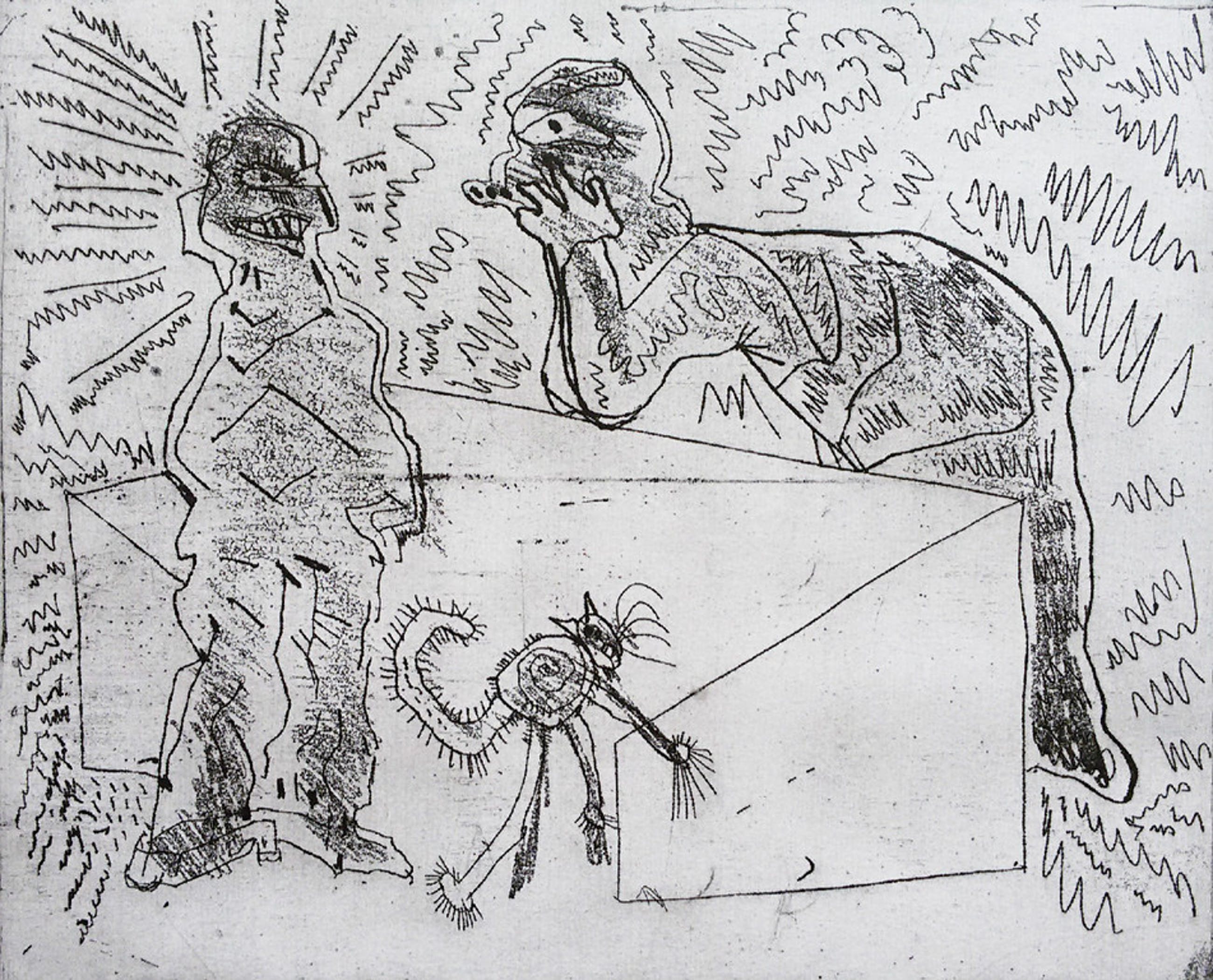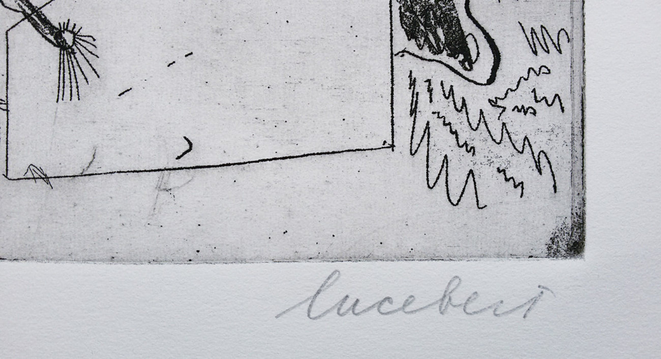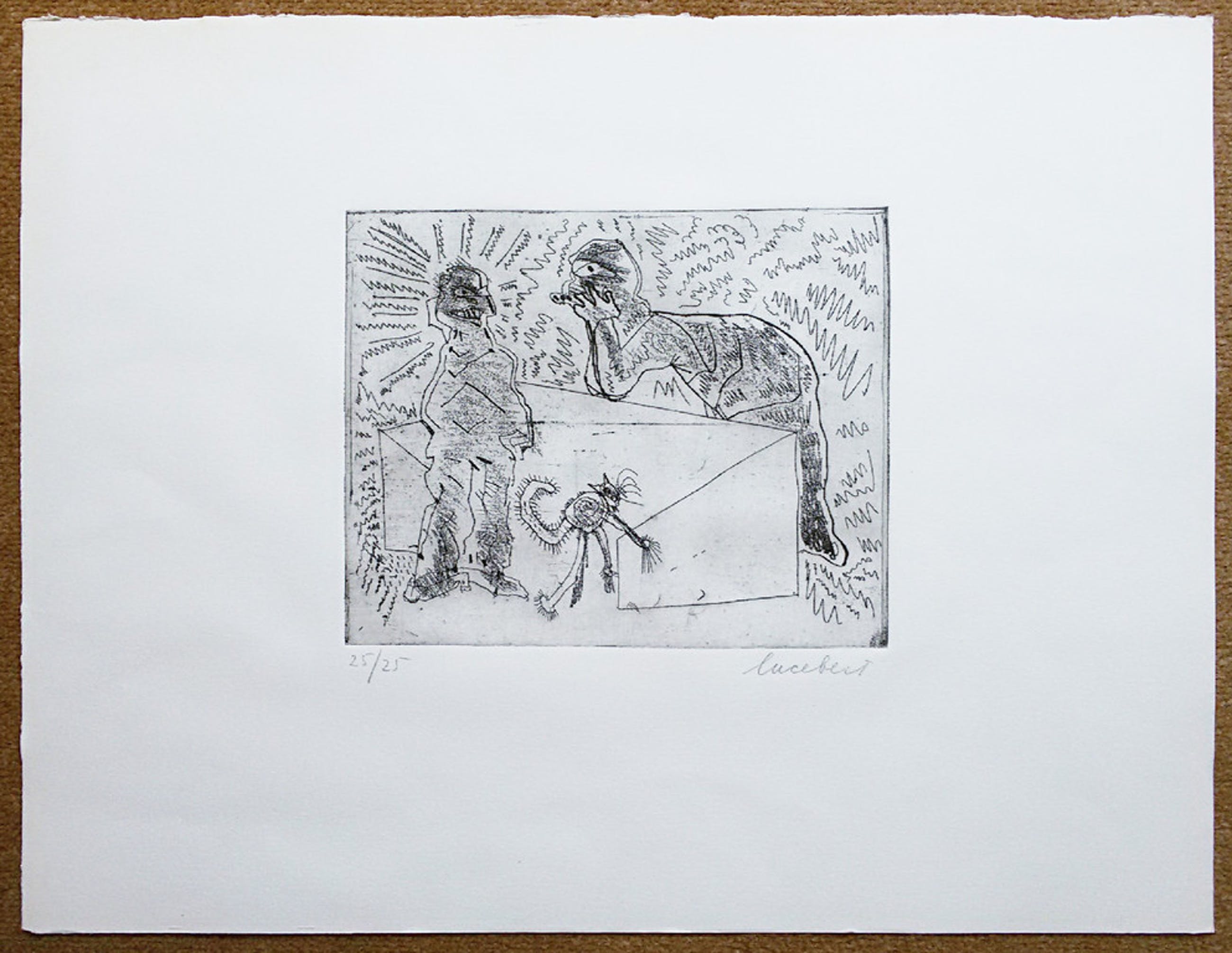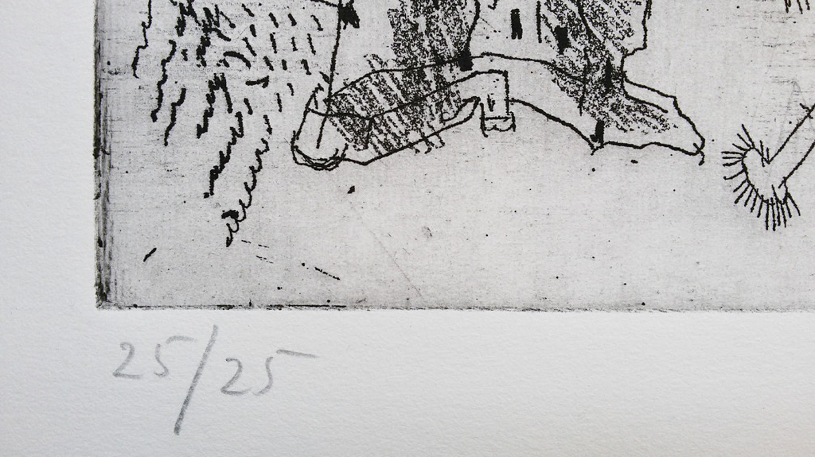 Karakteristieke, zeldzame ets van Lucebert. Met potlood gesigneerd en genummerd (25/25). In uitstekende conditie; etsbeeld in mint conditie, alleen hele lichte verkleuring aan de uiterste randen van het blad linksboven.