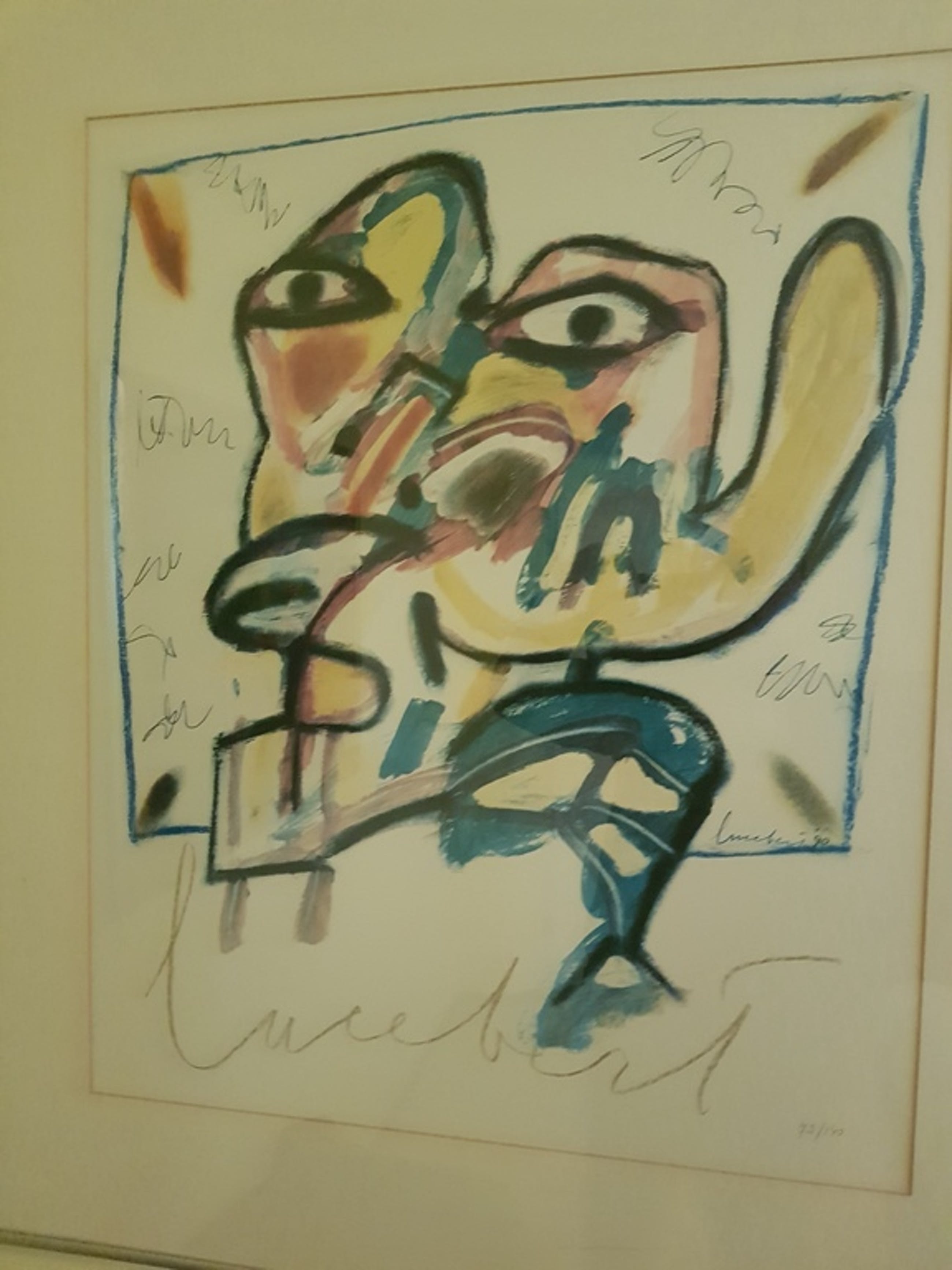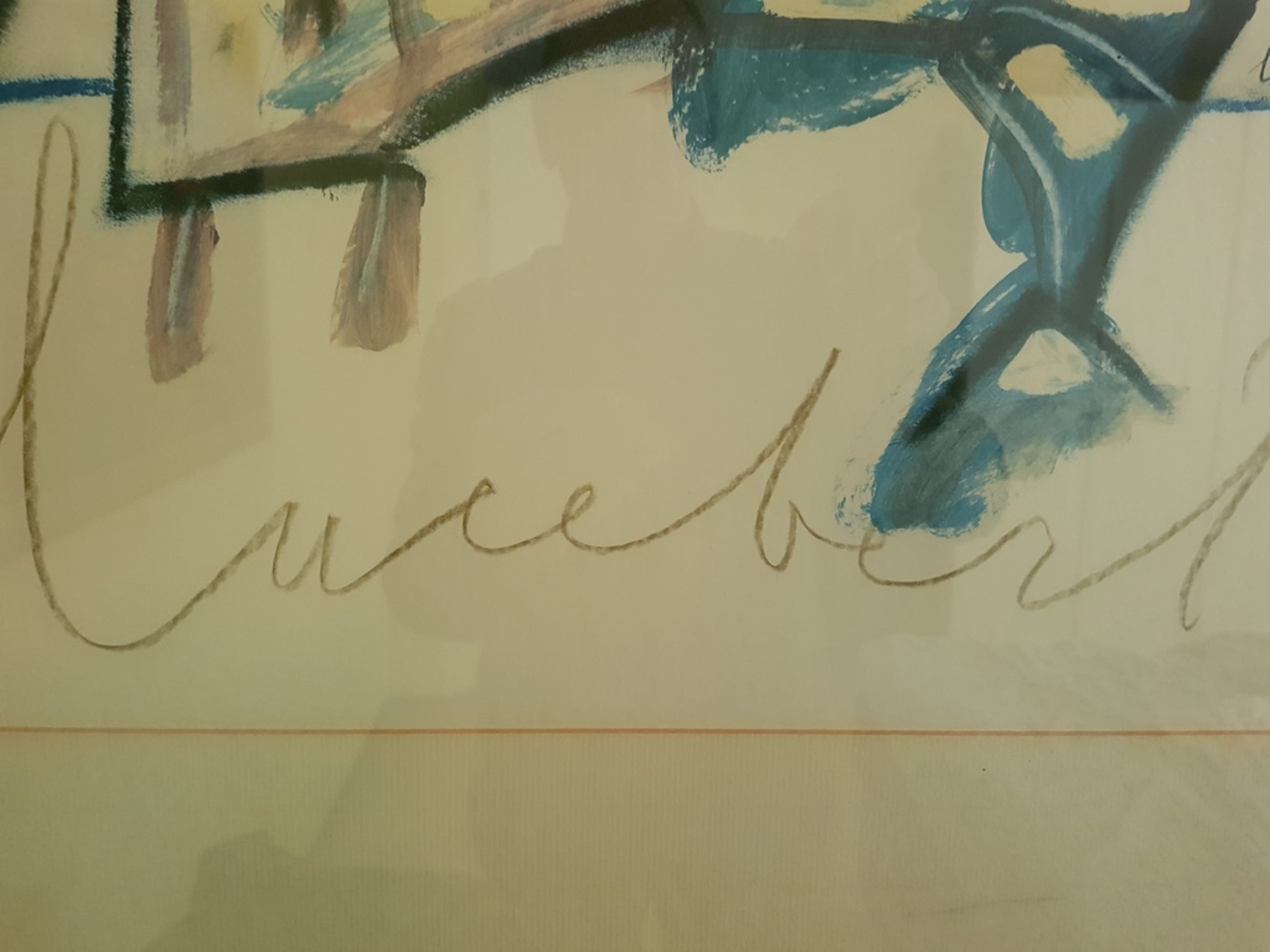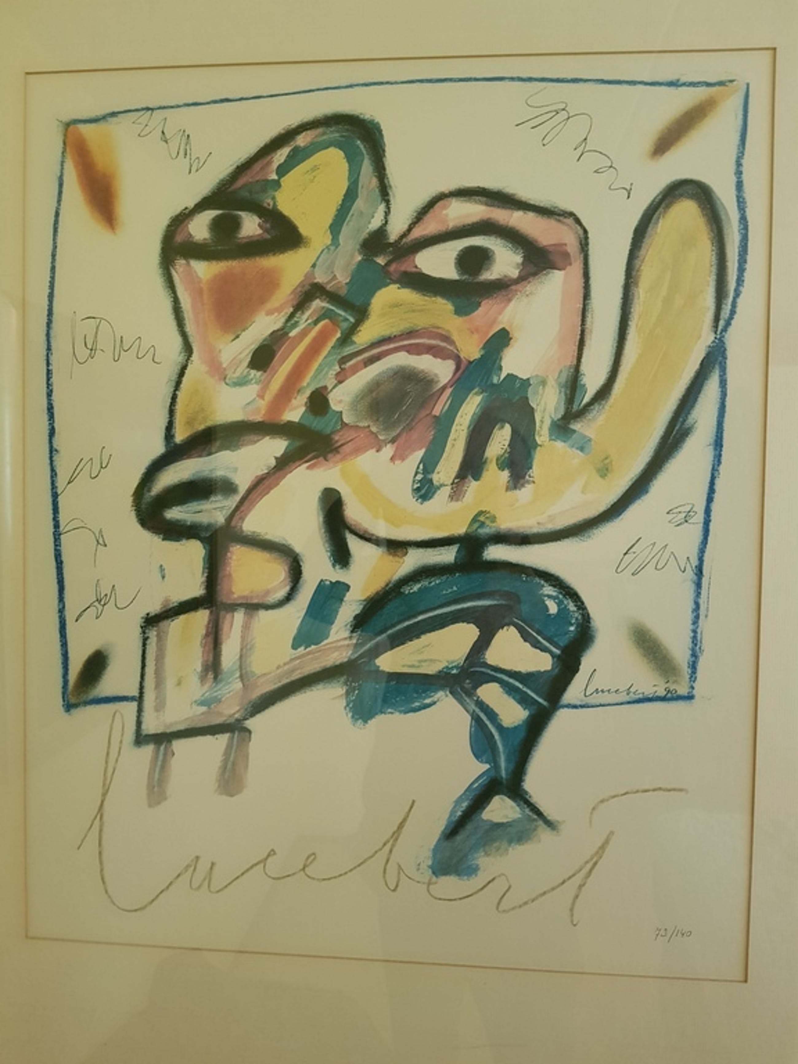 Ingelijst achter passe-partout en glas. Mooie heldere getinte kleuren. Sorry de foto komt zonder flits wat geel over, uiteraard een witte lichte heldere zeefdruk Lucebert (uitspraak: loetsjbert, pseudoniem van Lubertus Jacobus Swaanswijk (Amsterdam, 15 september 1924 Alkmaar, 10 mei 1994) was een Nederlands dichter en schilder. Als dichter werd hij gezien als de voorman van de beweging van de Vijftigers, een progressieve groep dichters die na de Tweede Wereldoorlog begon te experimenteren met vorm en inhoud. Als schilder was hij nauw betrokken bij de Amsterdams poot van de experimentele Cobra-groep.