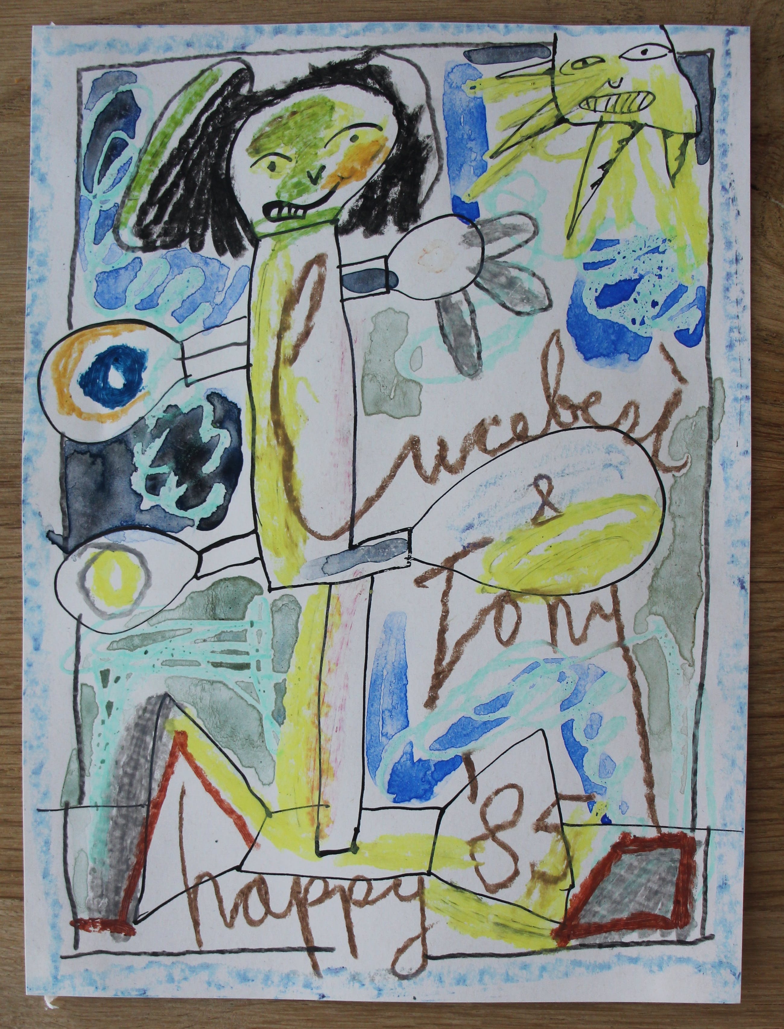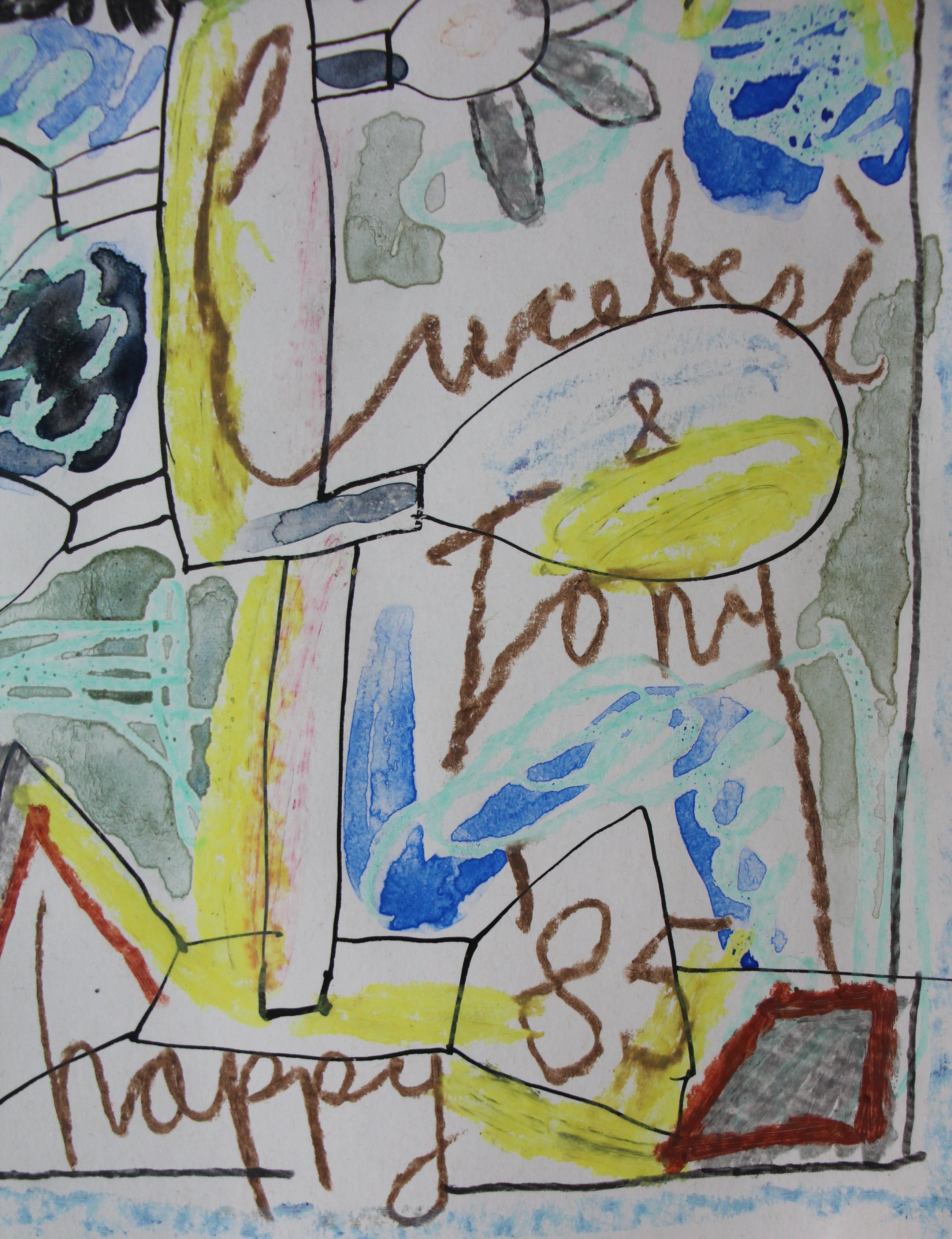Met de hand bewerkte litho van Lucebert. Het betreft een nieuwjaarskaart voor 1985. Afmetingen werk: H22 x b 16,3 cm. Het werk is linksonder gesigneerd: "Tony & Lucebert. De authenticiteit van het aangeboden werk wordt volledig gegarandeerd. Een certificaat van echtheid kan, op aanvraag, worden gemaild.