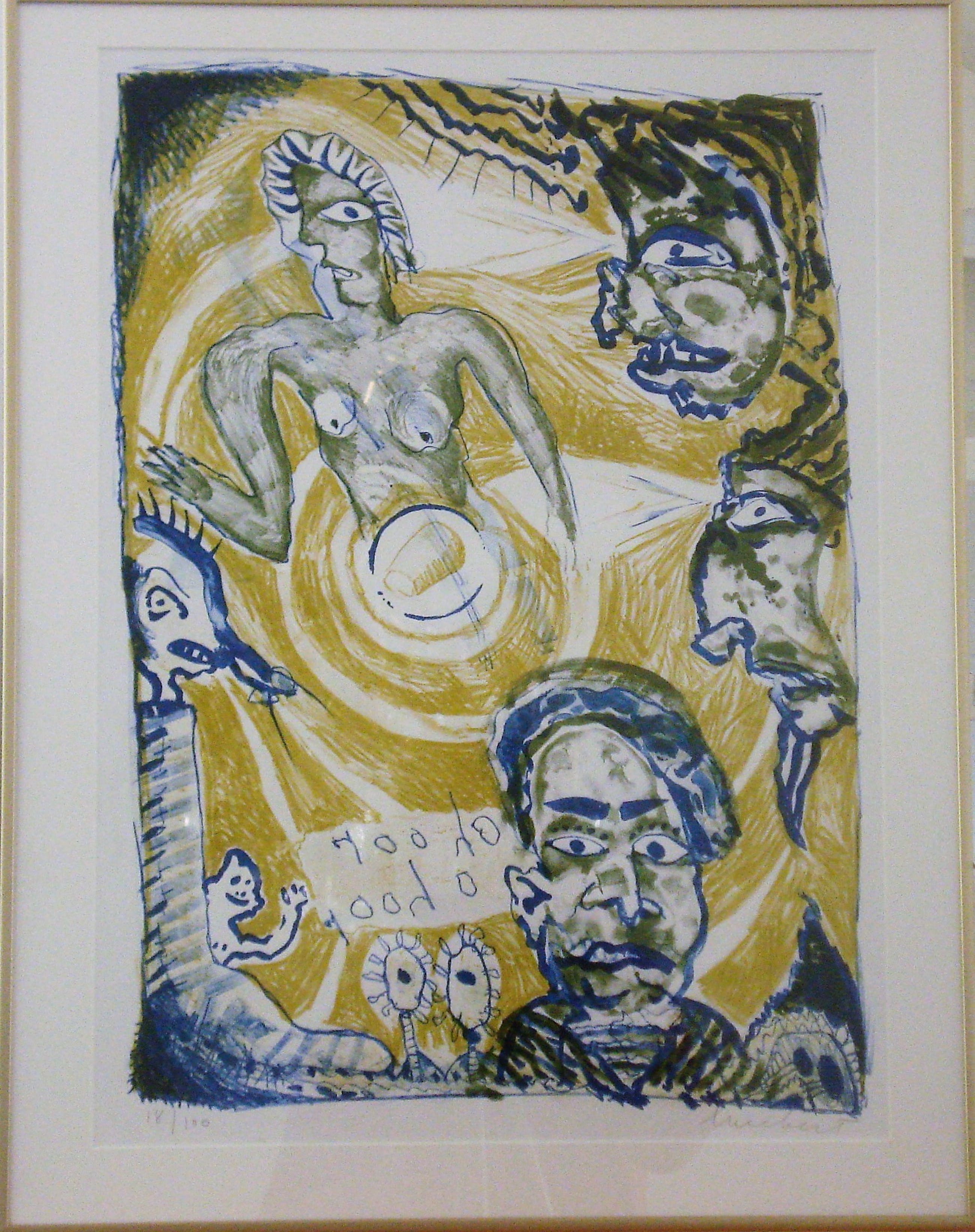 Lucebert (1924 –1994) was als dichter betrokken bij de Vijftigers, die na WO II in hun gedichten experimenteerden met vorm en inhoud. Als schilder nam hij deel aan de Cobra-beweging. Aanvankelijk gebruikte Lucebert de kinderlijke beeldtaal van de Cobra-schilders. In deze prent hebben de menselijke wezens echter een cartoonachtig uiterlijk gekregen dat wordt benadrukt door de zware omtreklijnen en de grimmigheid van de koppen. Draai de in spiegelschrift geschreven tekst om en er staan de raadselachtige woorden: ‘ O hoor, o hoor.’ De betekenis hiervan moeten we er volgens de kunstenaar zelf in leggen.