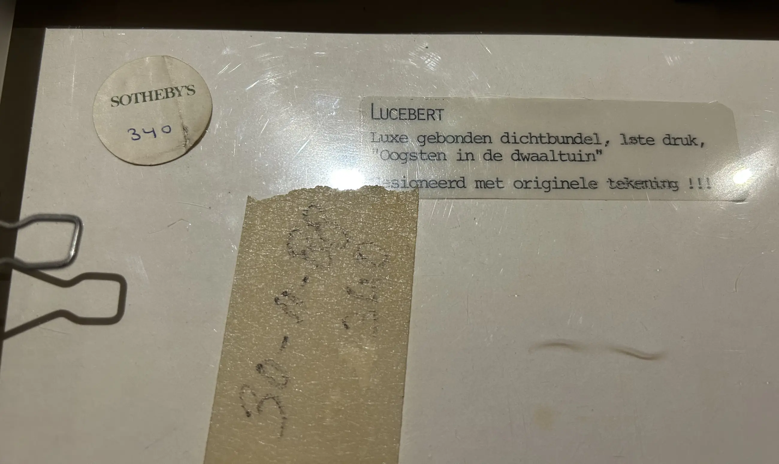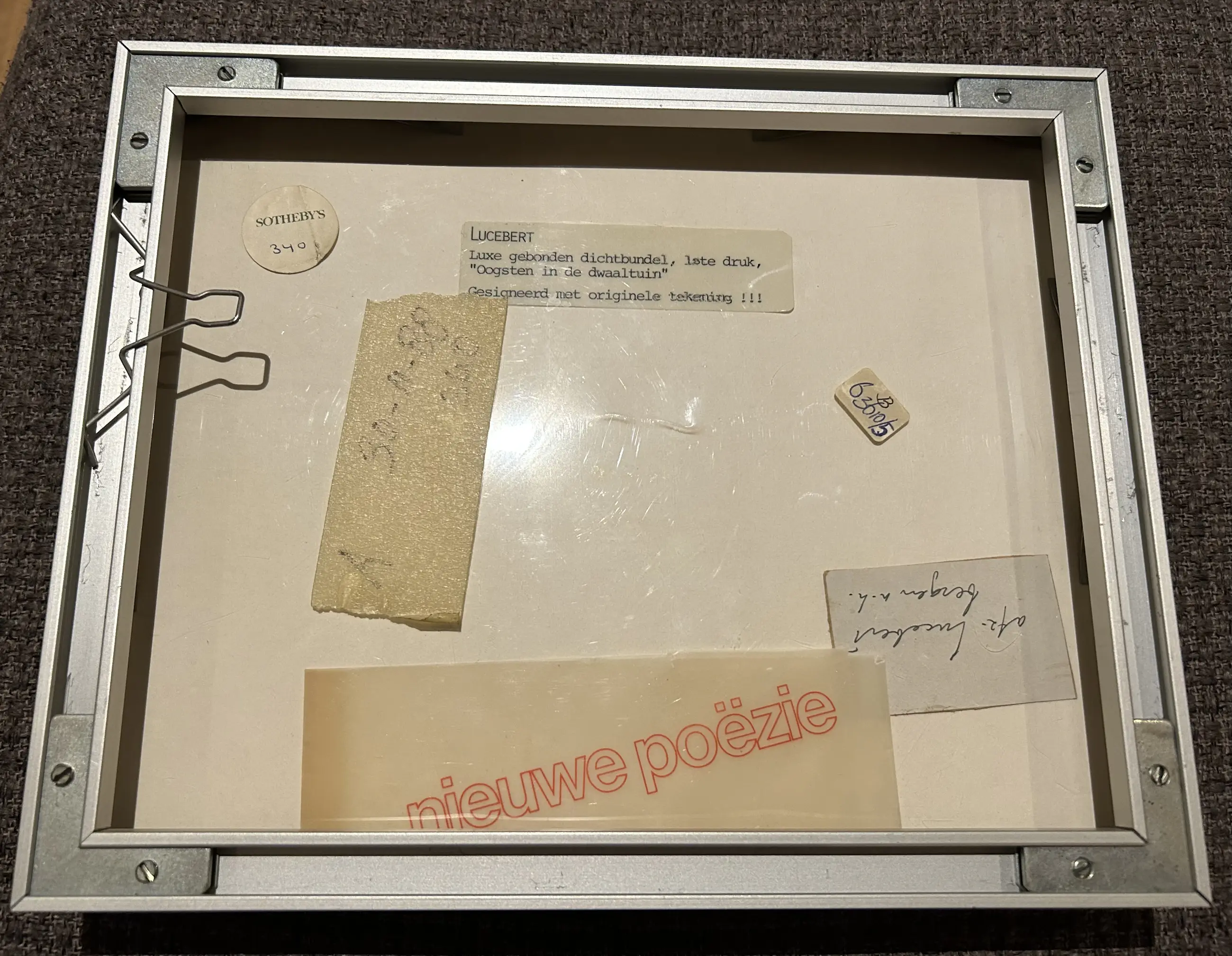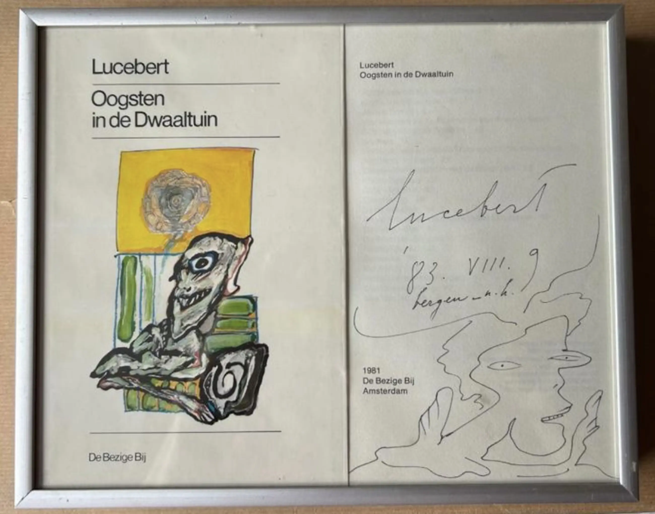Ingelijste dichtbundel van Lucebert met originele pentekening.